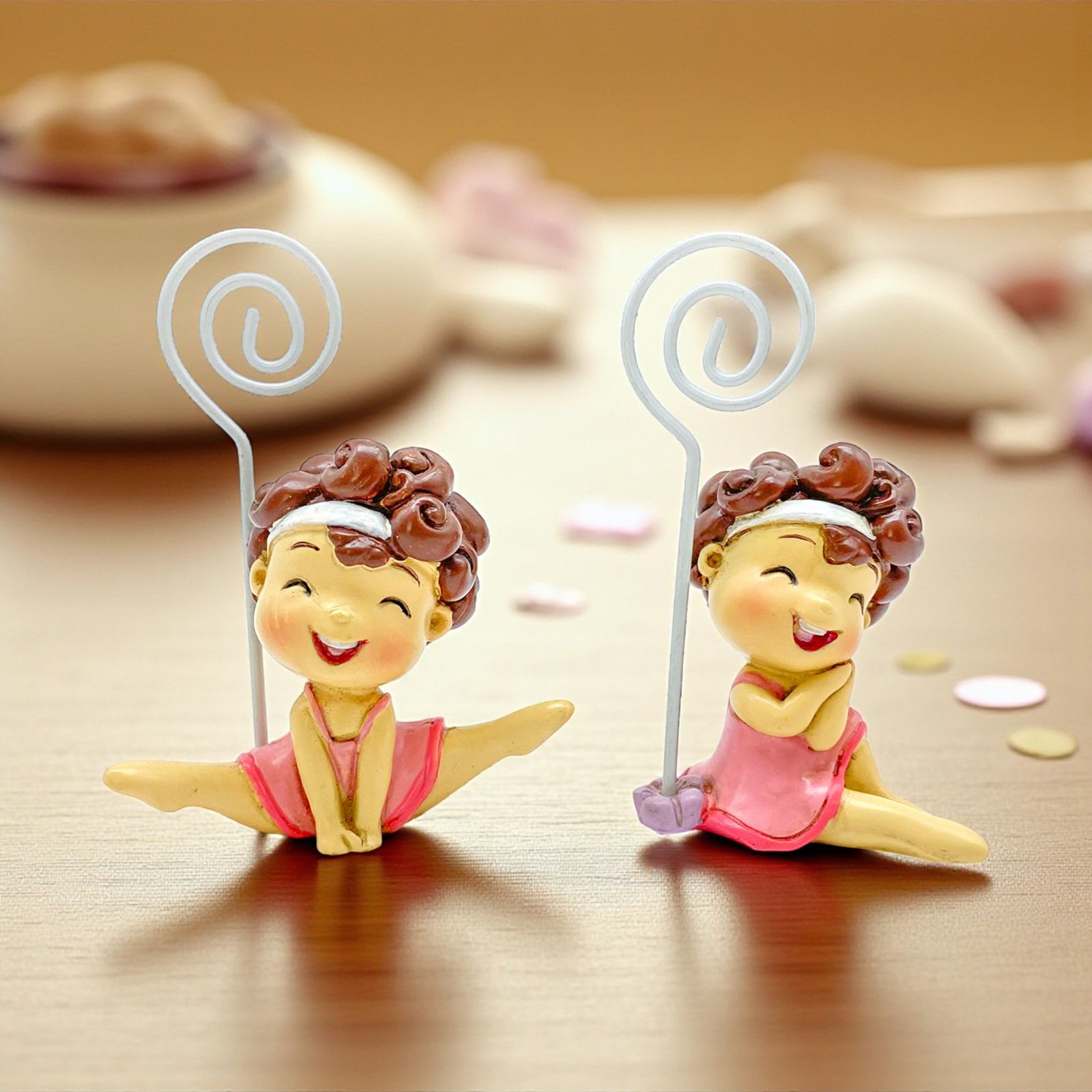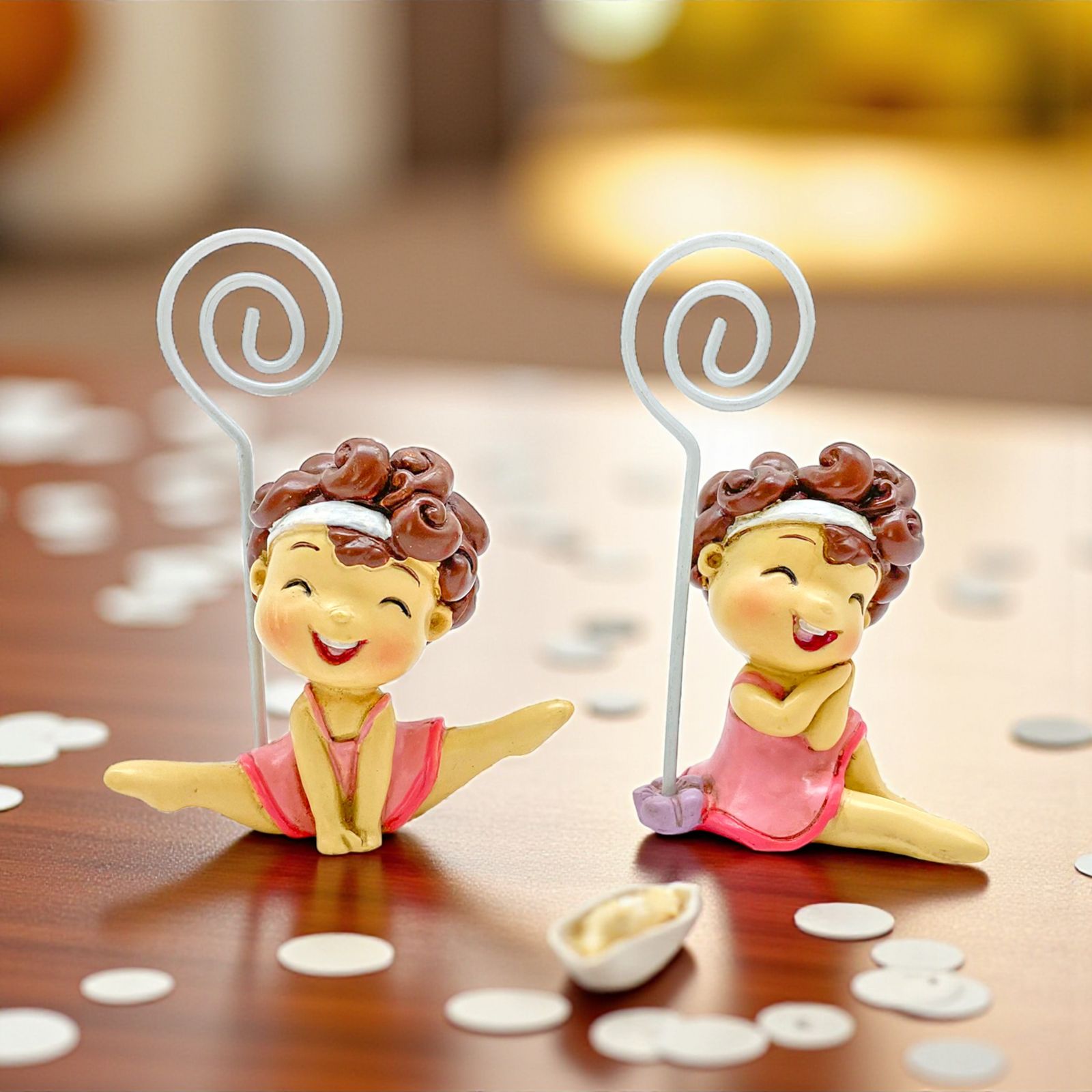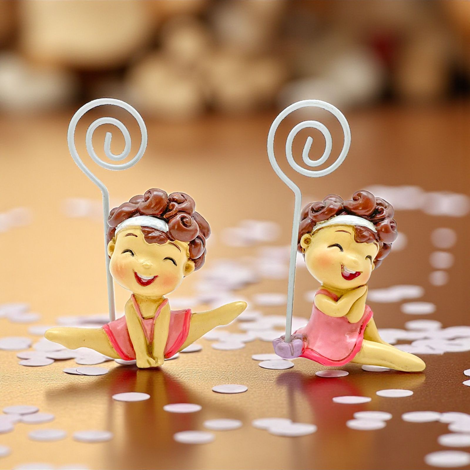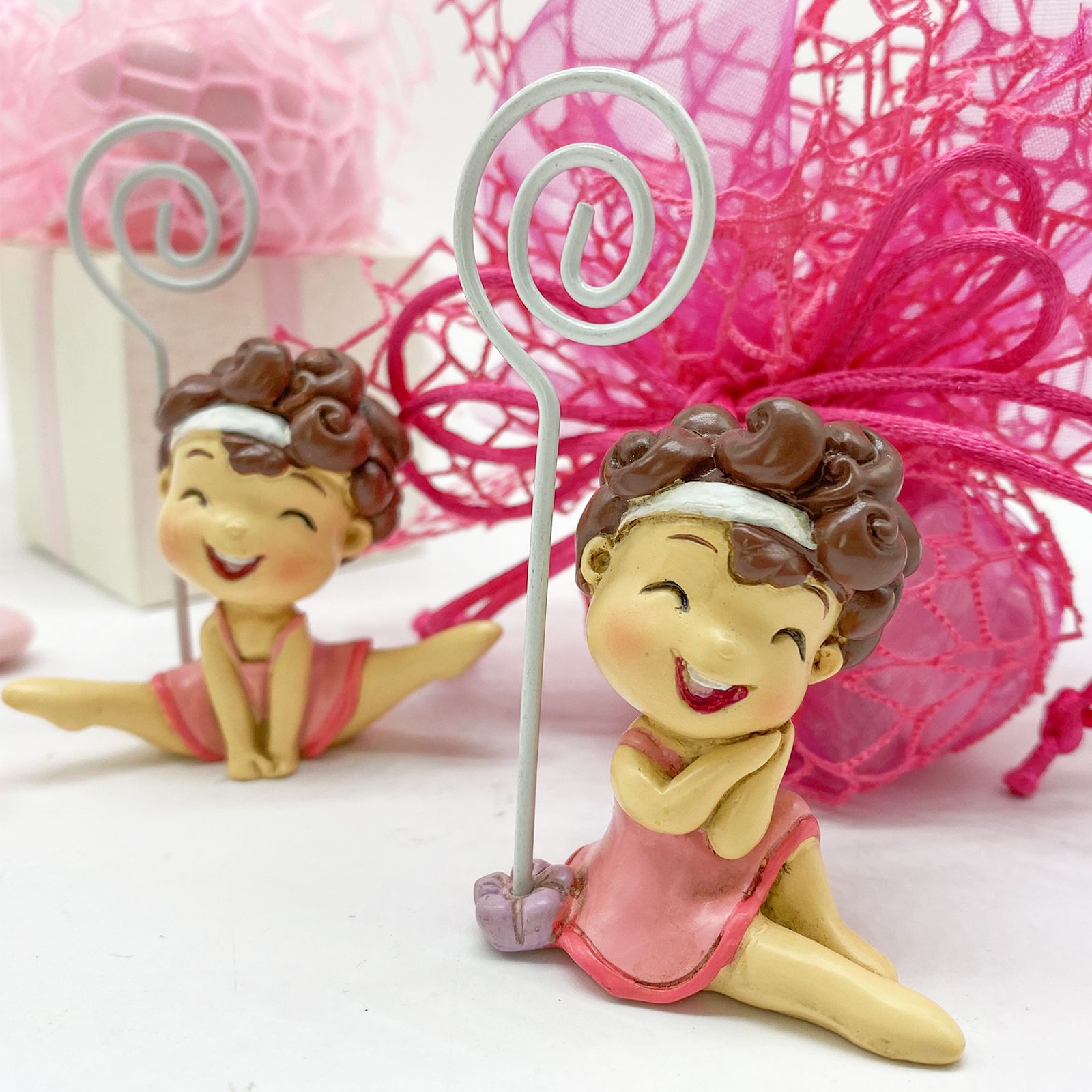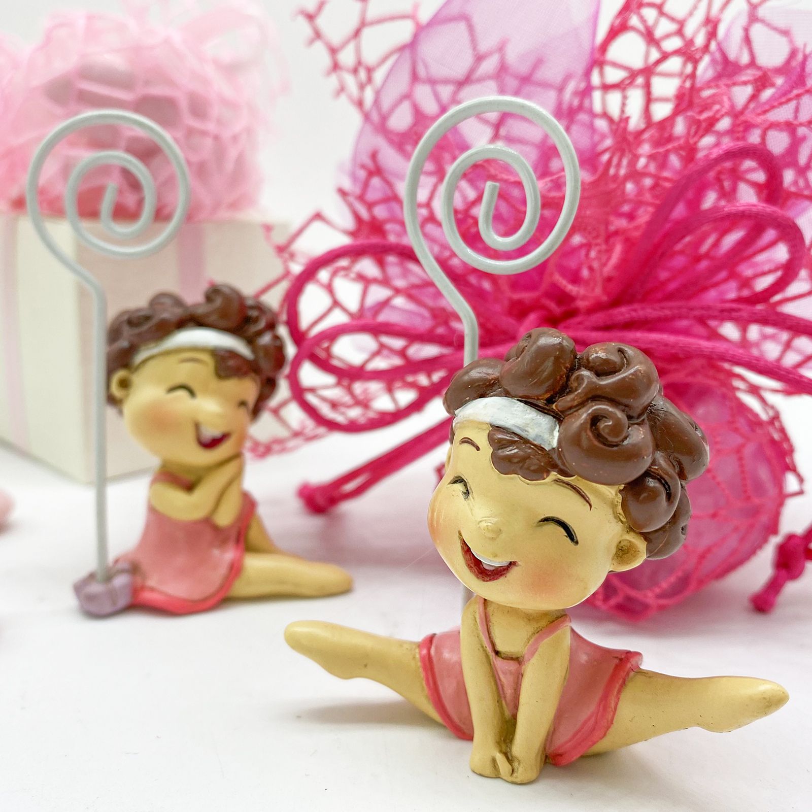 Si tratta di un regalo economico adatto a bambine, un memo clip porta foto o porta bigliettini appunti con asta in metallo bianco dalla parte superiore a forma di spirale. La base di questa bomboniera è decorata con una ginnasta sorridente ed emozionata, disponibile in due posizioni diverse, entrambe con una graziosa fascia per i capelli e un vestito rosa come da foto.