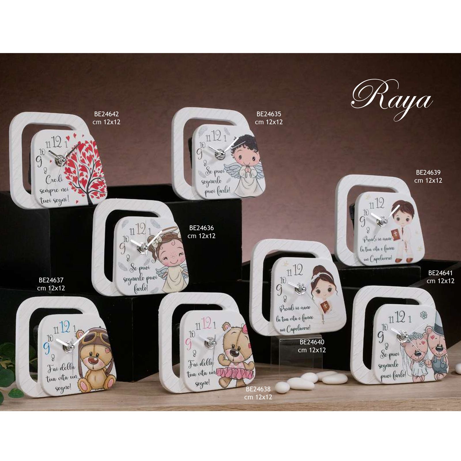 Realizzato in pregiata polvere di marmo di Carrara, questo orologio è un regalo unico che unisce bellezza e utilità. La Linea Raya Dolcicose offre una selezione di disegni teneri, tra cui orsetti per matrimoni, bambini e bambine per la prima comunione, angioletti in versione maschile e femminile, alberi con cuori e adorabili orsetti aviatori. Ogni orologio è arricchito da frasi significative, creando un regalo che rimarrà nel cuore di chi lo riceve.