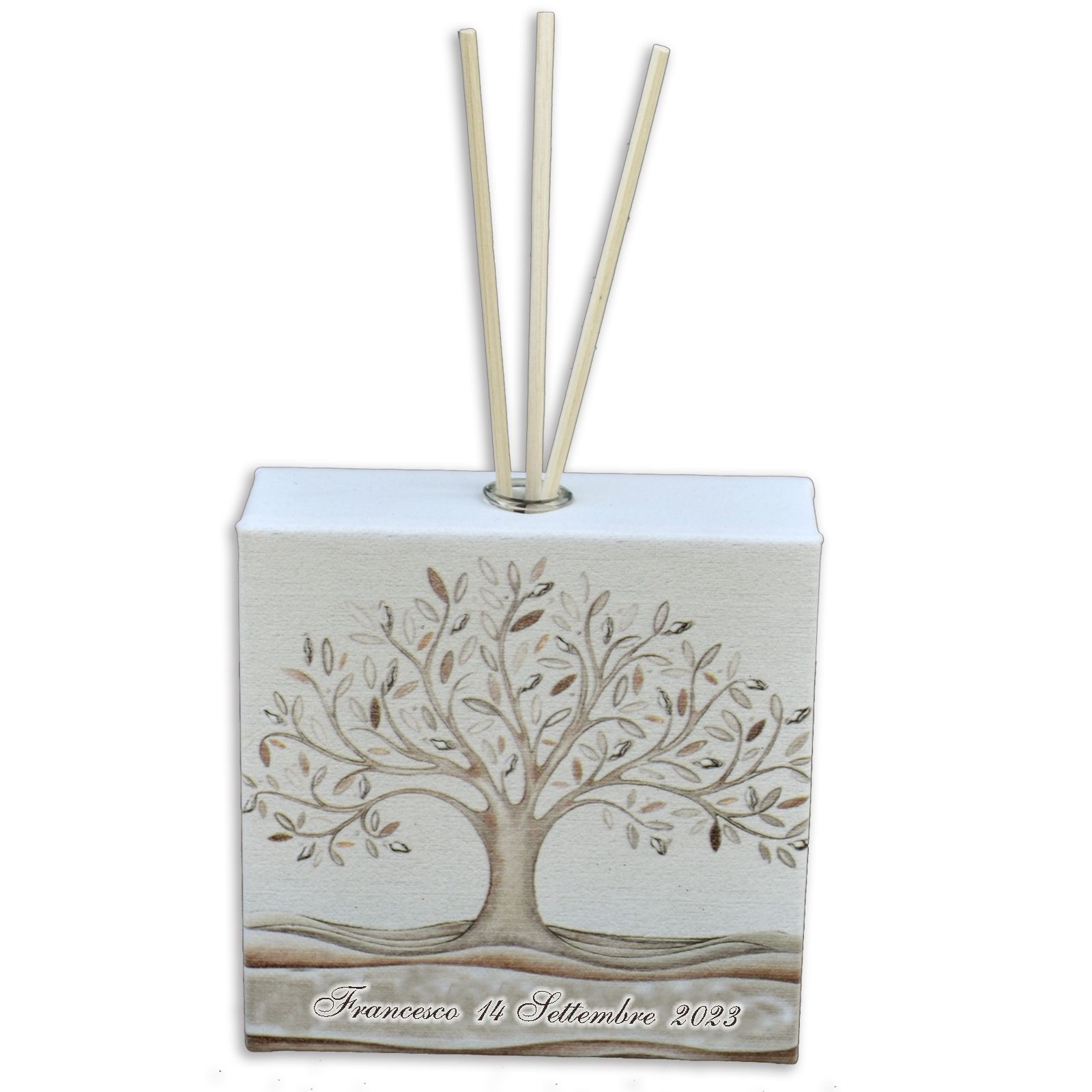 Crea ricordi profumati del tuo giorno speciale con la nostra bomboniera matrimonio: un elegante profumatore in ecopelle bianca con un incantevole albero della vita stampato, completamente personalizzabile con i tuoi nomi e la data del matrimonio.