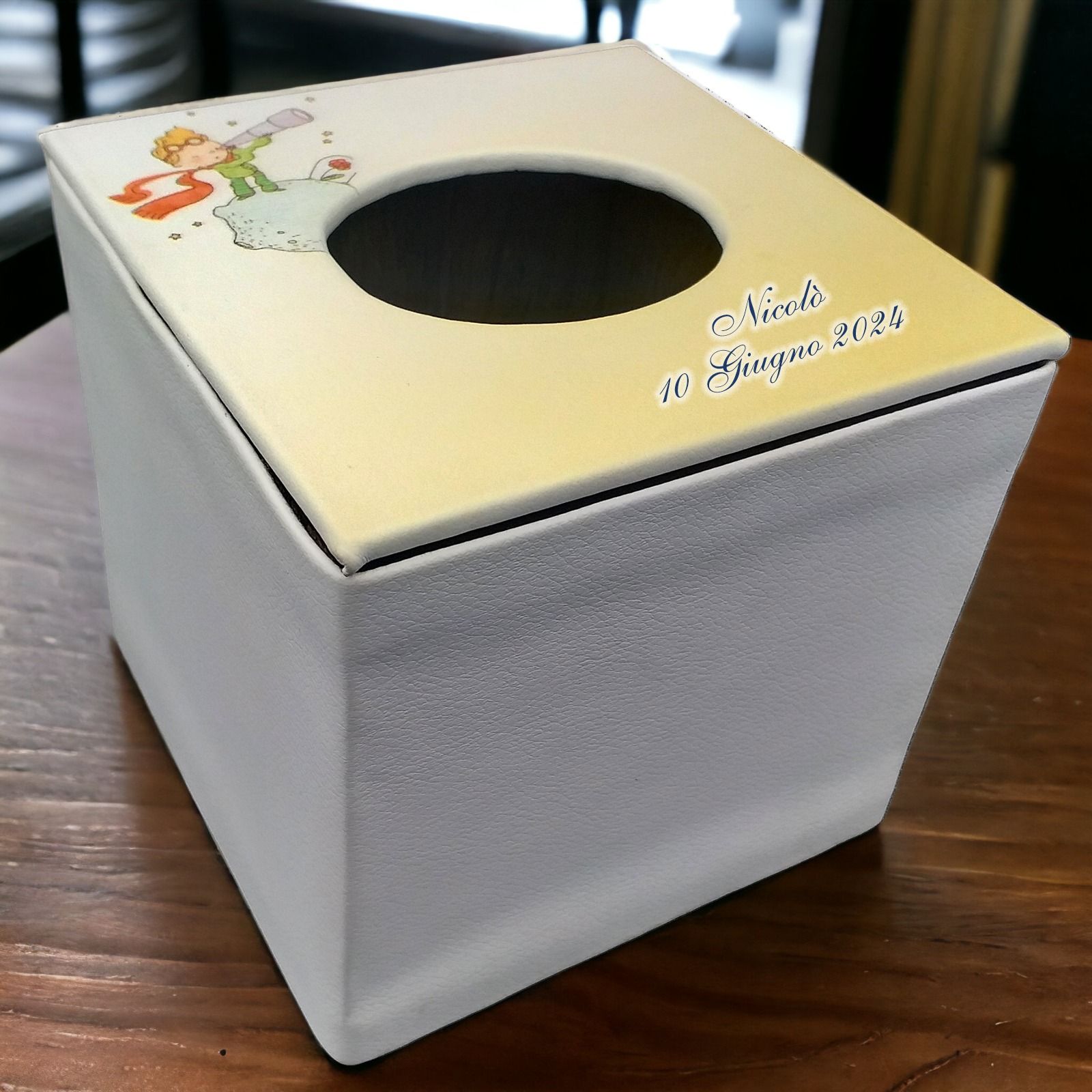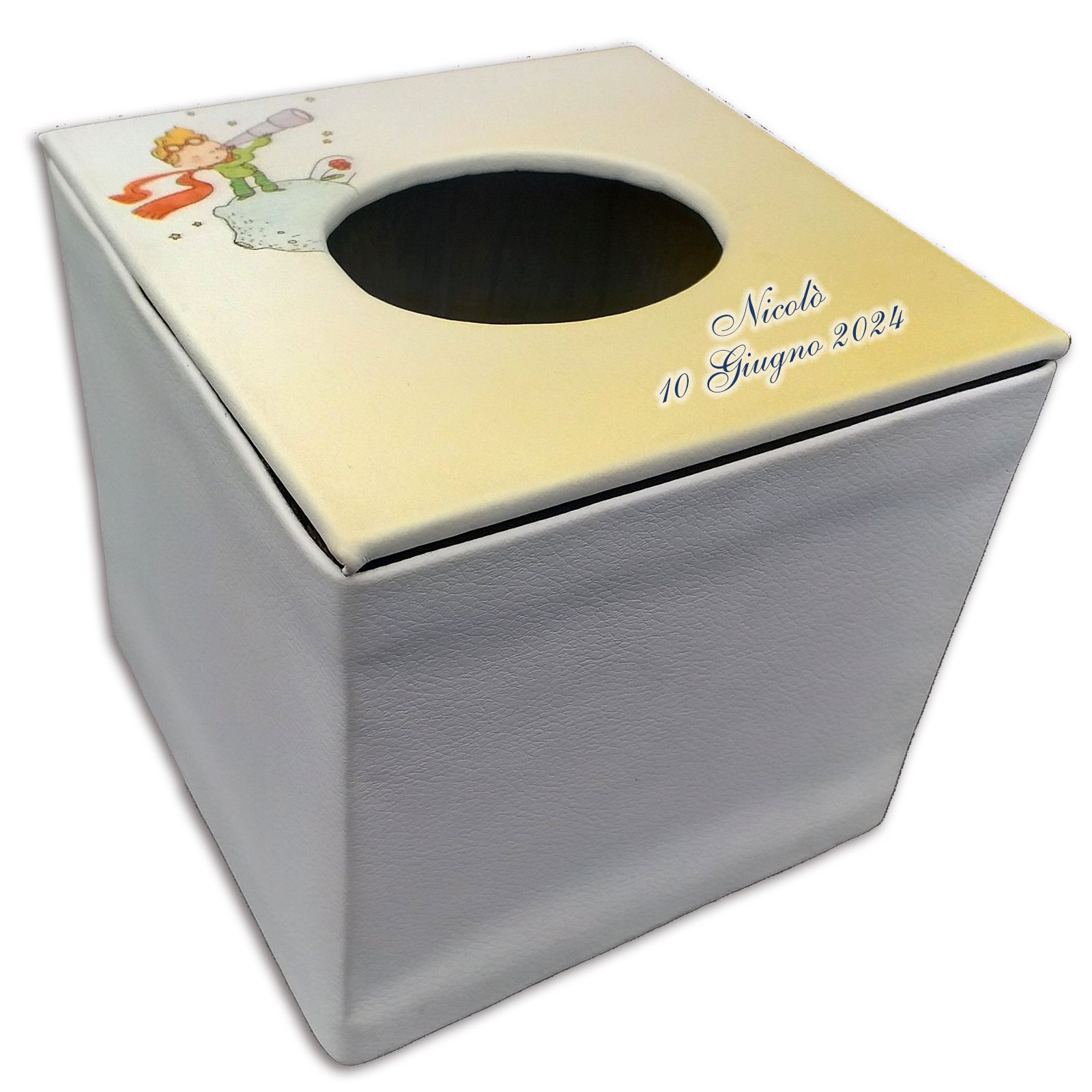 Il nostro esclusivo porta salviettine in ecopelle bianca, con un'incantevole stampa raffigurante il Piccolo Principe, è un'idea originale e personalizzabile per eventi speciali come battesimi e comunioni.