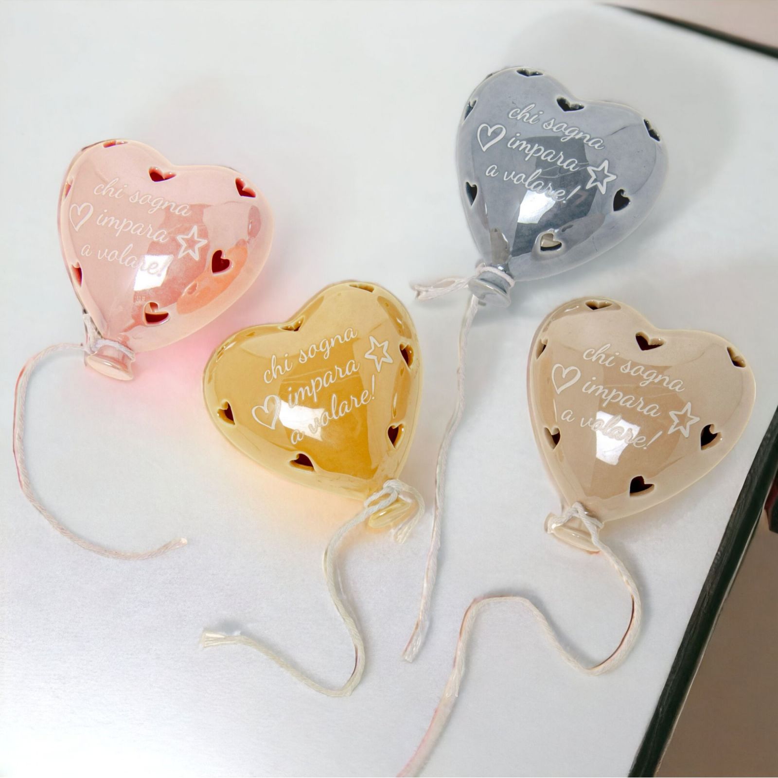 Regala un sorriso con la nostra lampada led palloncino colorati con frasi "chi sogna impara a volare". Un regalo davvero originale ed unico per i tuoi cari, perfetto per tutti gli eventi come battesimo, matrimonio, compleanno, prima comunione, santa cresima e diciottesimo. Realizzata in ceramica, con una dimensione di 9 cm circa, disponibile in diversi colori assortiti come blu, rosa gold, giallo e tortora. La lampada led palloncino è una scelta di stile che renderà unica la tua bomboniera, regalando un tocco di classe ed eleganza.