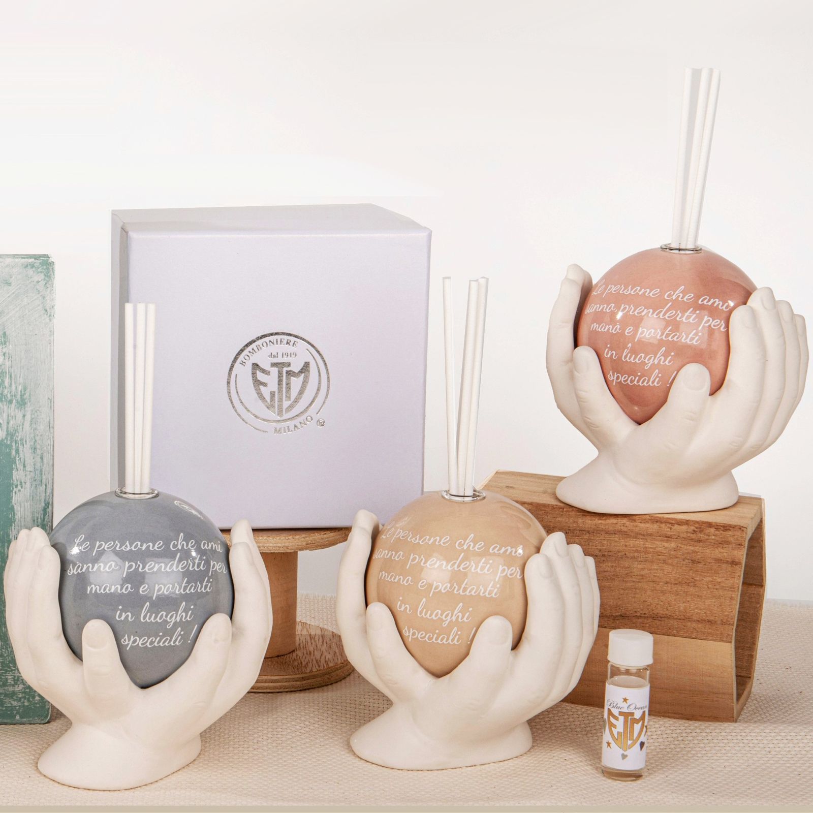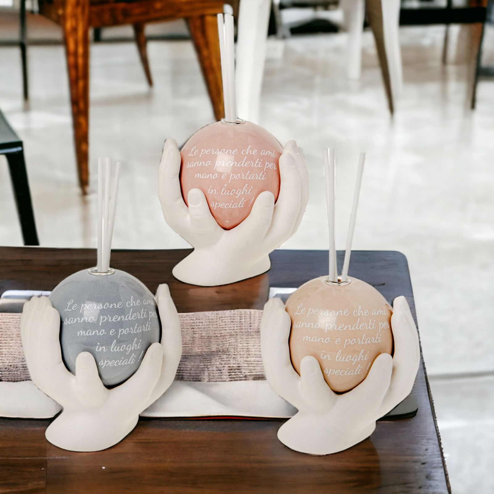 Regala un'emozione con un tocco di originalità! Il profumatore ambiente con mani che sorreggono una sfera con frase "le persone che ami sanno prenderti per mano e portarti in luoghi speciali!"è un'idea regalo originale e unica per tutte le occasioni speciali come prima comunione, matrimonio, compleanno, santa cresima.