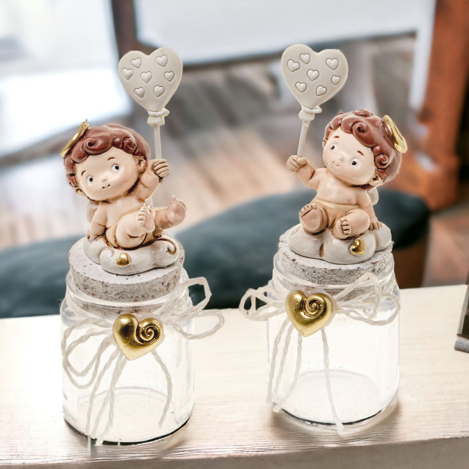 Barattolino con Statuina angioletto con cuoricino a palloncino, linea Dolcino, perfetta come bomboniera per eventi come comunione, battesimo, primo compleanno, feste tema angioletti, cresima e periodo natalizio. Realizzata con resina e vetro con dettaglio oro e misura circa 13 cm. Ideale anche come segna posto, sarà un regalo ricco di significato ed elegante.