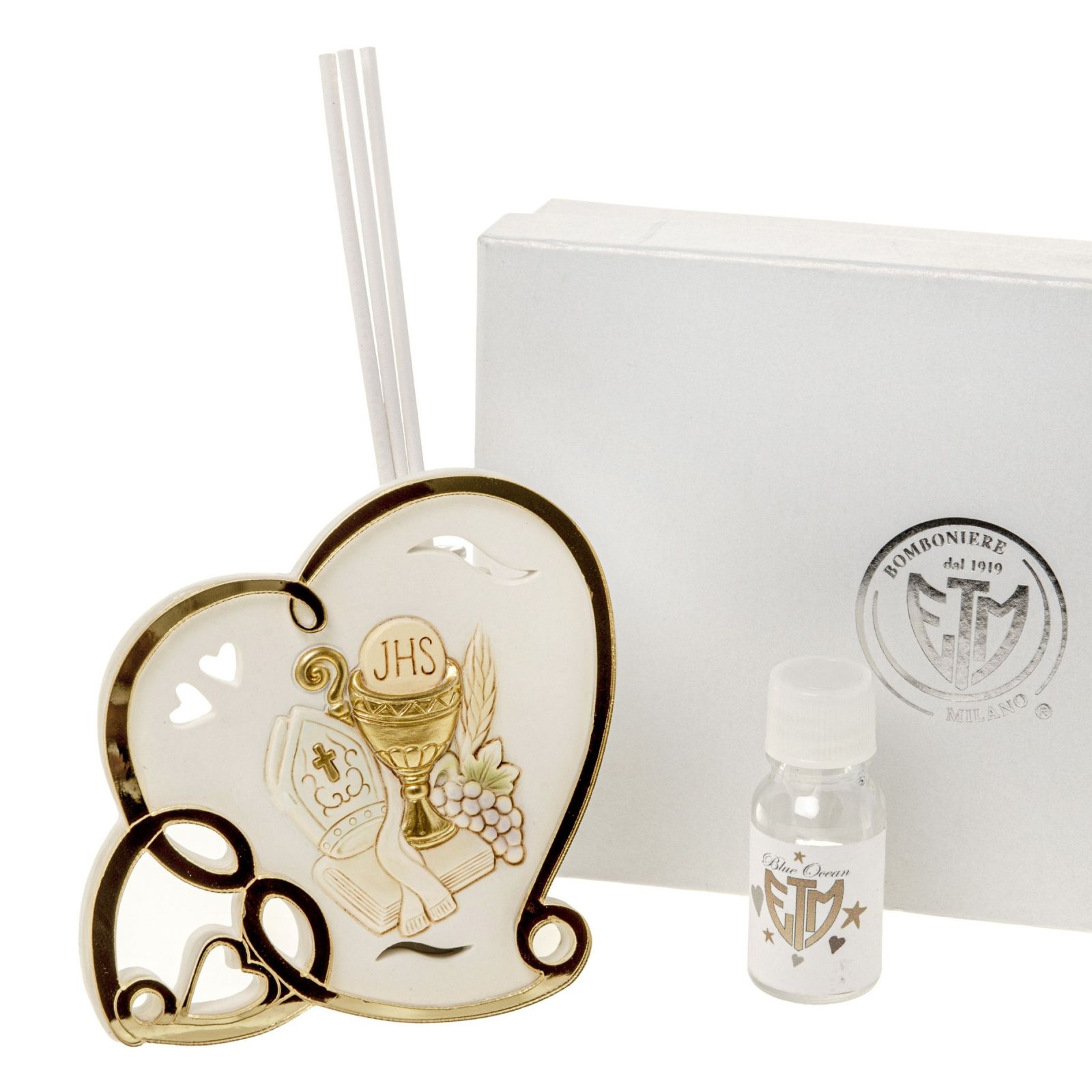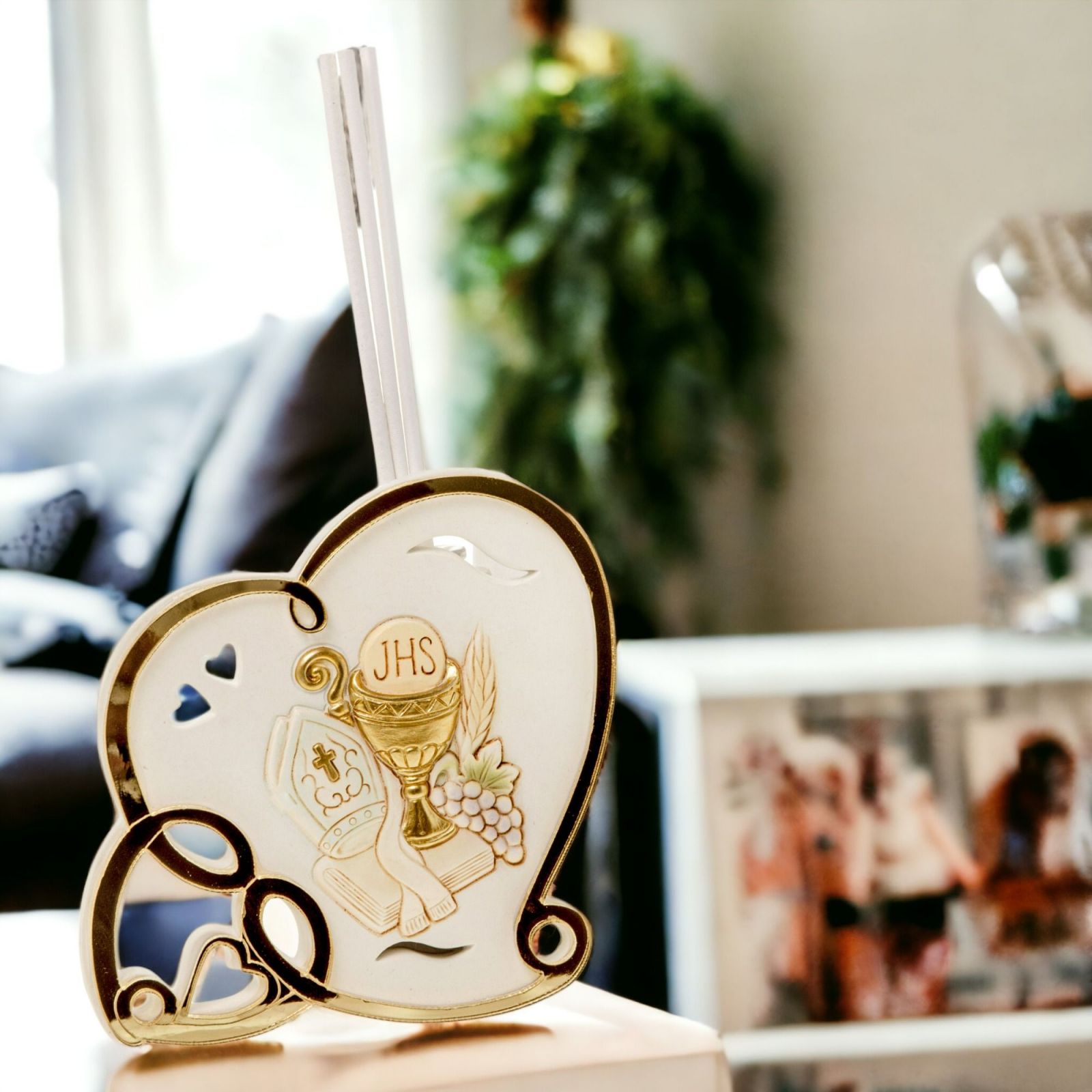 Regala un profumatore ambiente unico ed esclusivo a forma di cuore con i simboli sacri della Prima Comunione e della Santa Cresima. Un'icona artistica che rappresenta la religione, i sacramenti e la spiritualità. Il cuore è realizzato in resina e acrilico bianco con bordi color oro, ed è alto 10 cm circa. Ideale per celebrare due eventi speciali come la Comunione e la Cresima insieme. Una bomboniera sacra che comprende il calice, l'ostia, la mitra e la pastorale del vescovo. Un'idea regalo simbolica e di grande impatto, inclusa nella confezione una scatola regalo, bacchette ed essenza. Un dono che resterà nel cuore per molto tempo.