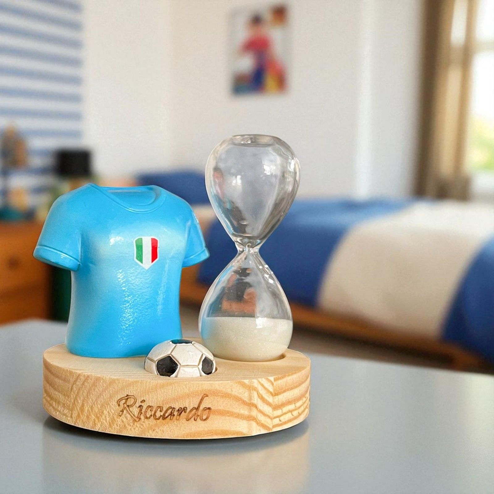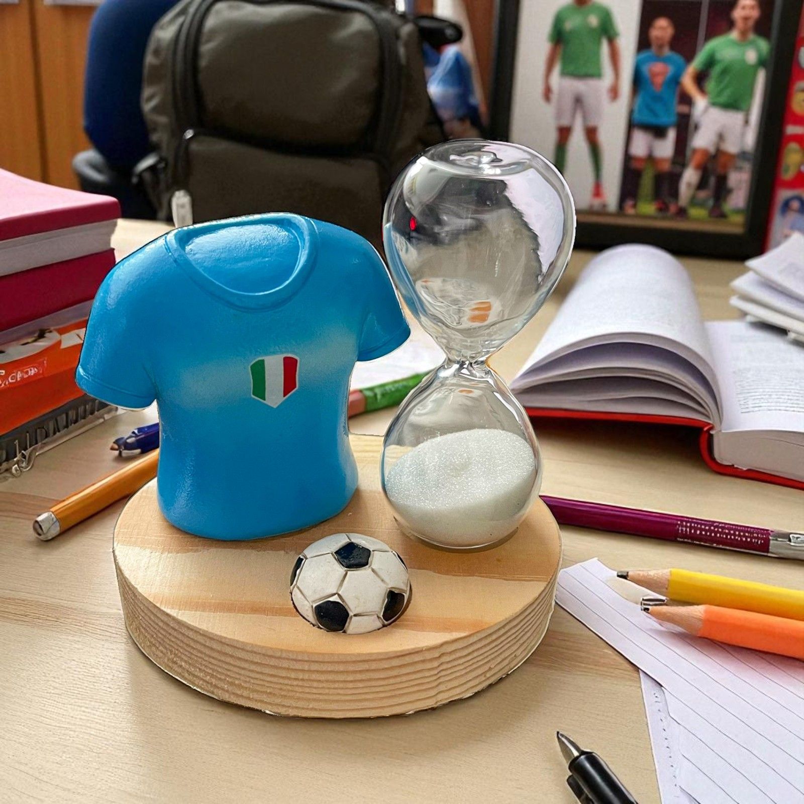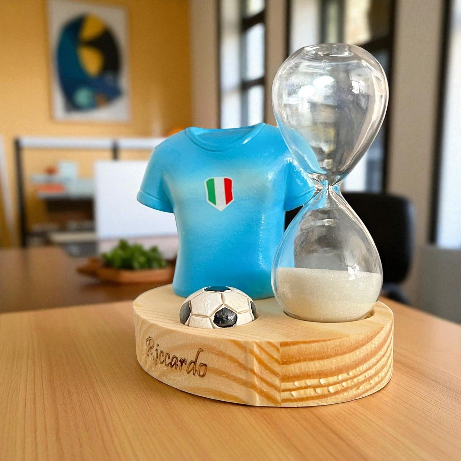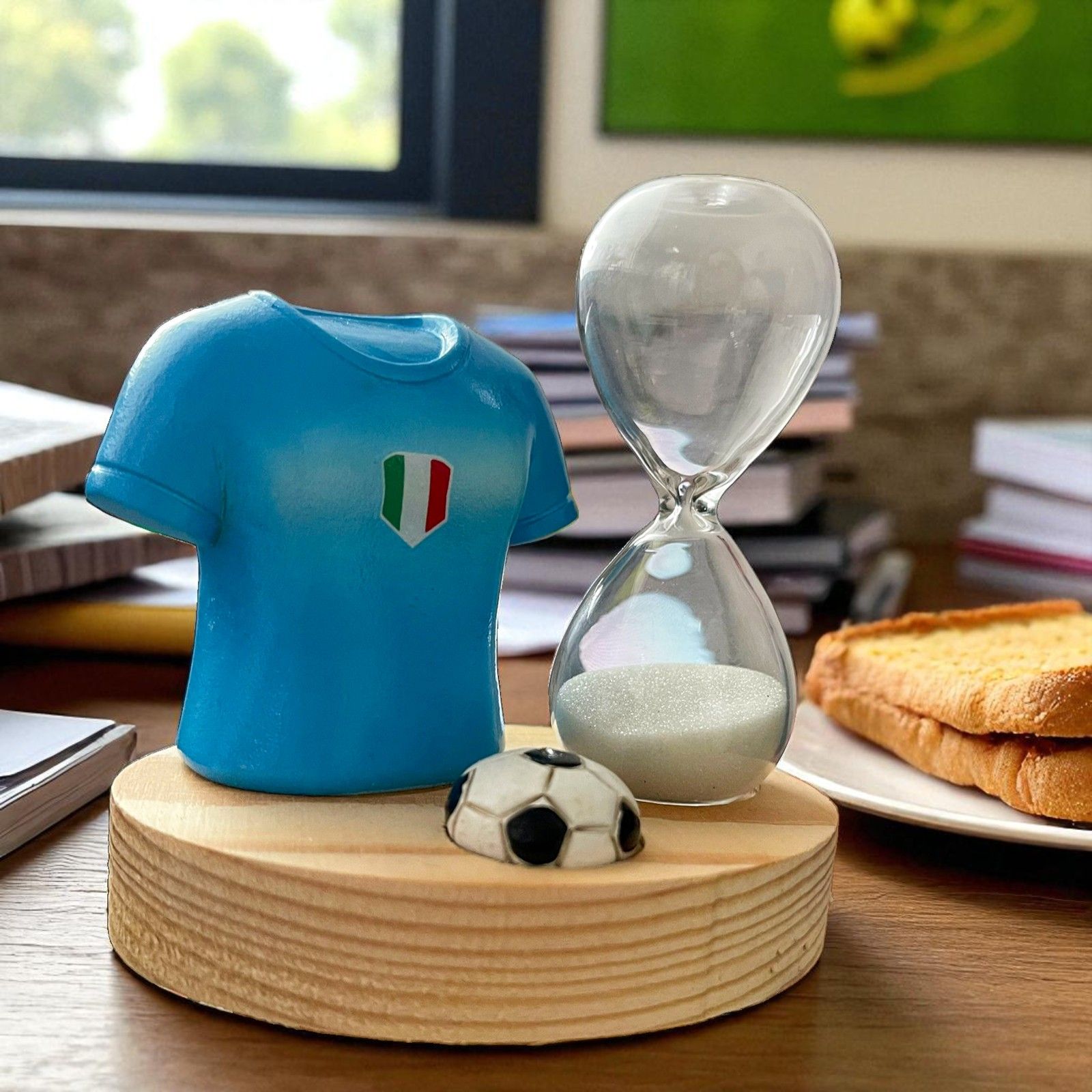 Realizzata in resina azzurra con base in legno naturale, questa bomboniera racchiude la passione sportiva in un design elegante. La maglietta della nazionale italiana, la clessidra con sabbia bianca e il pallone richiamano lo spirito di squadra e la bellezza del gioco. Le dimensioni compatte di 8 x 8 cm la rendono perfetta da esporre e conservare nel tempo.