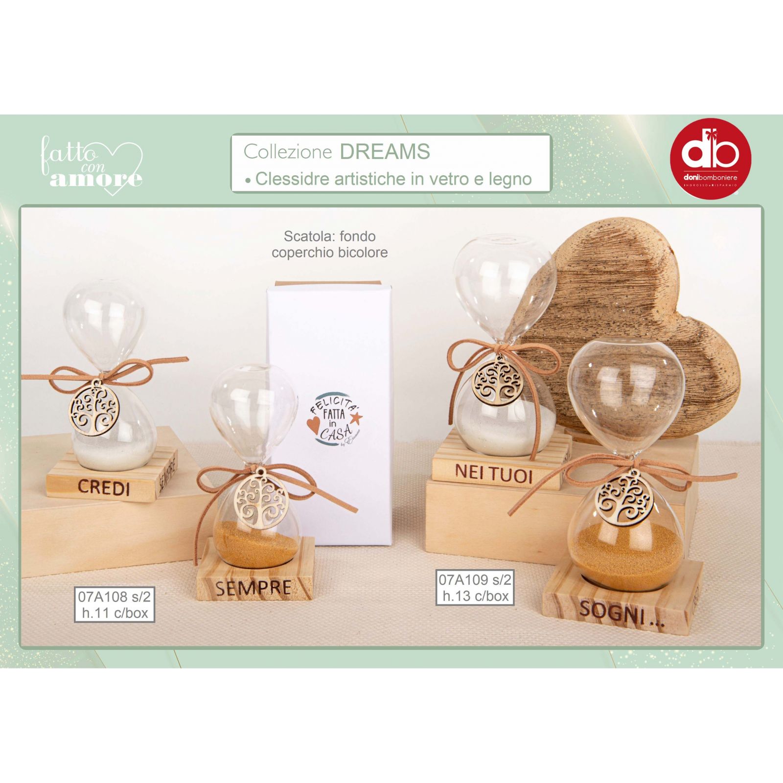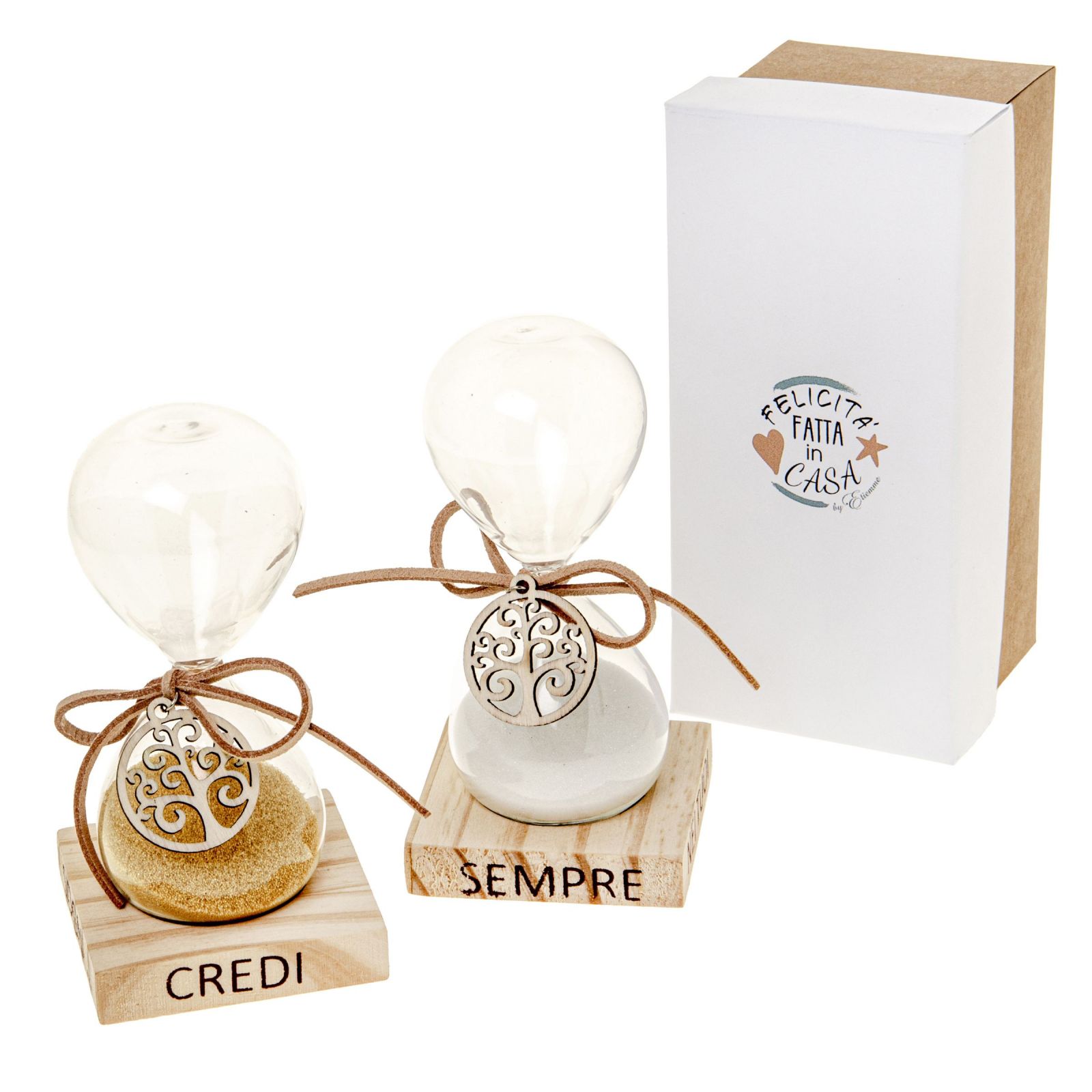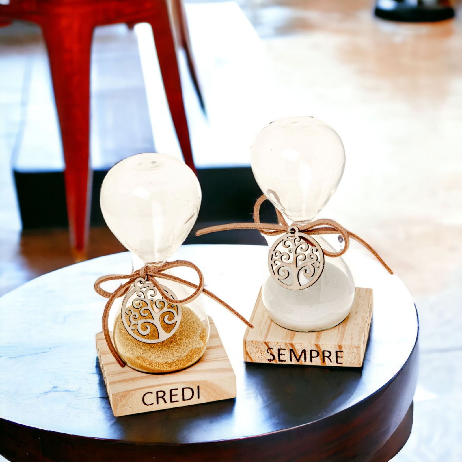 Regala una Clessidra "Credi Sempre nei tuoi Sogni" con albero della vita e sabbia assortita in due colori per celebrare un evento speciale! Questo prodotto è disponibile in due dimensioni Standard: h.11 circa e Grande h.13 cm circa, è realizzata in vetro con base in legno con scritta sui quattro lati "credi sempre nei tuoi sogni" e con colore della sabbia bianca o marroncino. Ideale per prima comunione, santa cresima, matrimonio, anniversario, promessa di matrimonio, questa clessidra è un simbolo di felicità, amore e radici solide. Un regalo che rappresenta una simbolo di rinascita e che verrà consegnato nella scatola regalo con scritta "Felicità fatta in casa" inclusa nel prezzo.