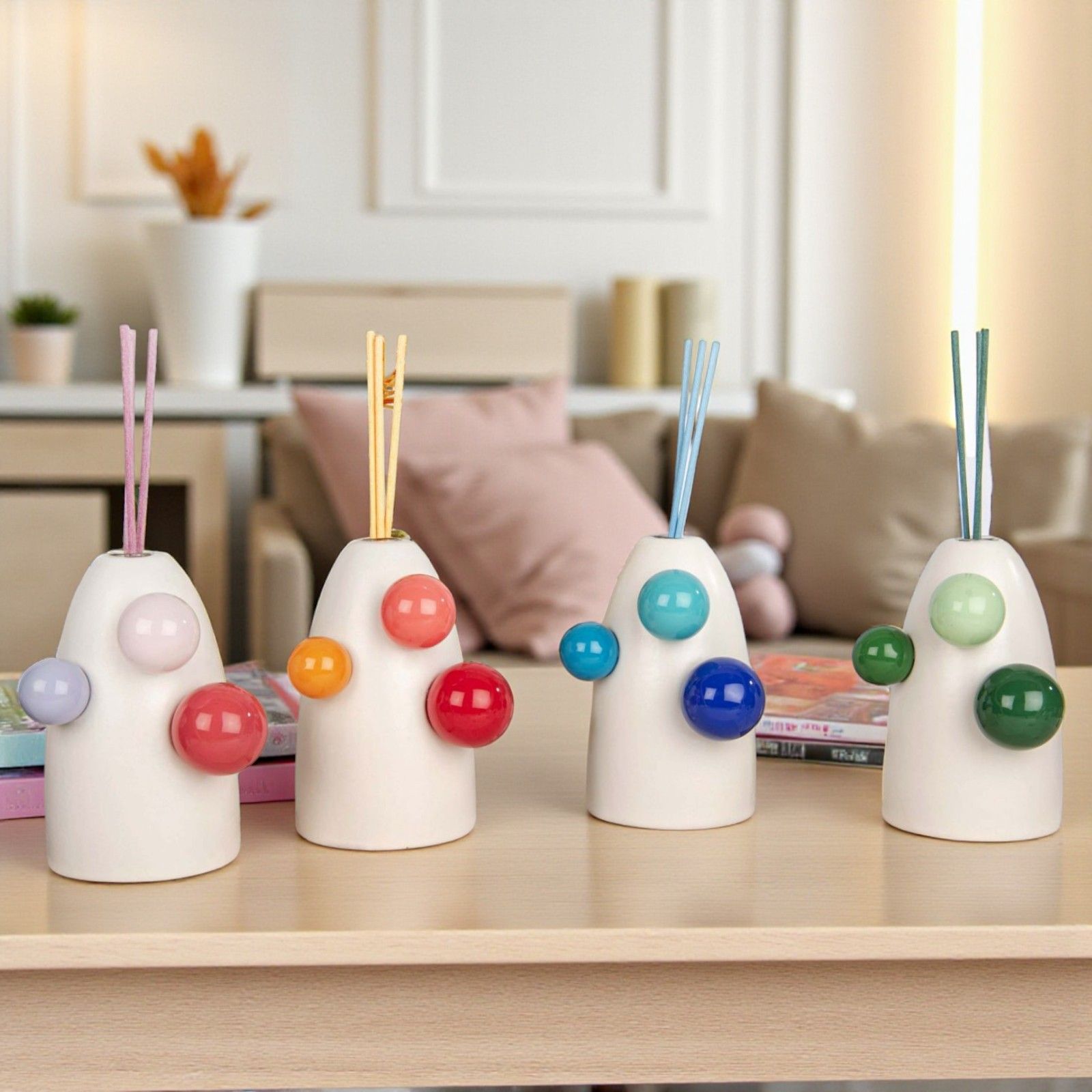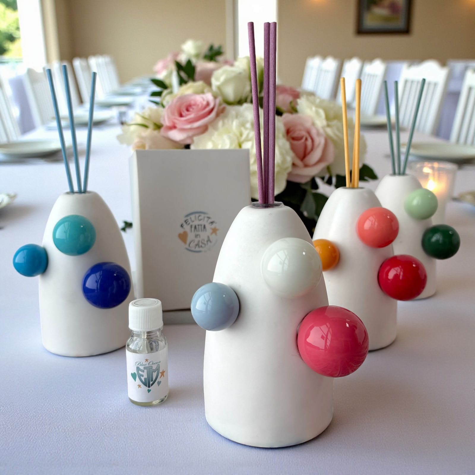 Regala felicità con il nostro profumatore essenza con sfere multicolor. Un bruciatore in resina dalle dimensioni di 12 cm, che farà sentire i tuoi aromi preferiti per le stanze della tua casa. Questo prodotto è un'ottima bomboniera per ogni evento, come prima comunione, santa cresima o 18 anni. La confezione contiene oltre alla scatola fondo e coperchio con scritta "Felicità fatta in casa" anche bacchette ed essenza inclusi nel prezzo. N on c'è modo migliore per mostrare amore ed affetto se non regalando un bomboniera utile come questo profumatore. Sarà sicuramente un regalo gradito e durevole nel tempo.