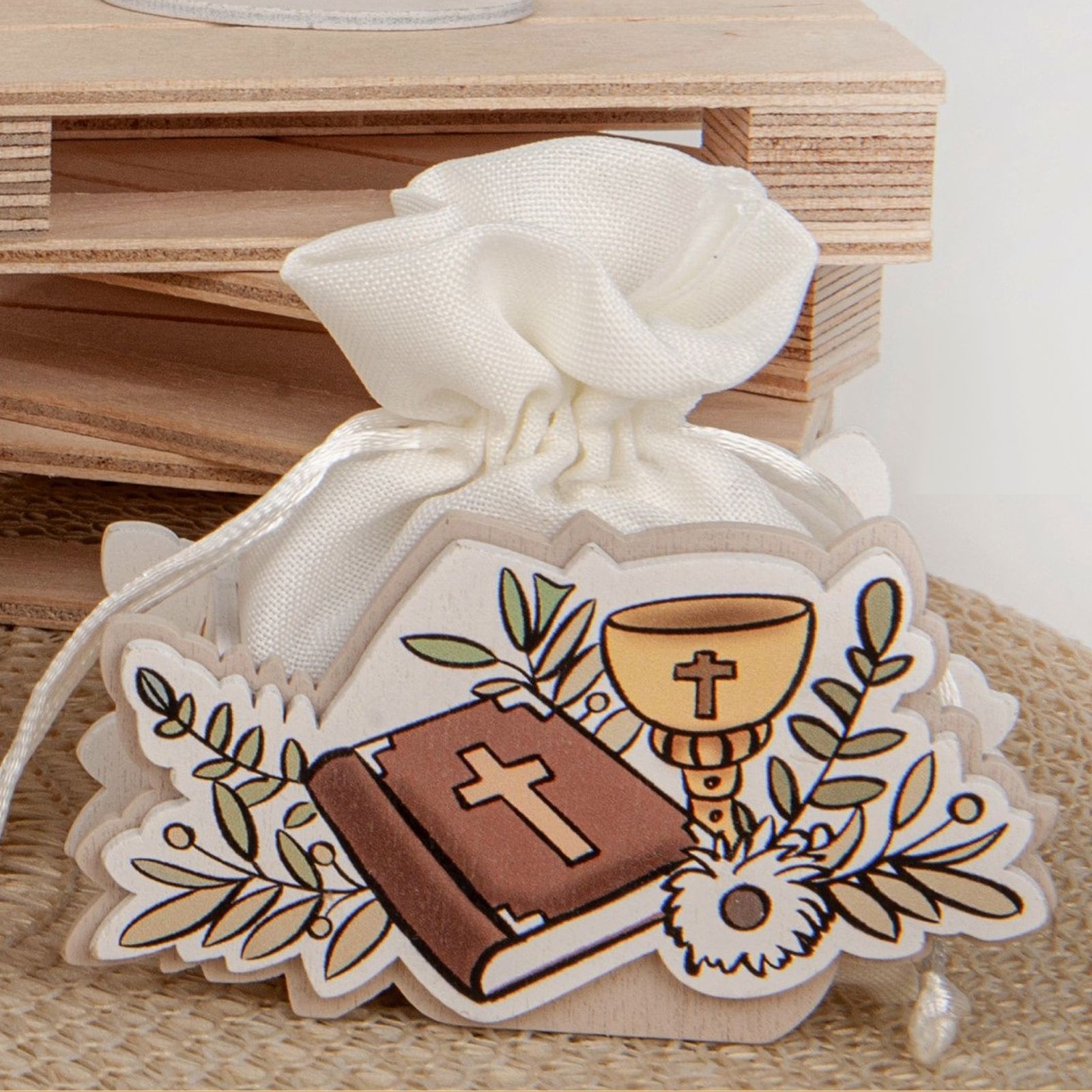 Questa linea di disegno bag con scatola in legno, simboli della cresima e foglie di ulivo è il regalo perfetto per gli invitati a una festa di comunione .