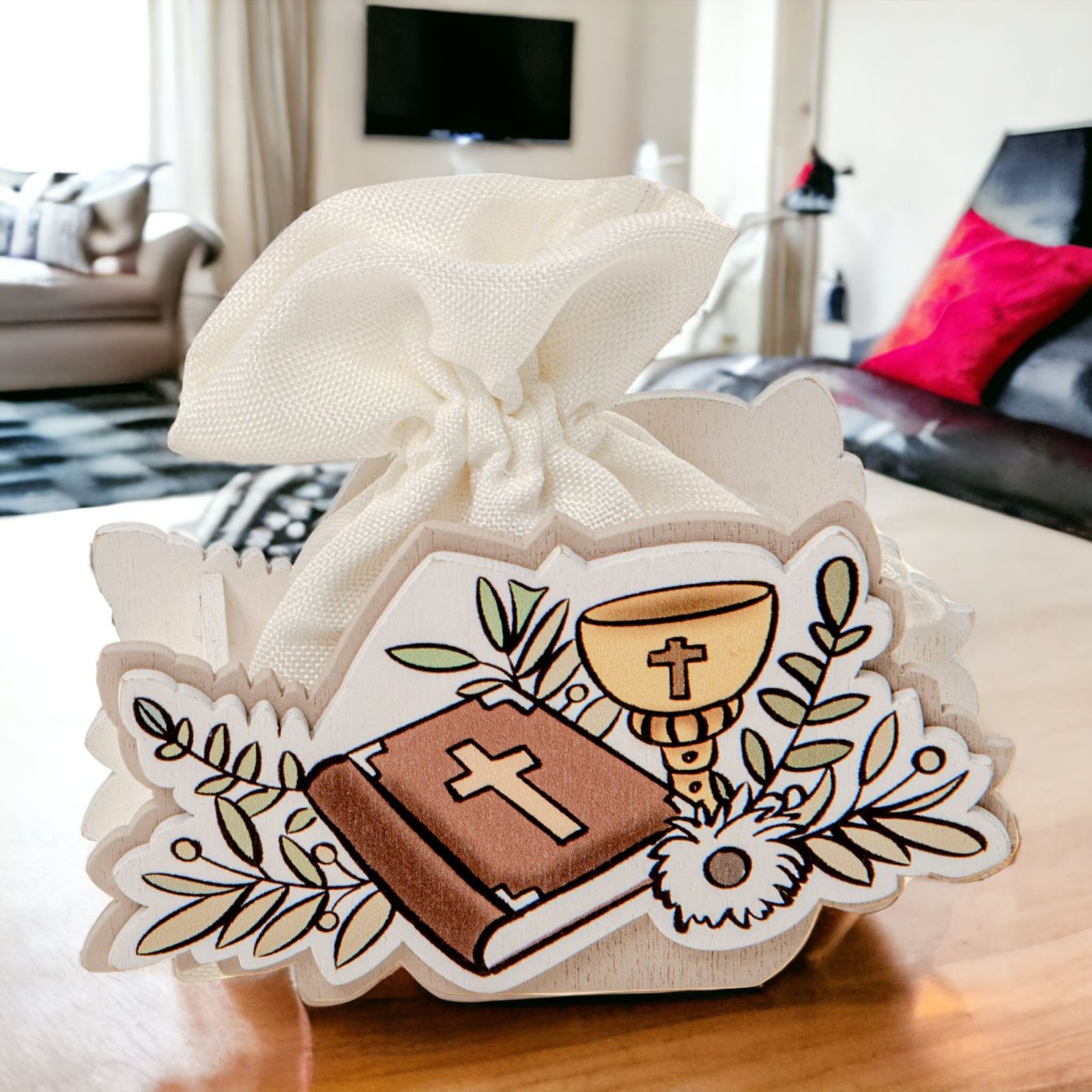 La nostra bomboniera, con scatola in legno, foglie di ulivo e simboli della cresima, è un regalo unico ed elegante, che permetterà agli invitati di conservare un ricordo indelebile della cerimonia.