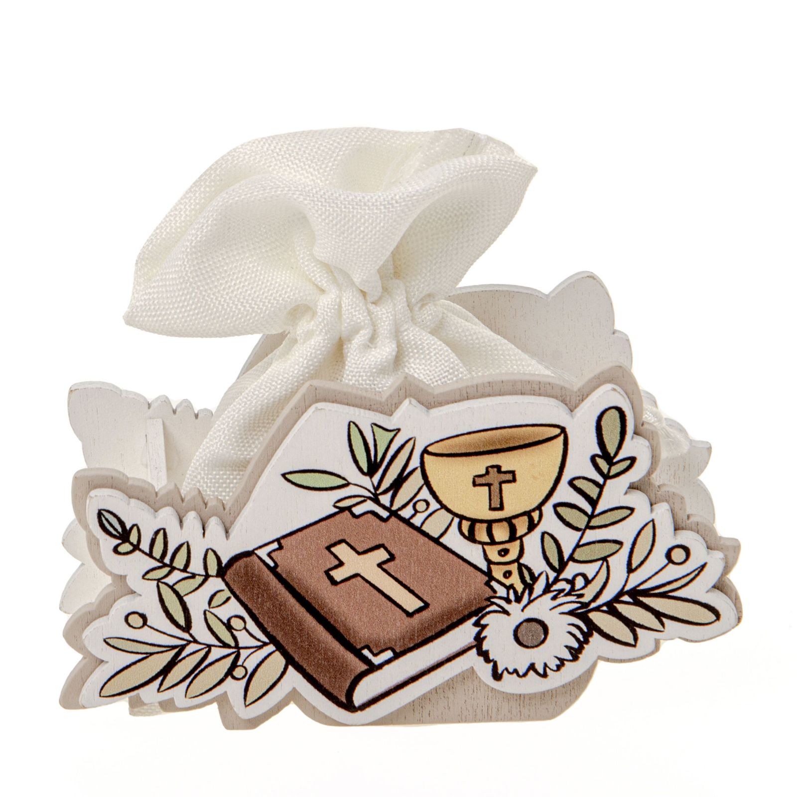 Questa confettata è un ricordino di grande significato, che rappresenta pace, ricchezza e prosperità. Misura 8 cm ed è dotata di un sacchetto bianco in cotone con tirante in corda. Un gadget di fine festa, un segnaposto perfetto, un ottimo addobbo dei tavoli per la cerimonia in chiesa oltre che un'idea regalo per catechiste ed invitati, che resteranno certamente colpiti da questo dono.
