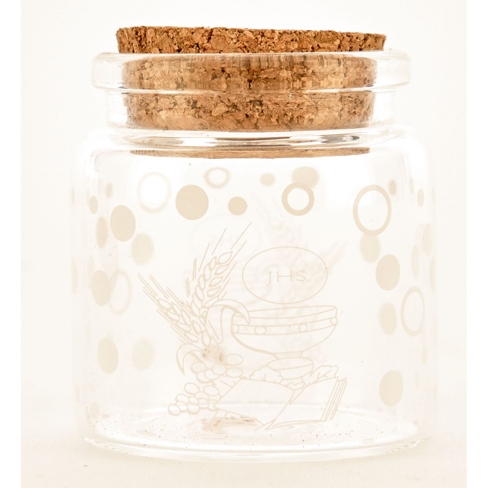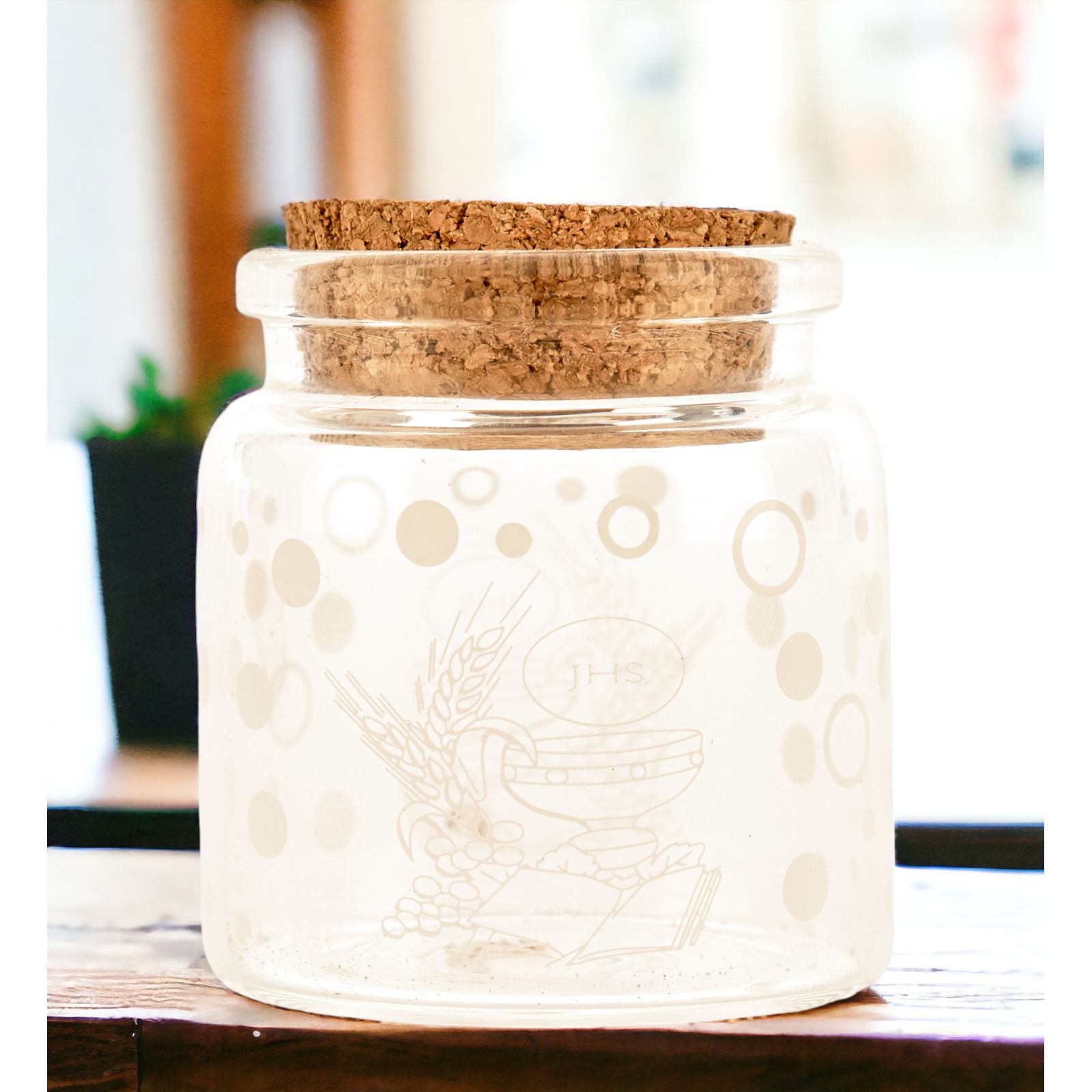 Regala un barattolino in vetro decorato in occasione di una prima comunione! Questo lussuoso contenitore trasparente è ideale per ricordare ai tuoi invitati un giorno speciale, grazie ai simboli della calice e dell'ostia. Porta confetti, porta spezie o anche una confettata: le possibilità sono infinite! Il segnaposto misura 4,7x4,7x5 cm ed è dotato di tappo in sughero. Un dono perfetto per festeggiare un momento unico!