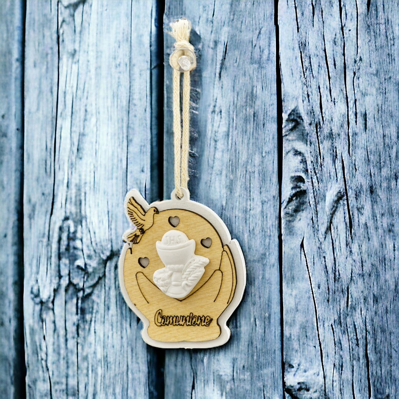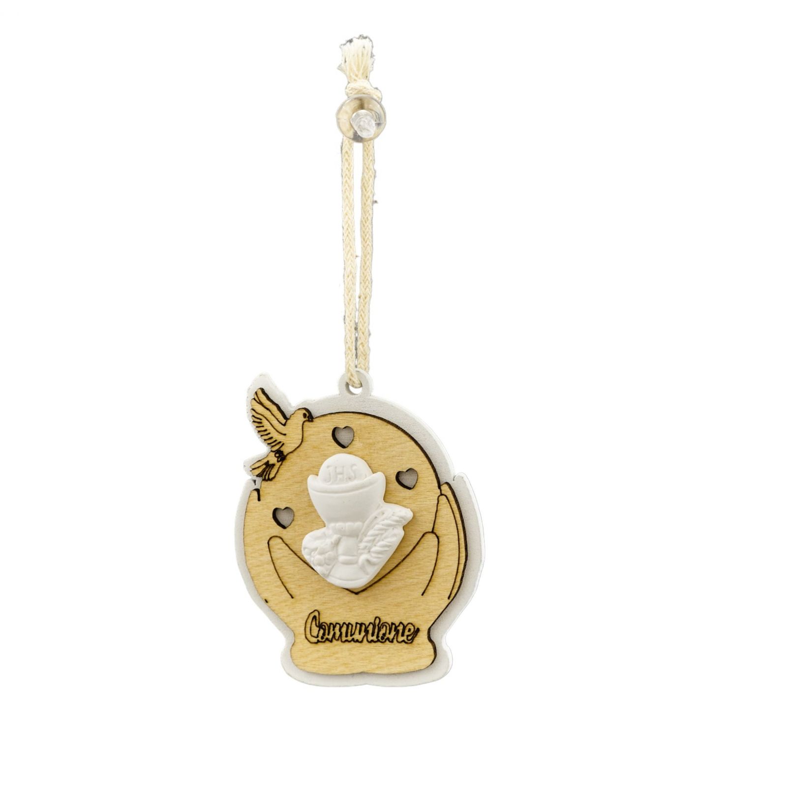L'appendino esclusivo è realizzato in legno naturale e bianco e sulla superficie sono raffigurati calice e ostia, simboli sacri della prima comunione. Una bomboniera dall'aspetto unico ed elegante, che non passa inosservata.
