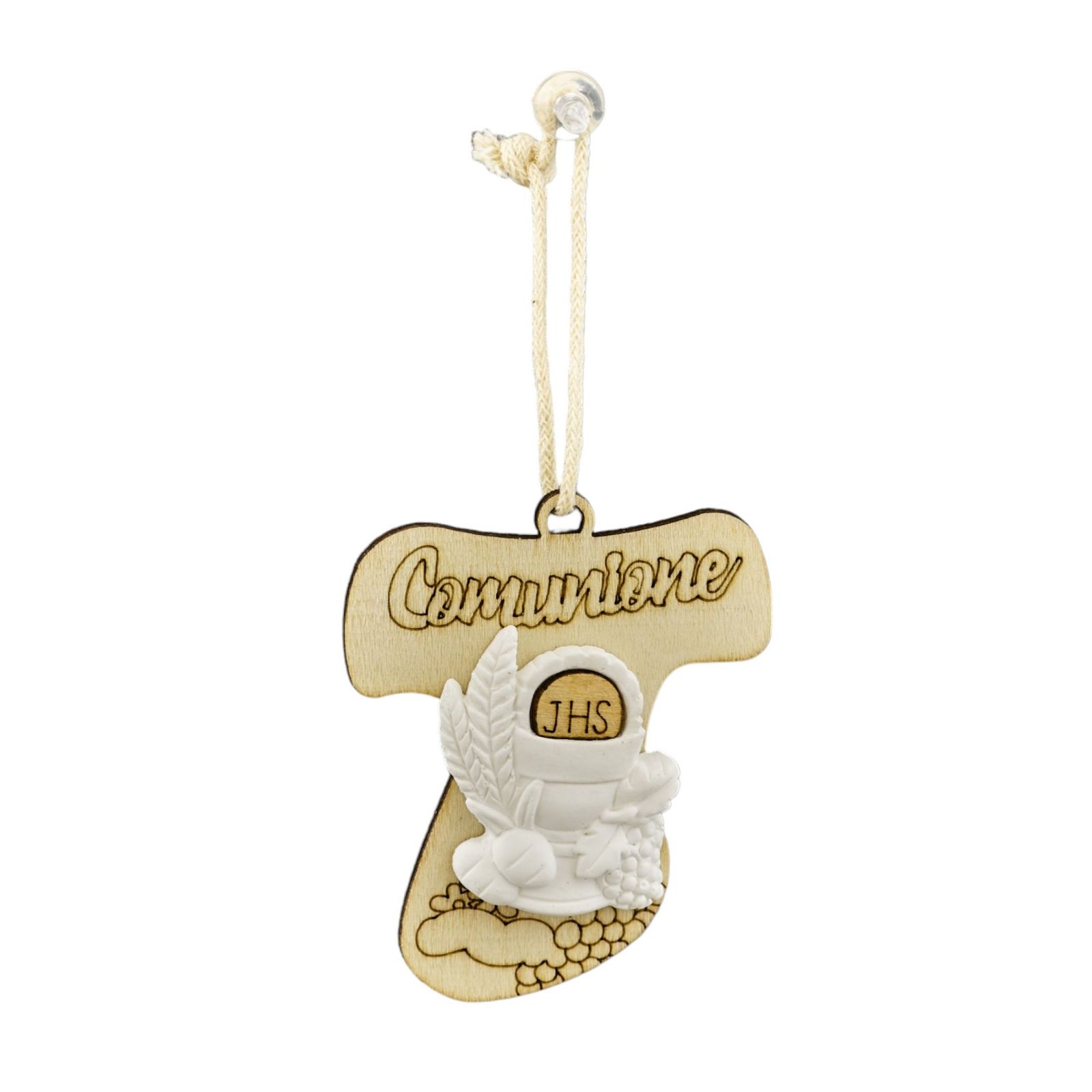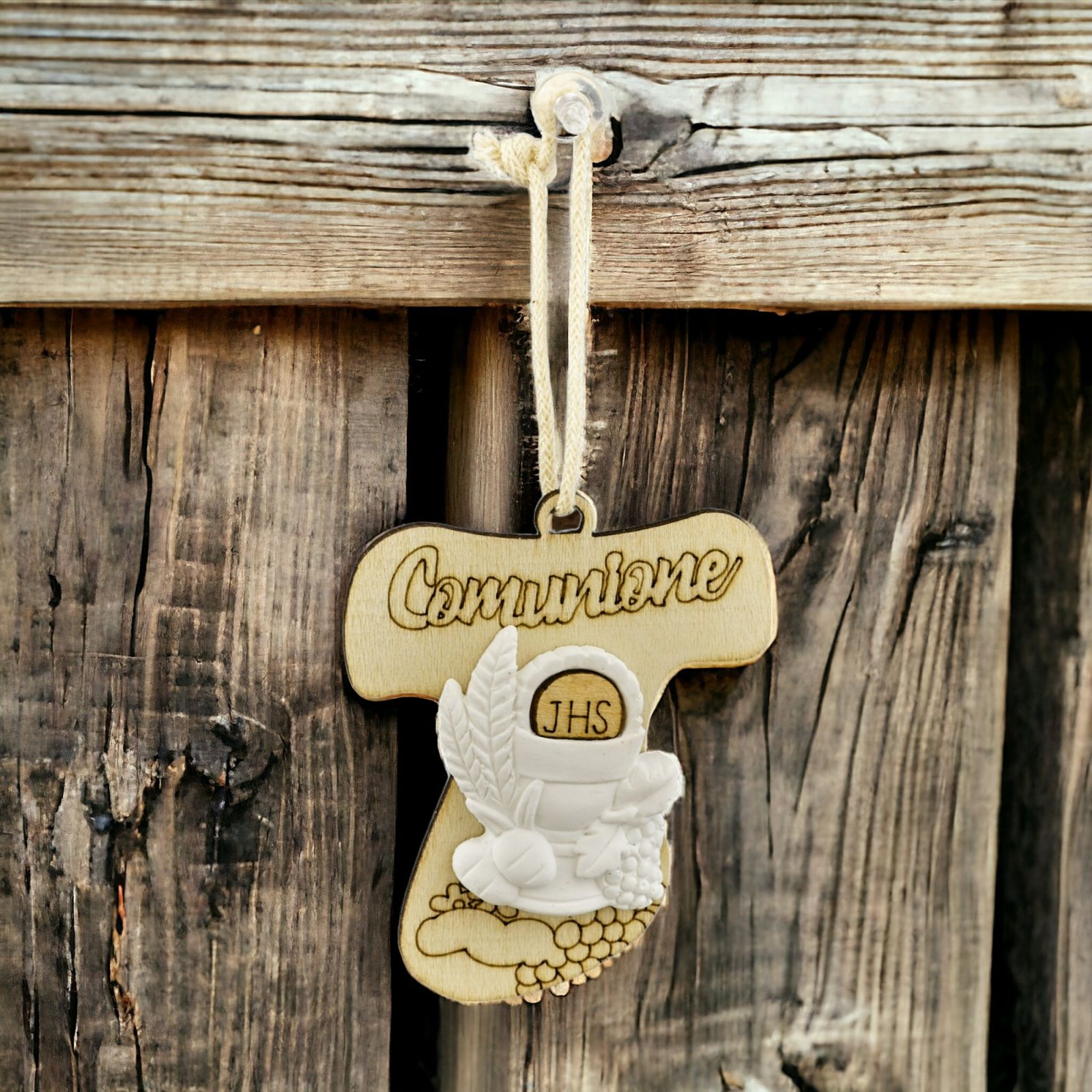 Ideale per l'occasione speciale della Prima Comunione, l'appendino è decorato con una scritta incisa "Comunione" e un gessetto a forma di calice e ostia, con cordicina inclusa.