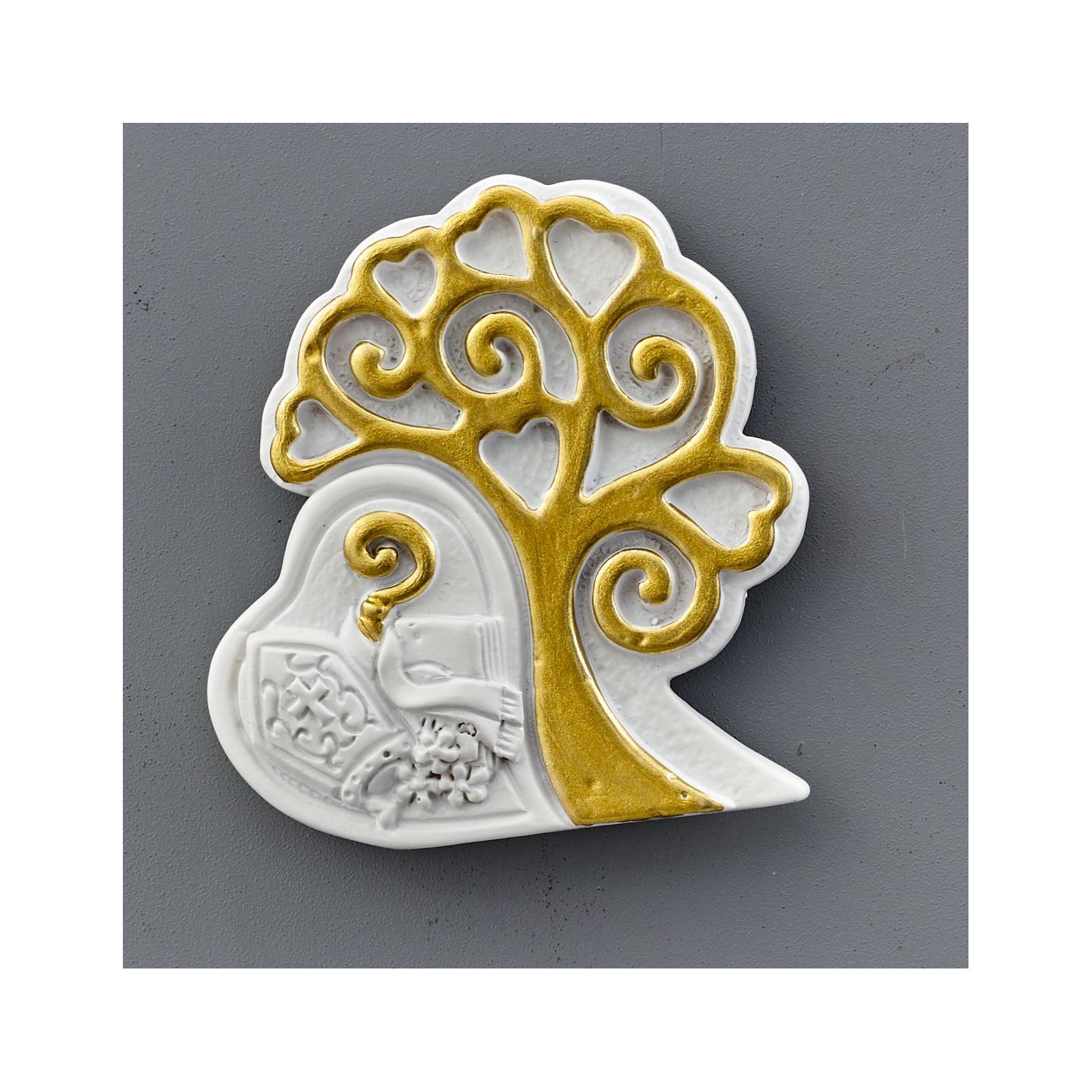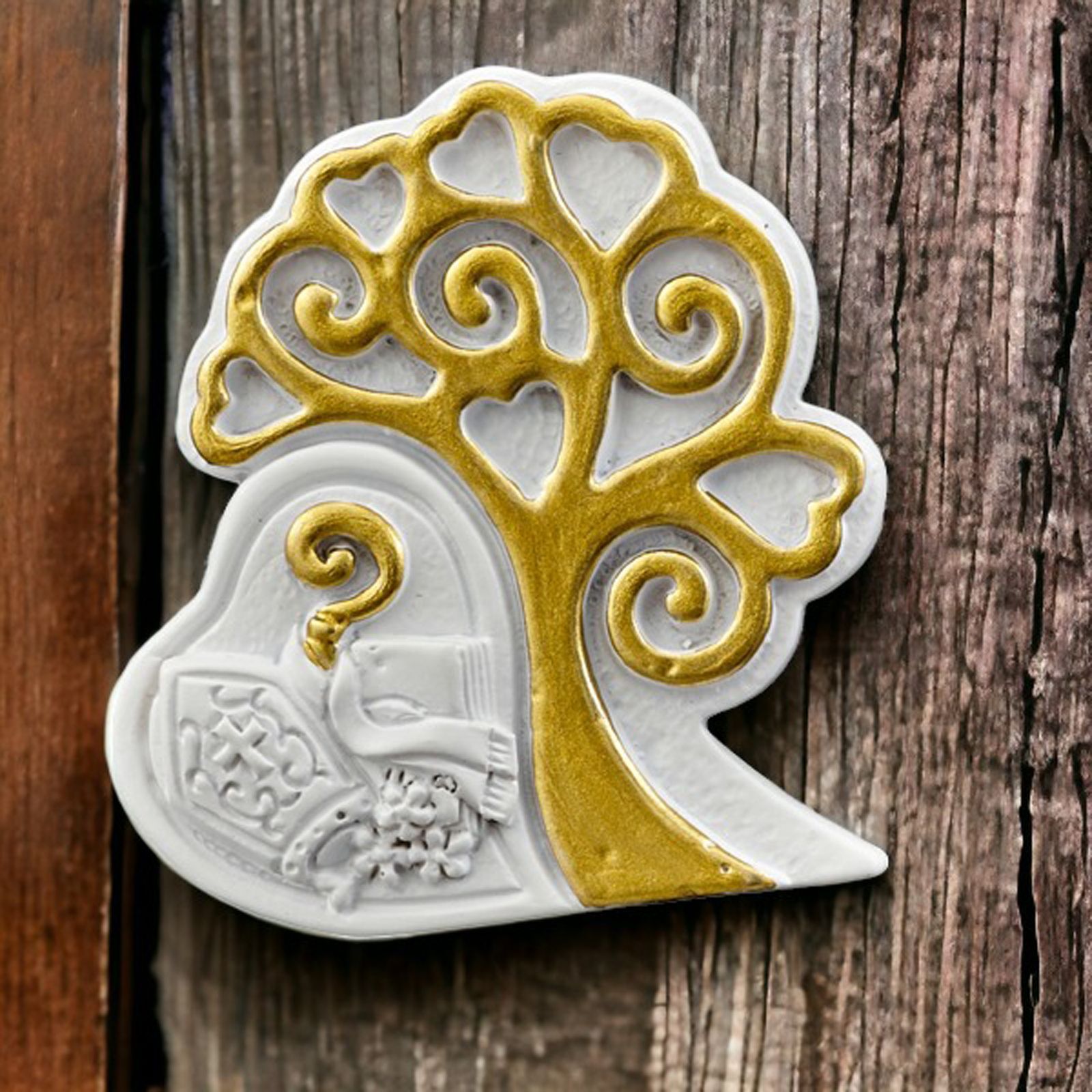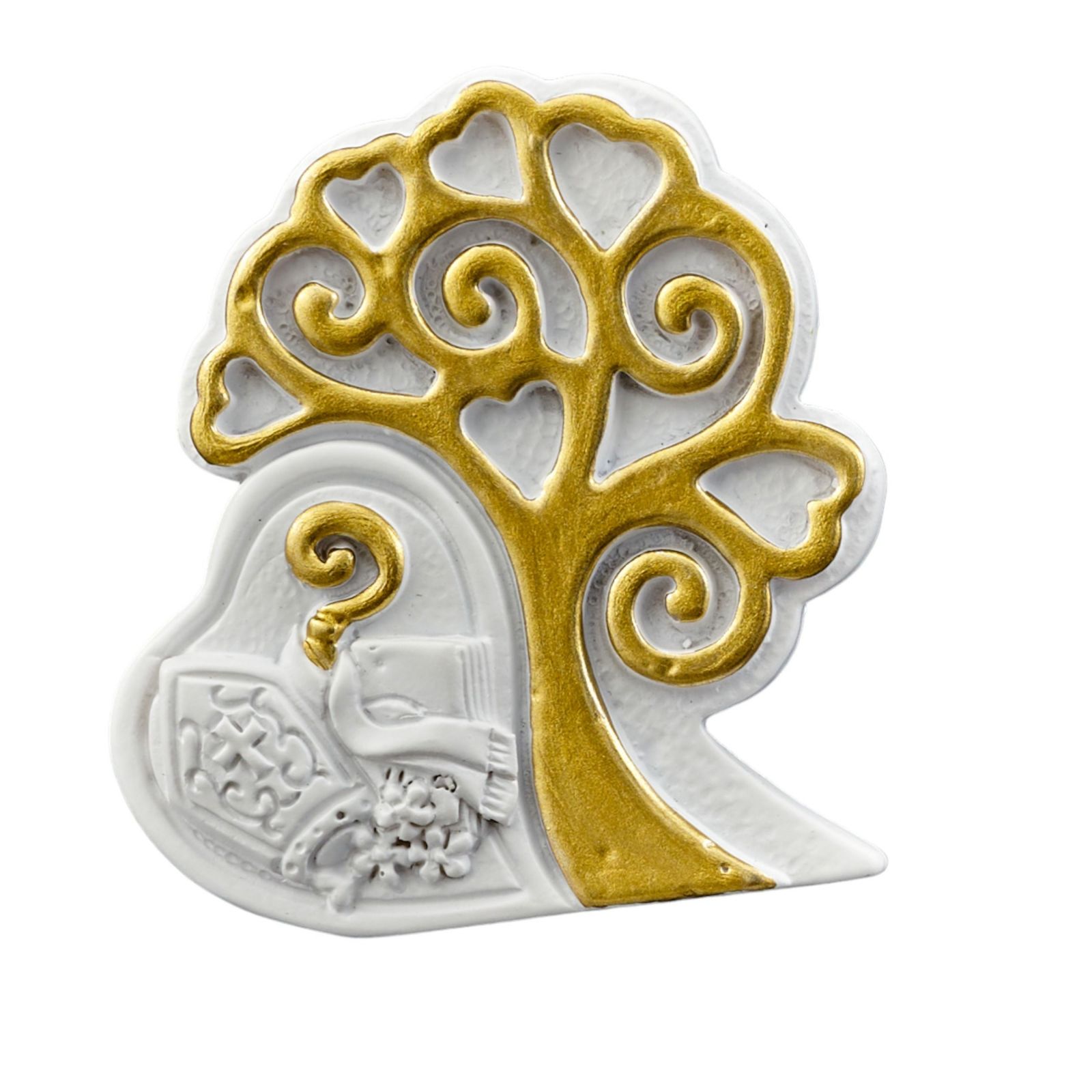 Realizzato con resina dcn albero della vita di colore gold, misura 5x1,5x5 cm e può essere un ricordino perfetto per il segnaposto, la confettata o come bomboniera religiosa.