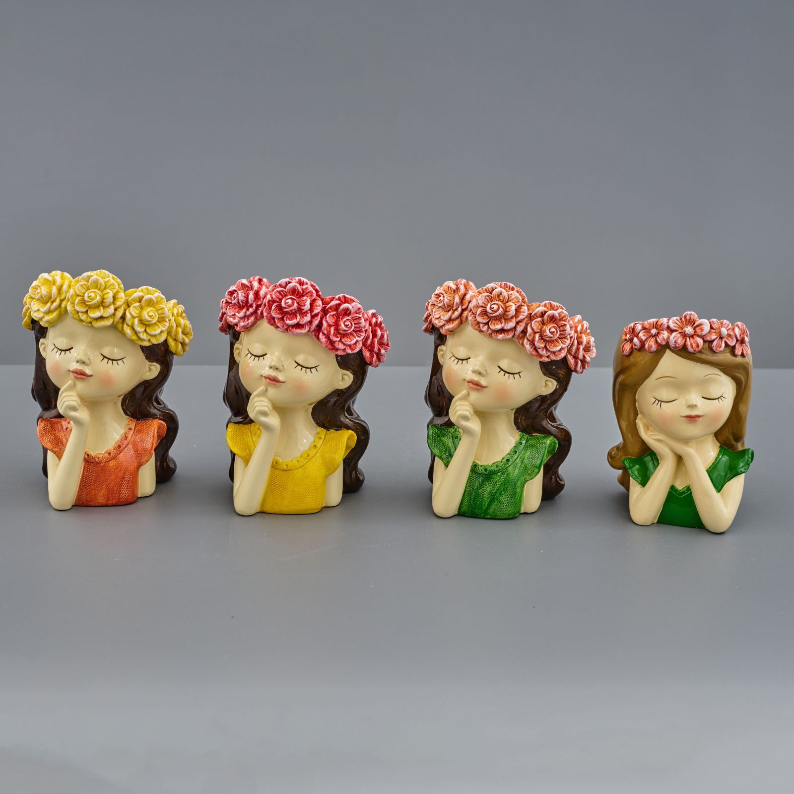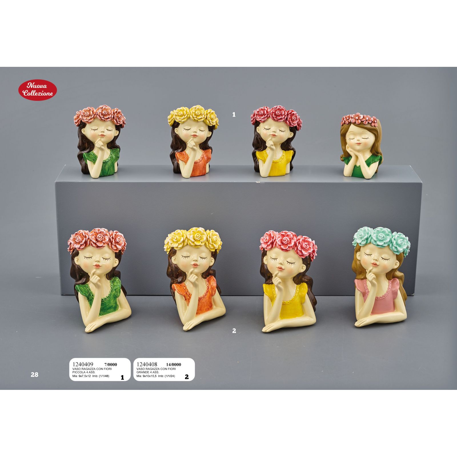 Disponibile in due dimensioni: Standard: 9x7,5x12 cm circa e Grande: 9x10x15,5 cm circa, questo prezioso vaso è realizzato in resina e presenta un assortimento di colori, con varie combinazioni di vestiti e di coroncine di fiori di diverse tonalità. Il modello non si può scegliere