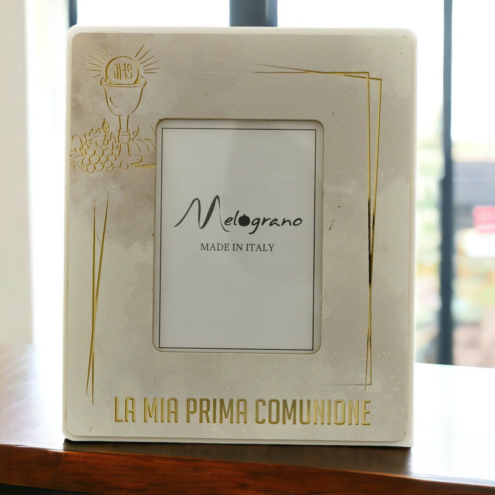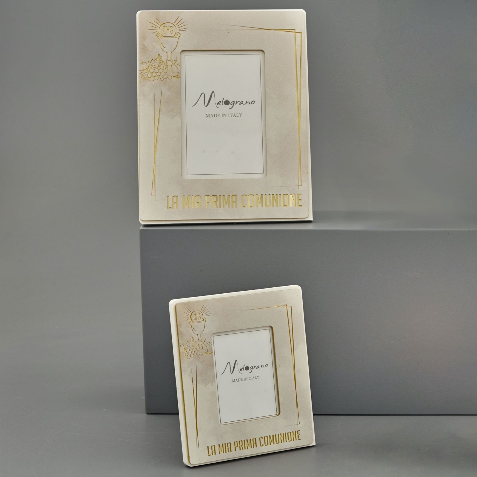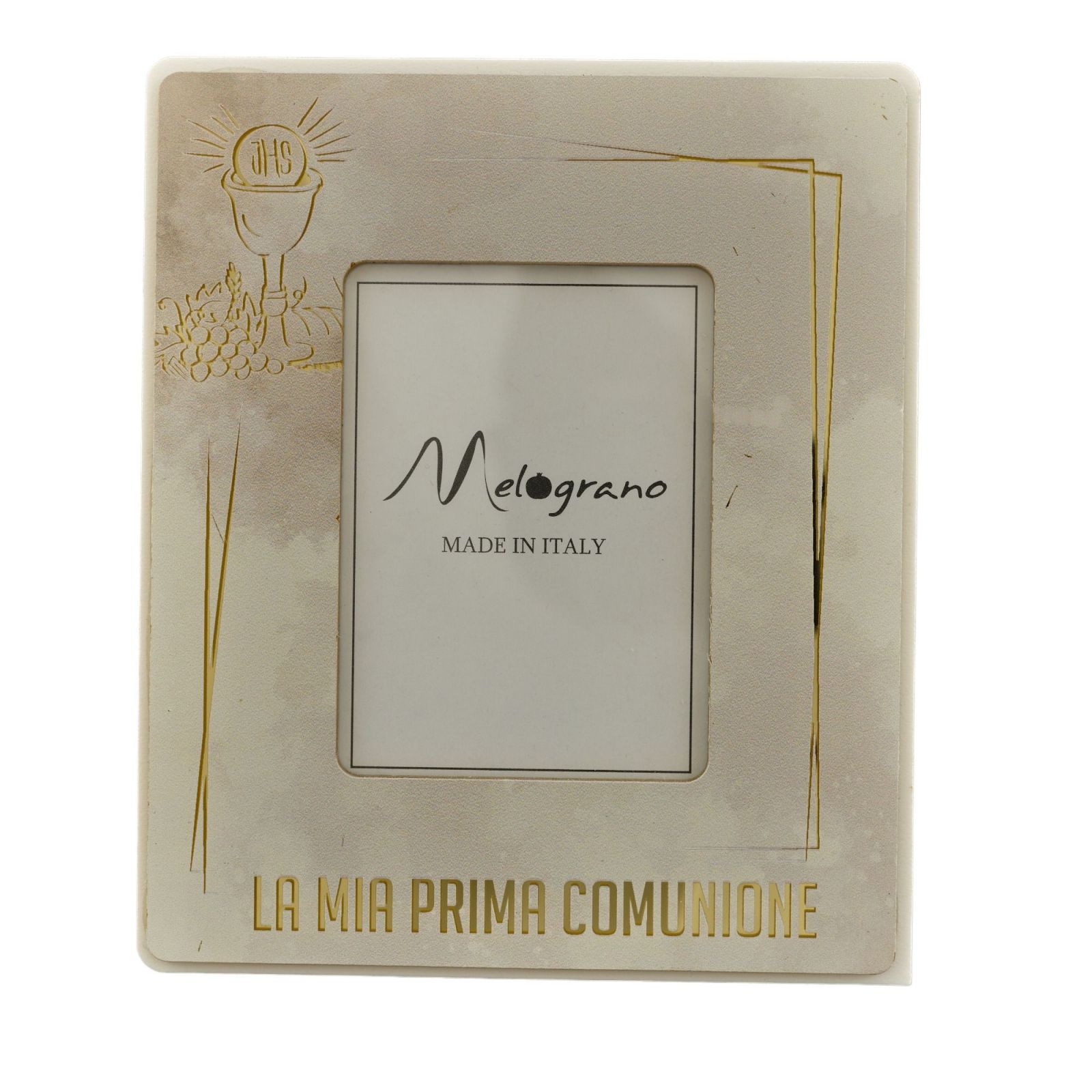 Questo portafoto con raffigurazione del calice e ostia con la scritta “La mia prima Comunione” è un oggetto elegante e di gran pregio per festeggiare al meglio l'evento. Inoltre, è disponibile in due misure,Standard : H.16X13CM(foto interna 7x10); Grande: H.23X18CM(foto interna 10x15) , nel colore tortora con particolarità in color oro. All'interno della confezione è inclusa una scatola regalo per rendere questo prodotto unico e personalizzato.