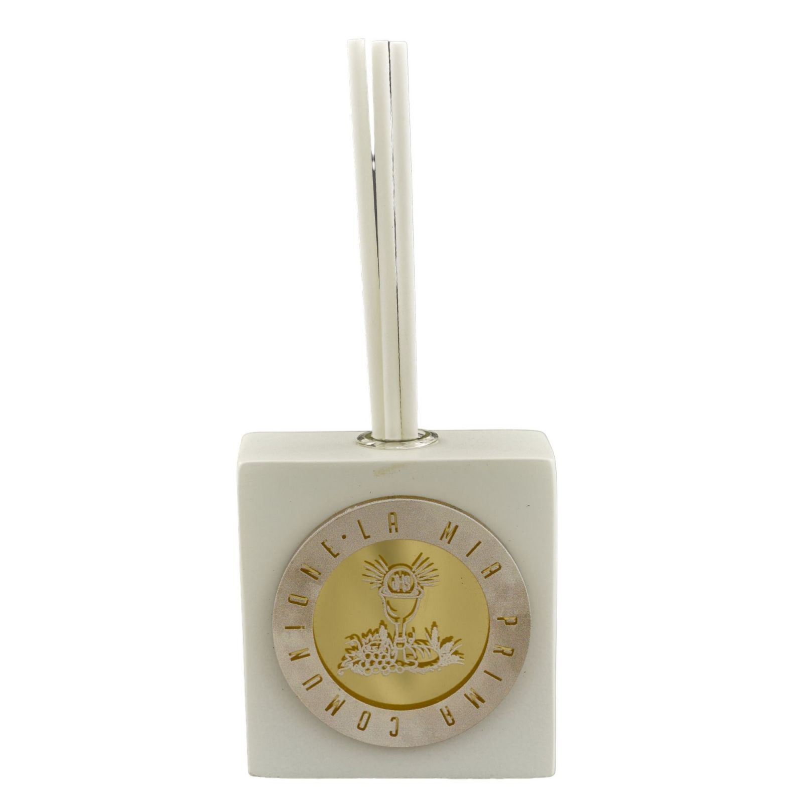 Regala ai tuoi ospiti questo particolare diffusore essenza con calice e ostia e scritta "la mia prima comunione". Il profumatore è di forma quadrata e al centro riporta una raffigurazione di un calice e un'ostia, simboli cari al sacramento della Comunione, inoltre, La scritta "La mia Prima Comunione" aggiunge un tocco personale e significativo, rendendo questo diffusore non solo un oggetto decorativo, ma anche un prezioso ricordo di un giorno così importante.