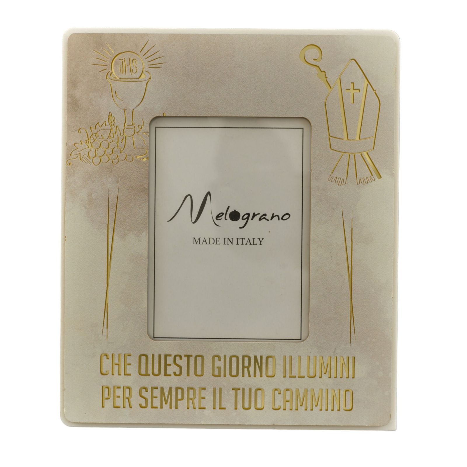 Regala bomboniere originali per Comunione e Cresima: il portafoto con simboli sacri e la frase “Che questo giorno illumi sempre il tuo cammino” è una deliziosa sorpresa per i tuoi ospiti.