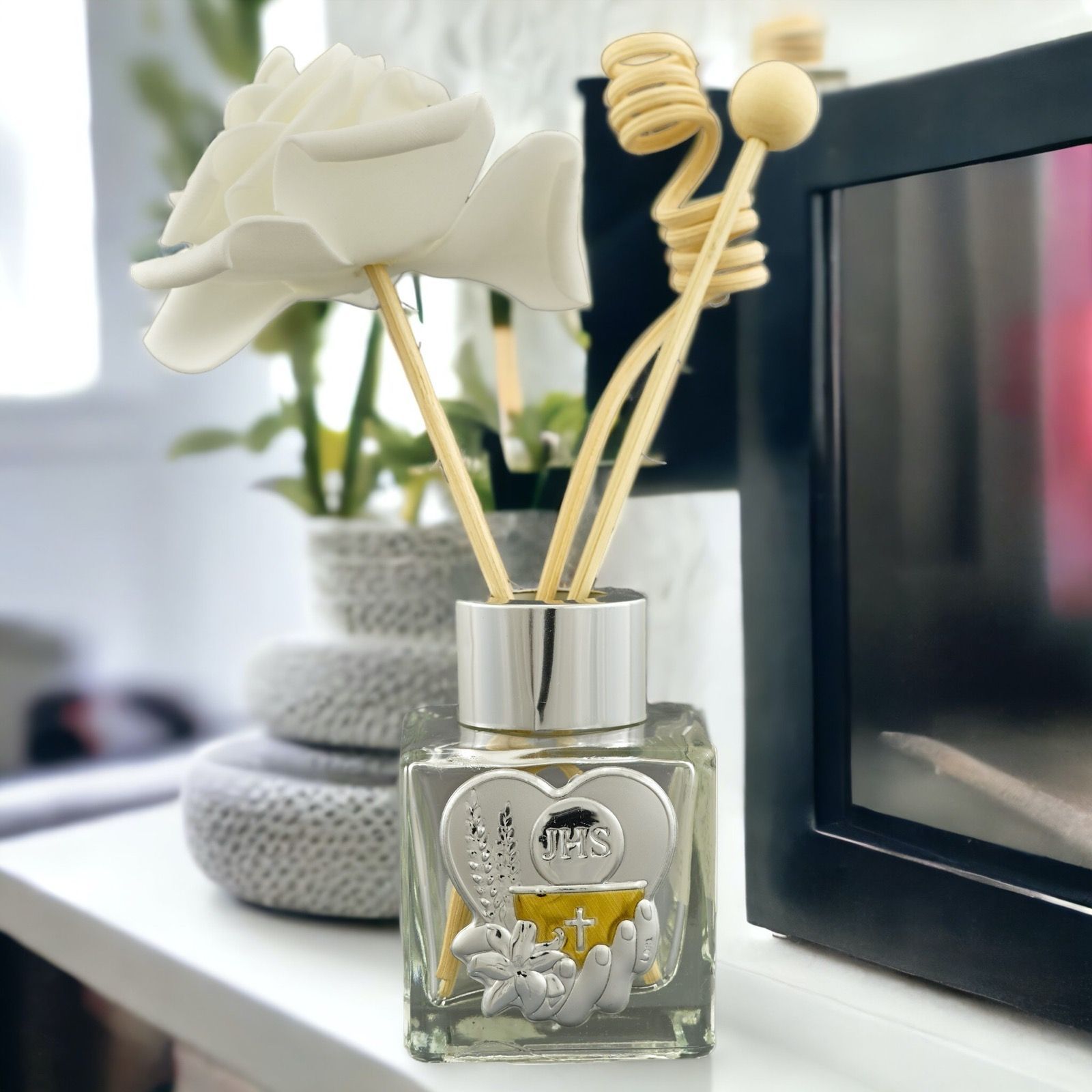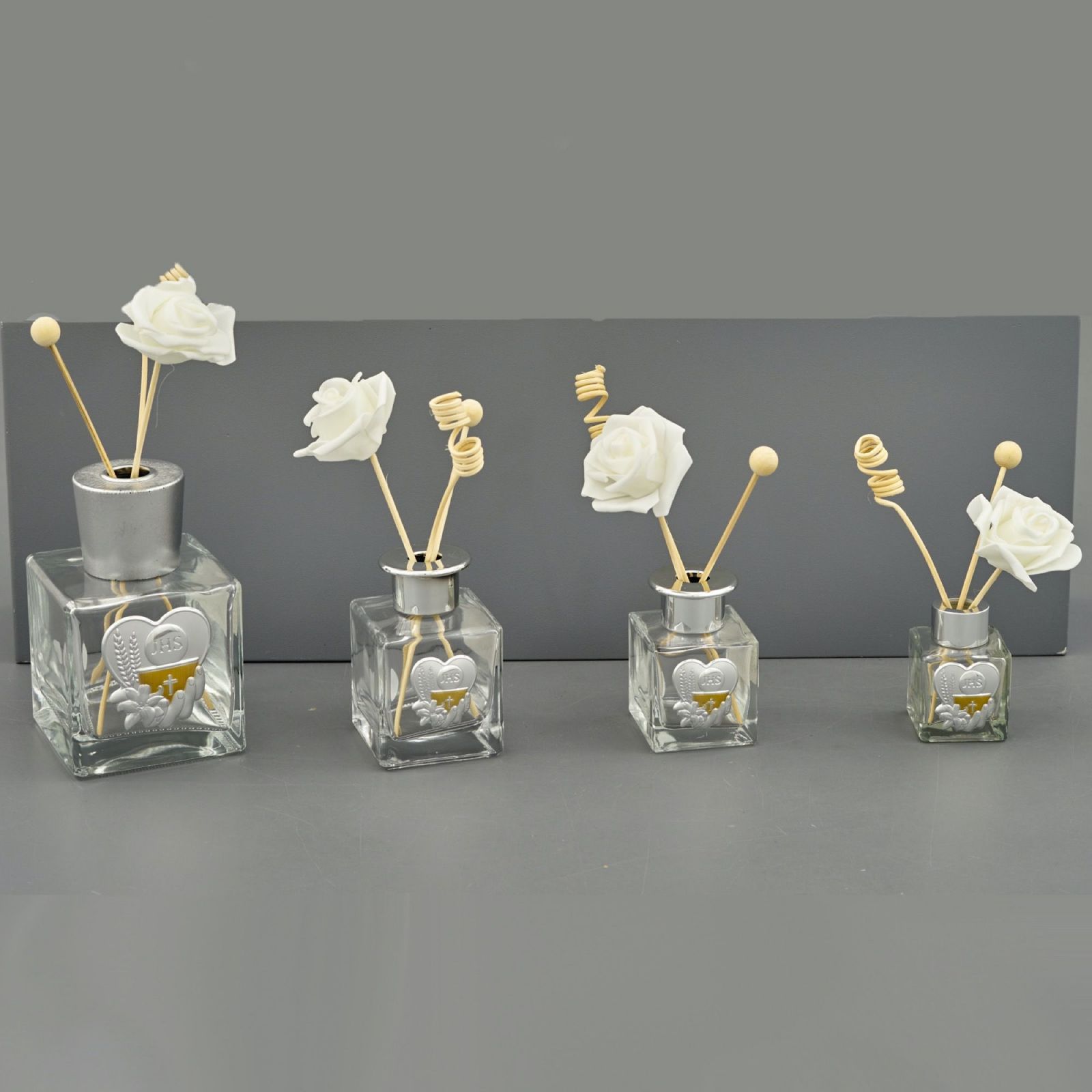 Questo particolare diffusore per essenze è una perfetta scelta come bomboniera per la prima comunione. La base in vetro trasparente, di dimensioni varie a seconda della versione scelta (Piccolo: 4,2X4,2X7(50 ml); Standard : 6X6X8,5cm(100 ml); Grande: 7X7X10cm(200 ml), Maxi: 9,5X9,5X15cm(500 ml);), ospita una placchetta a forma di cuore decorata con simboli sacri quali calice e ostia. La placchetta è realizzata in color argento con particolari color oro. Bacchette e scatola regalo sono inclusi nel prezzo.