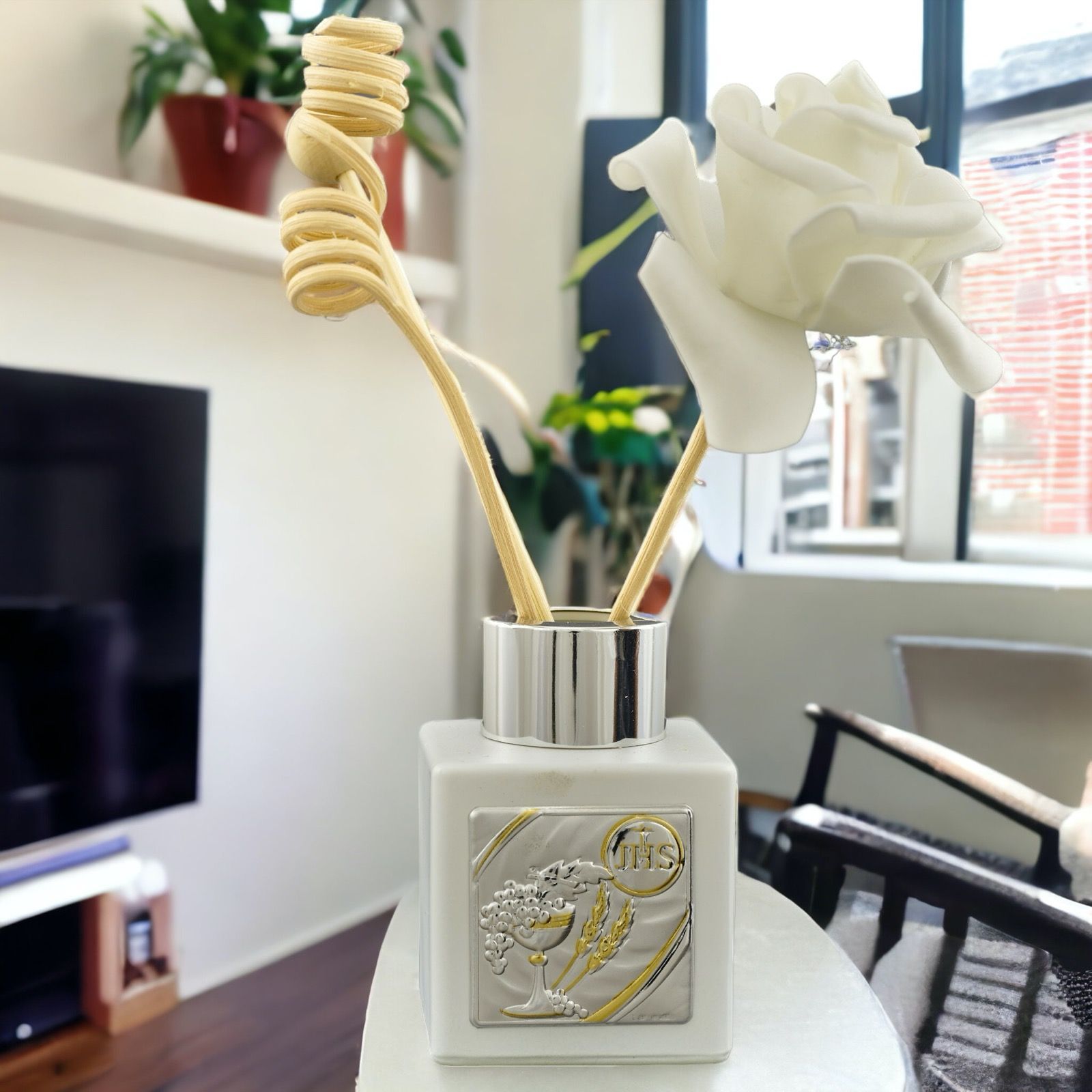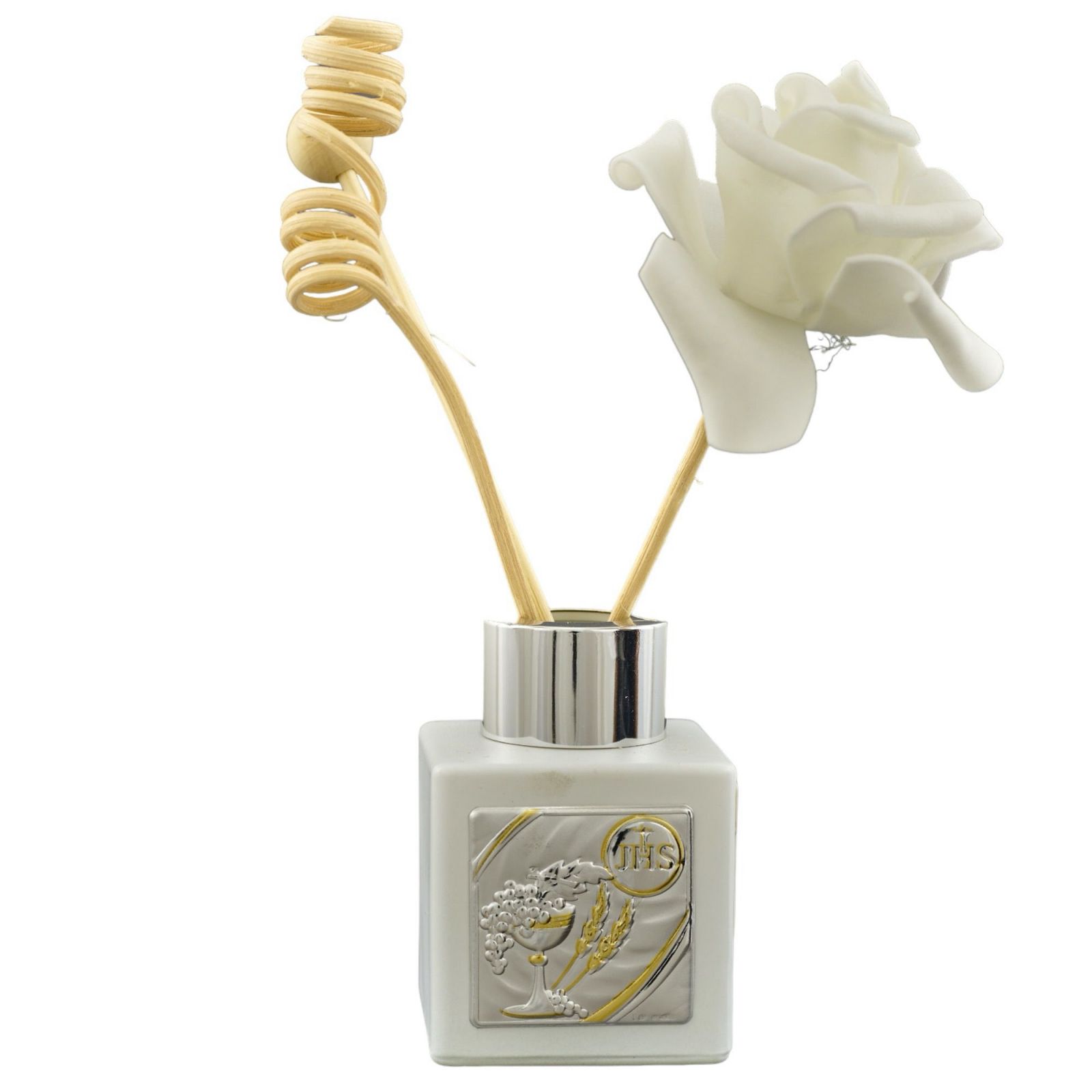 Regalare la bomboniera di prima comunione nella versione profumatore ambiente con simboli sacri calice e ostia è un simbolo di gioia, fortuna e benedizione. Questo dono ricorda ai bambini e alle bambine la bellezza di celebrare il loro giorno speciale.