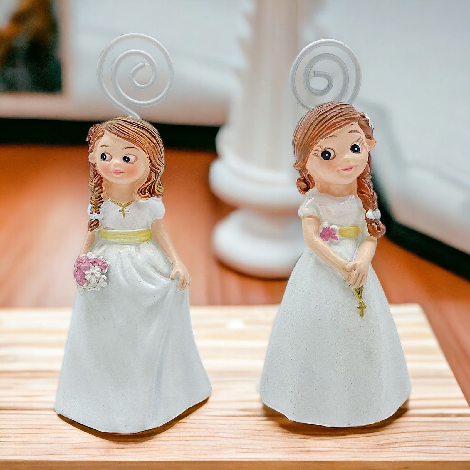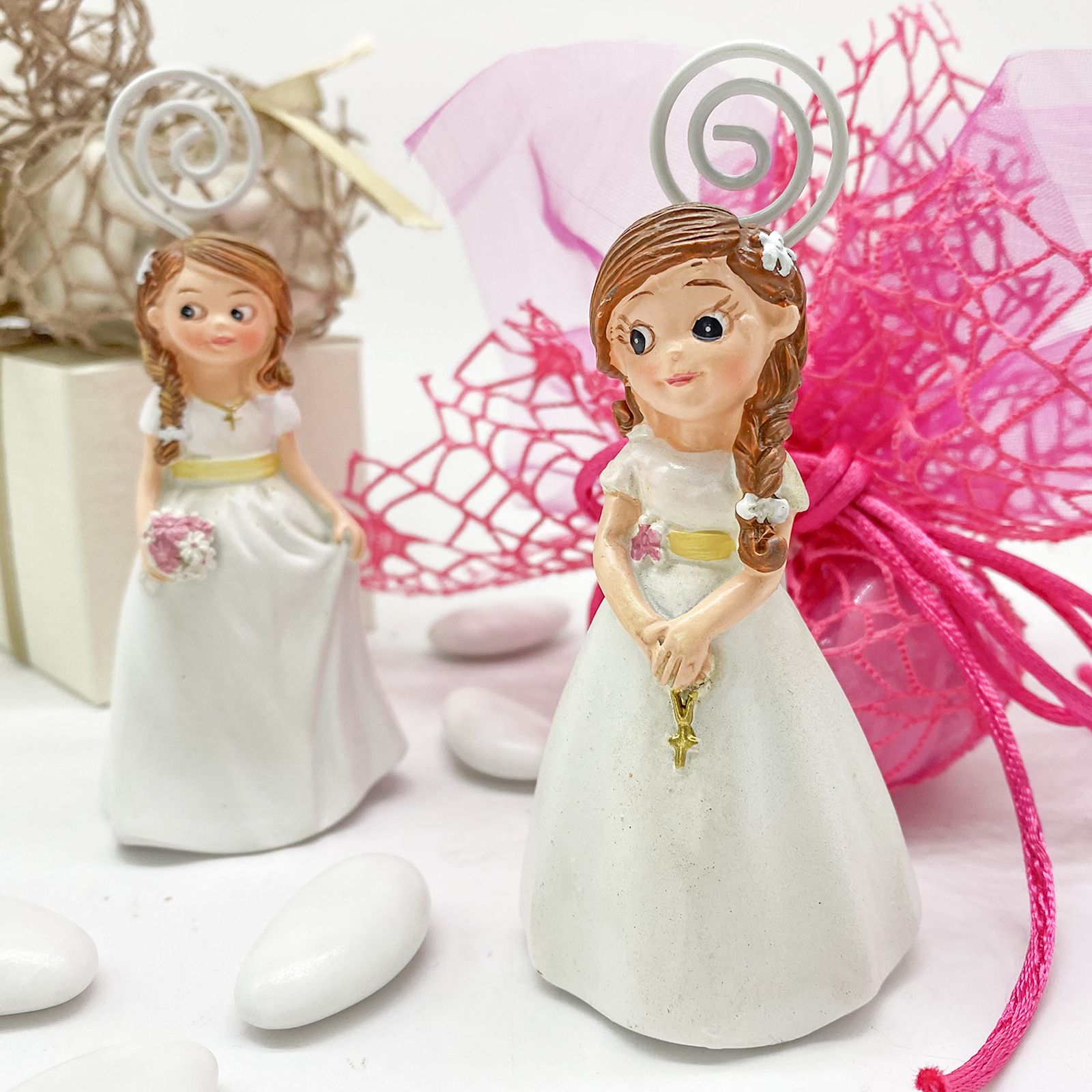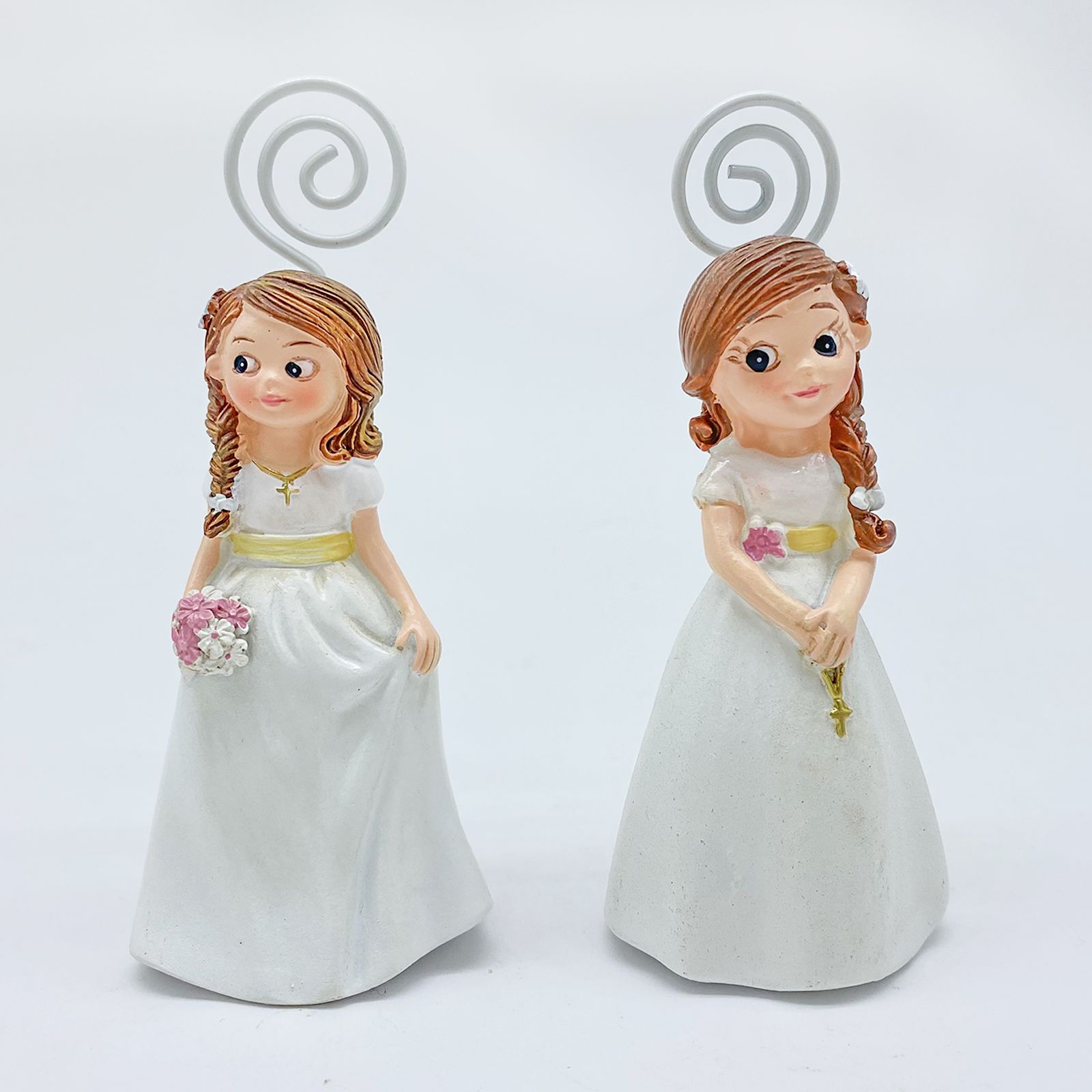 Rendi Speciale la Comunione della Tua Bambina con i nostri memoclip raffiguranti una bambina vestita elegantemente con un abito bianco. Disponibili in due modelli assortiti, questi memoclip sono l'accessorio perfetto per le tue bomboniere speciali.