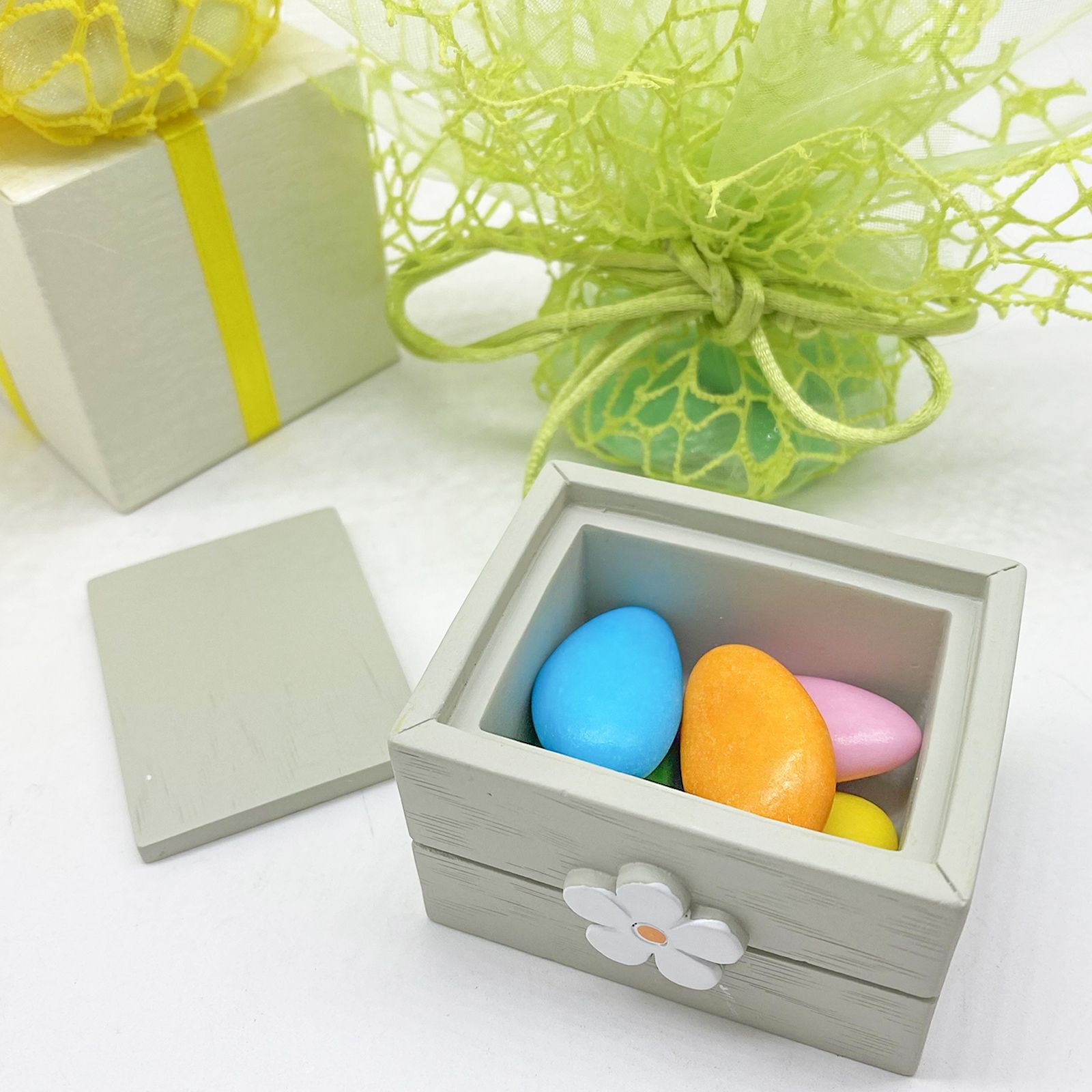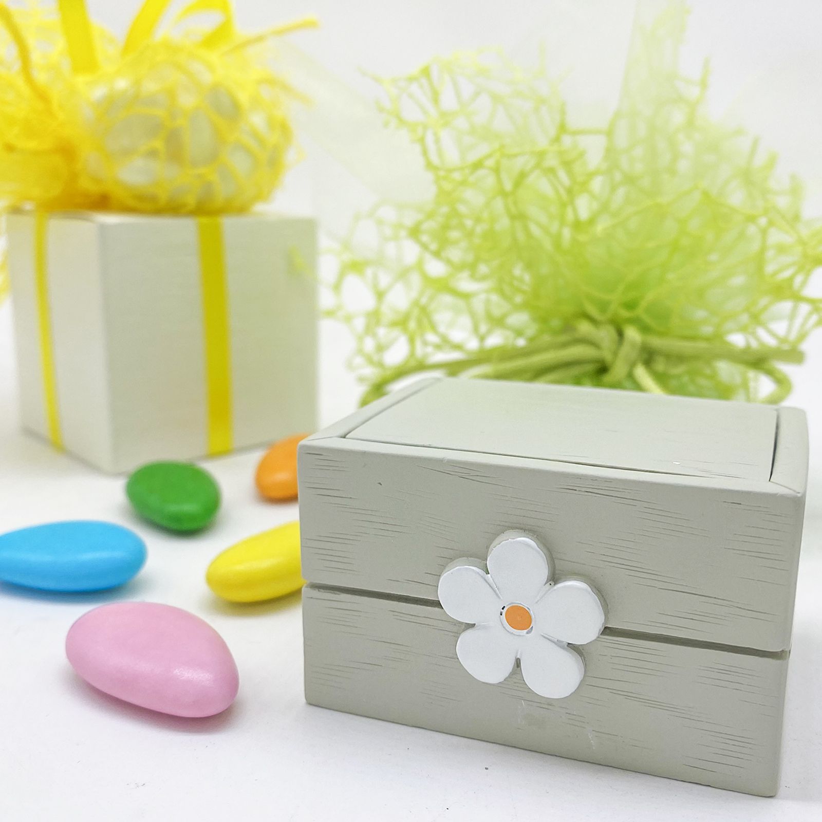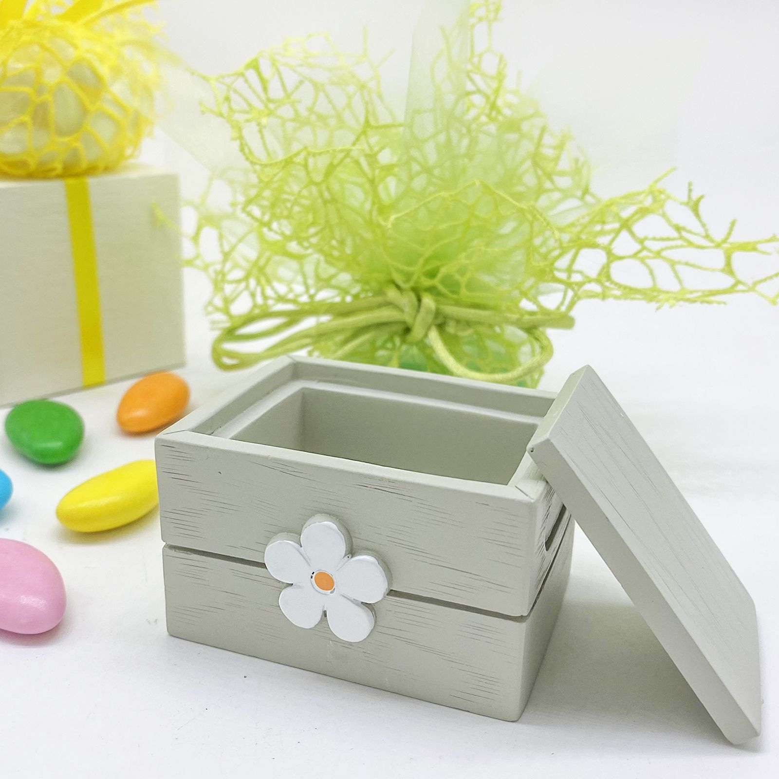 Il colore grigio elegante, abbinato al candore della margherita, dona un tocco di classe a qualsiasi evento. Che si tratti di un battesimo, di una comunione, di un compleanno o di un’altra ricorrenza speciale, questa scatolina saprà impreziosire la tua confettata e sorprendere gli invitati con la sua semplicità elegante.