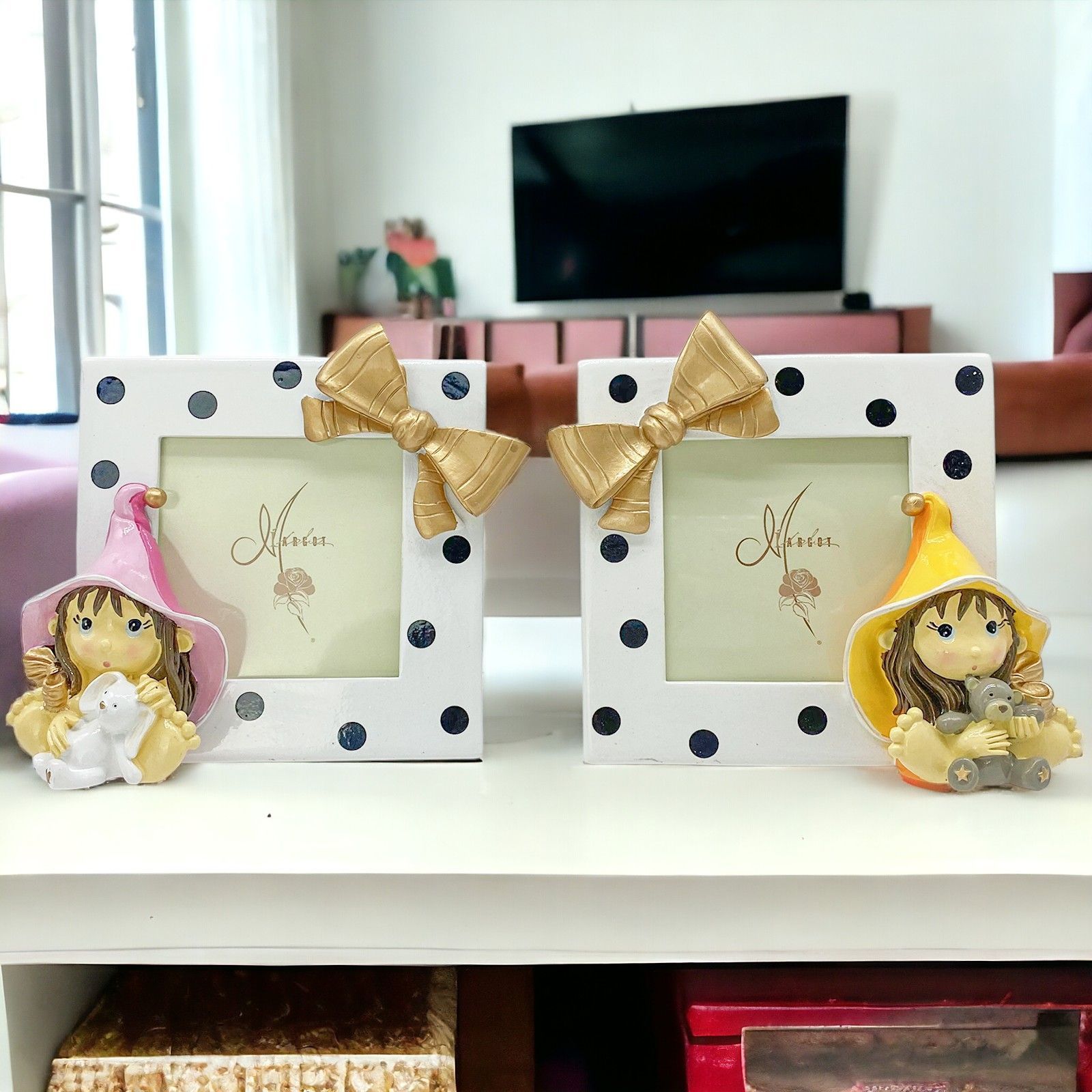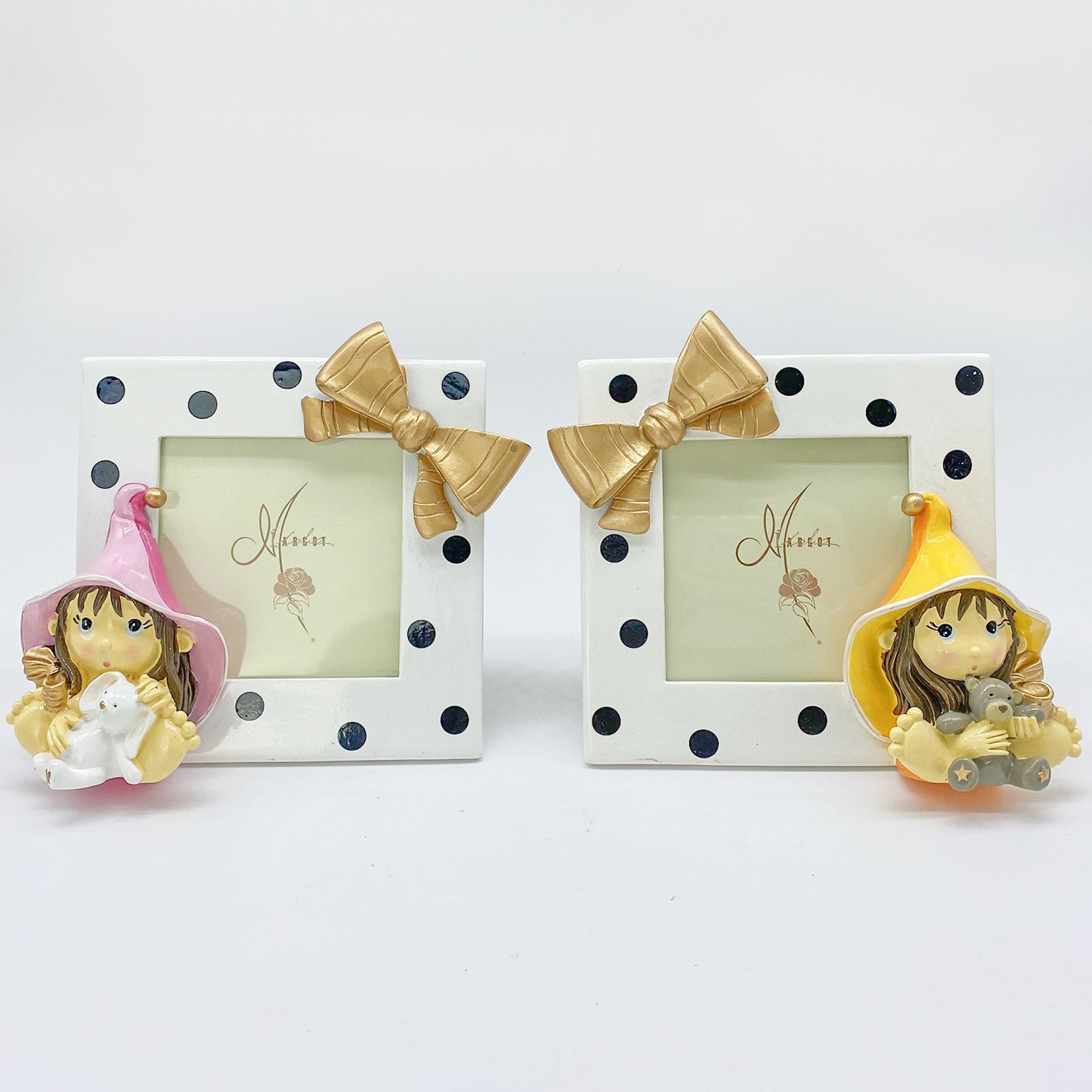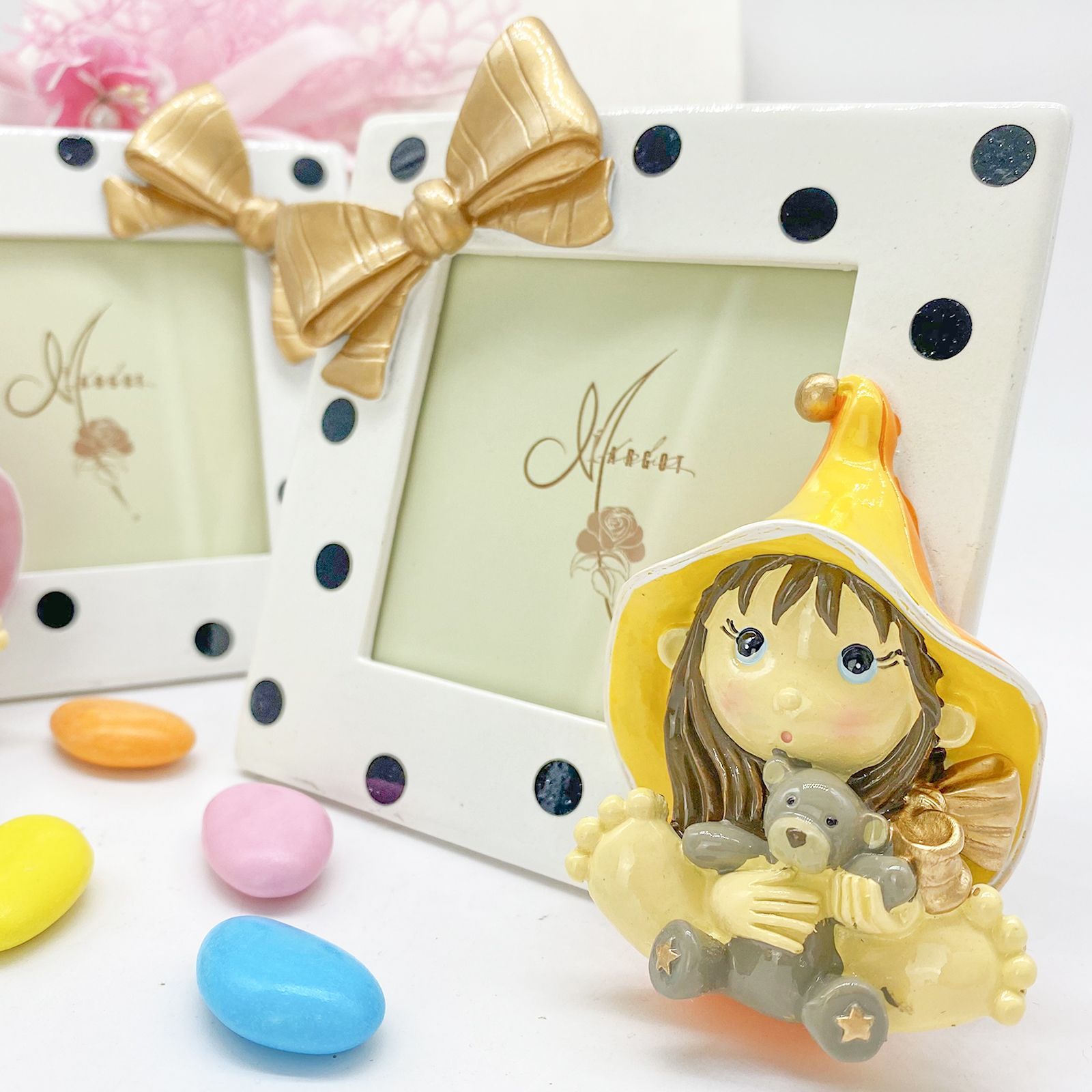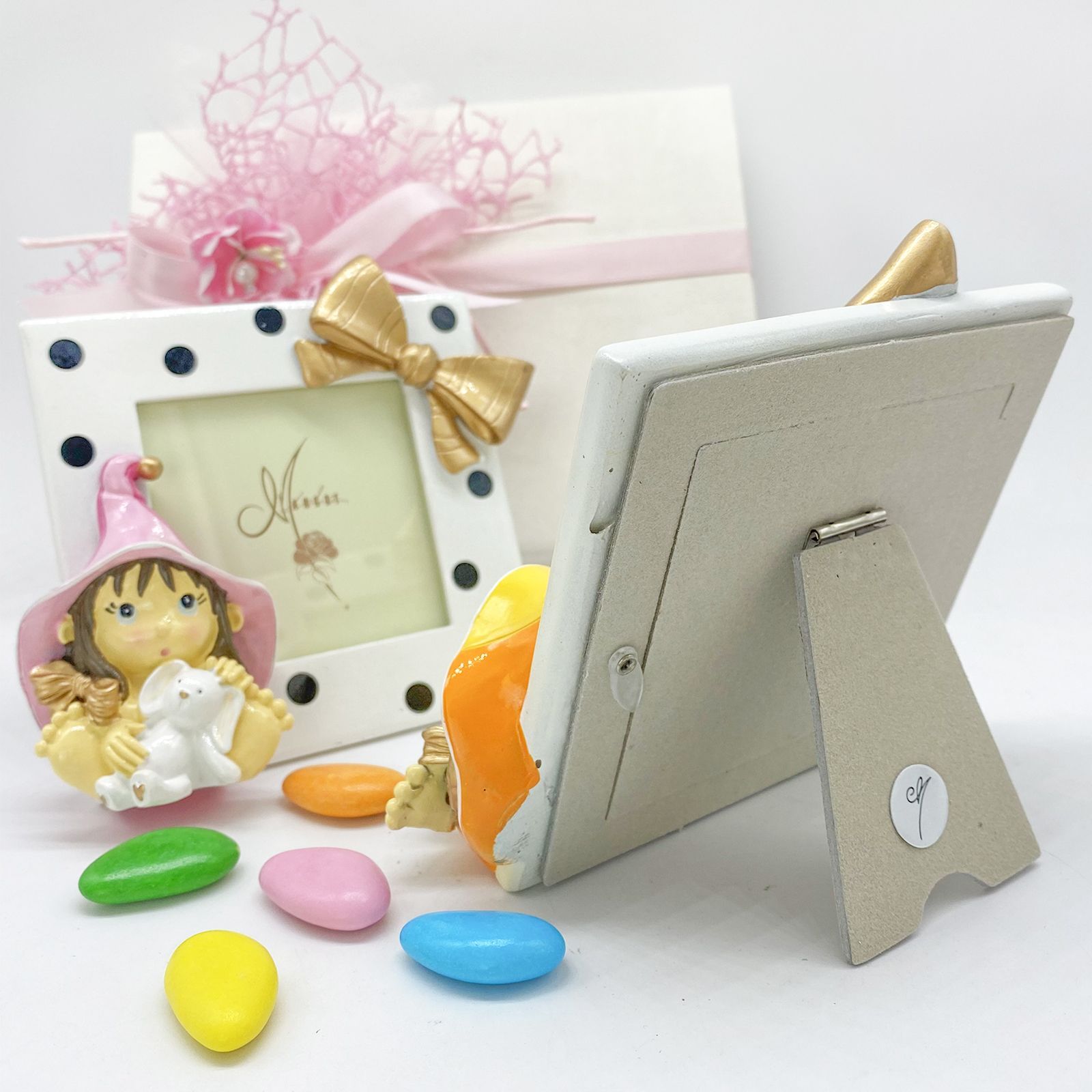 Aggiungi una nota di magia ai tuoi momenti speciali con il Portafoto con Streghetta, disponibile in due modelli assortiti, ognuno con un peluche tenero tra le mani. Perfetto per battesimi, comunioni, e compleanni, questo portafoto in resina lucida è un regalo affascinante e originale.