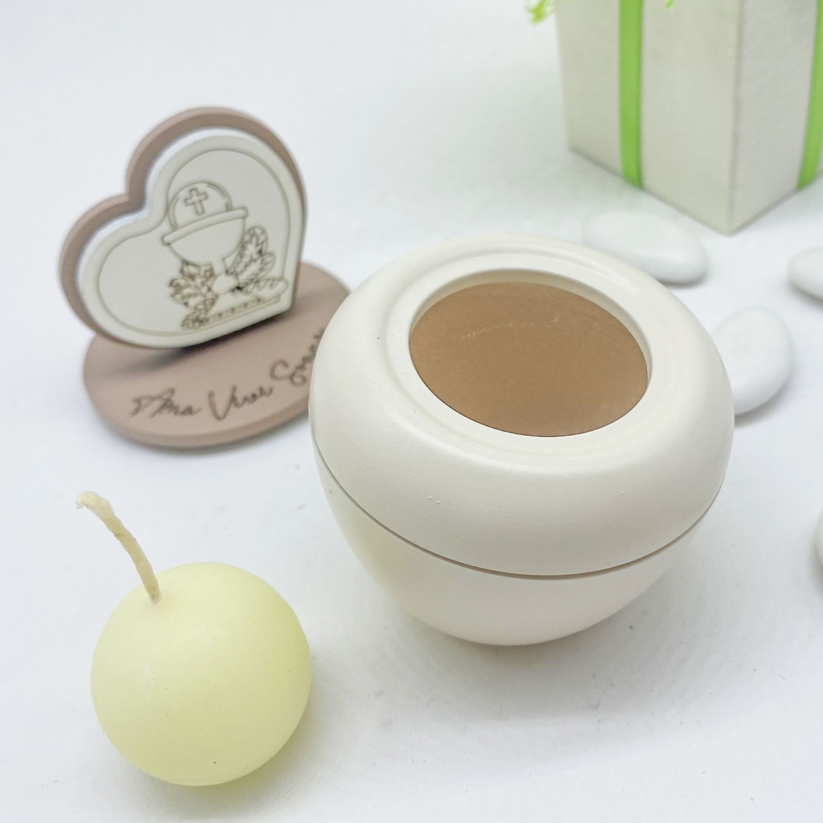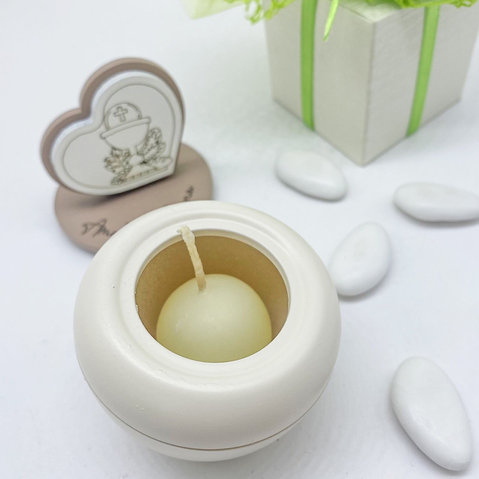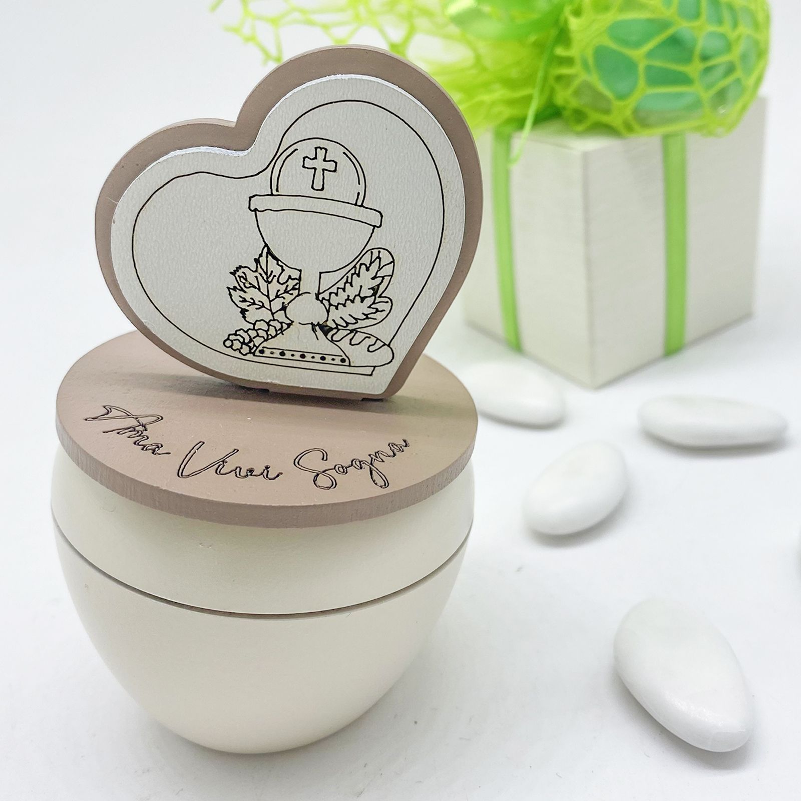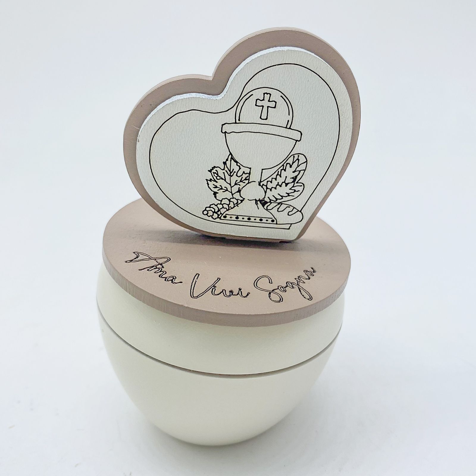 Questo portacandela è pensato per celebrare la Prima Comunione con eleganza. Misura circa 9 cm x 3 cm e presenta un coperchio decorato con la scritta "ama, vivi, sogna" e un cuoricino con simboli sacri, come calice e ostia, per un tocco di significato speciale.