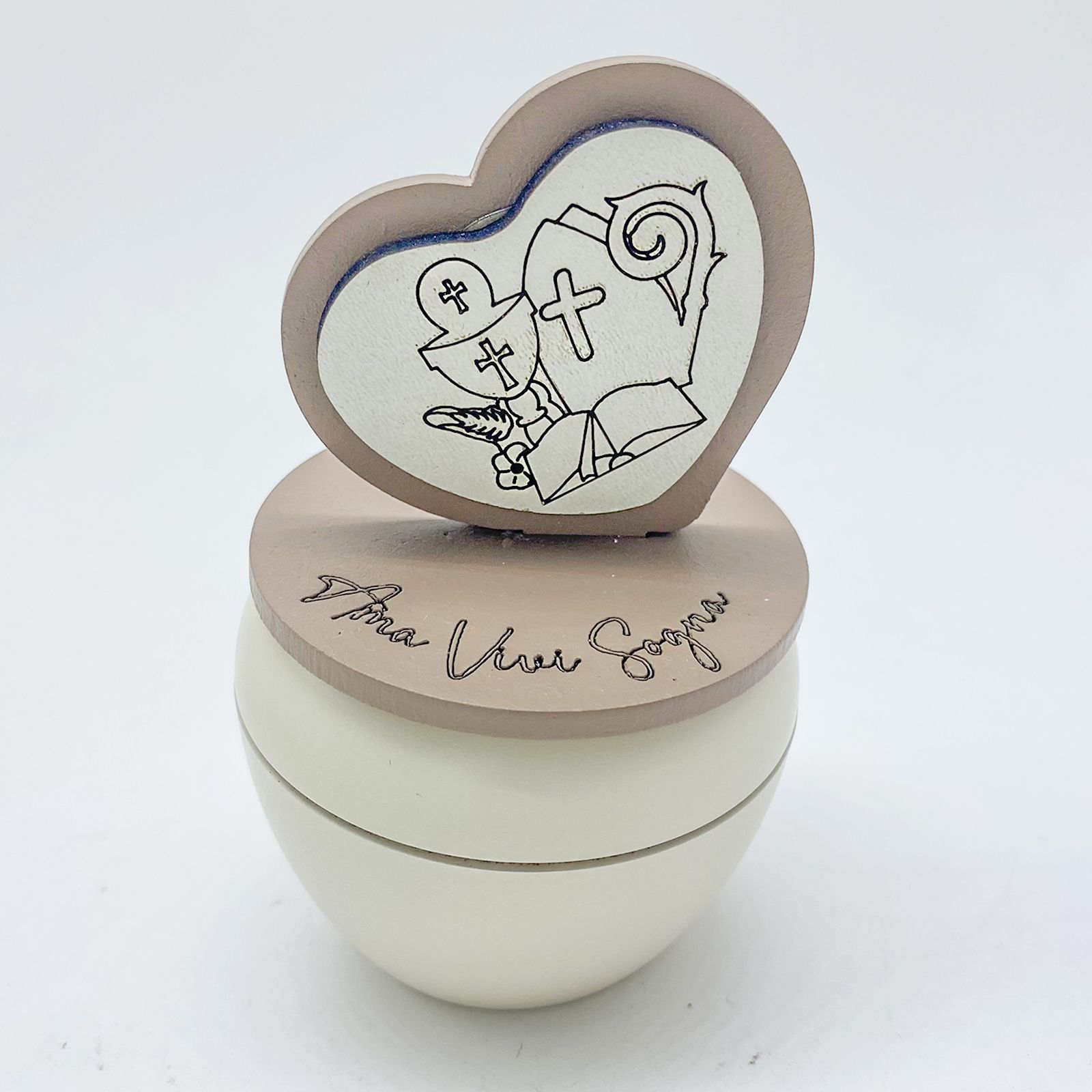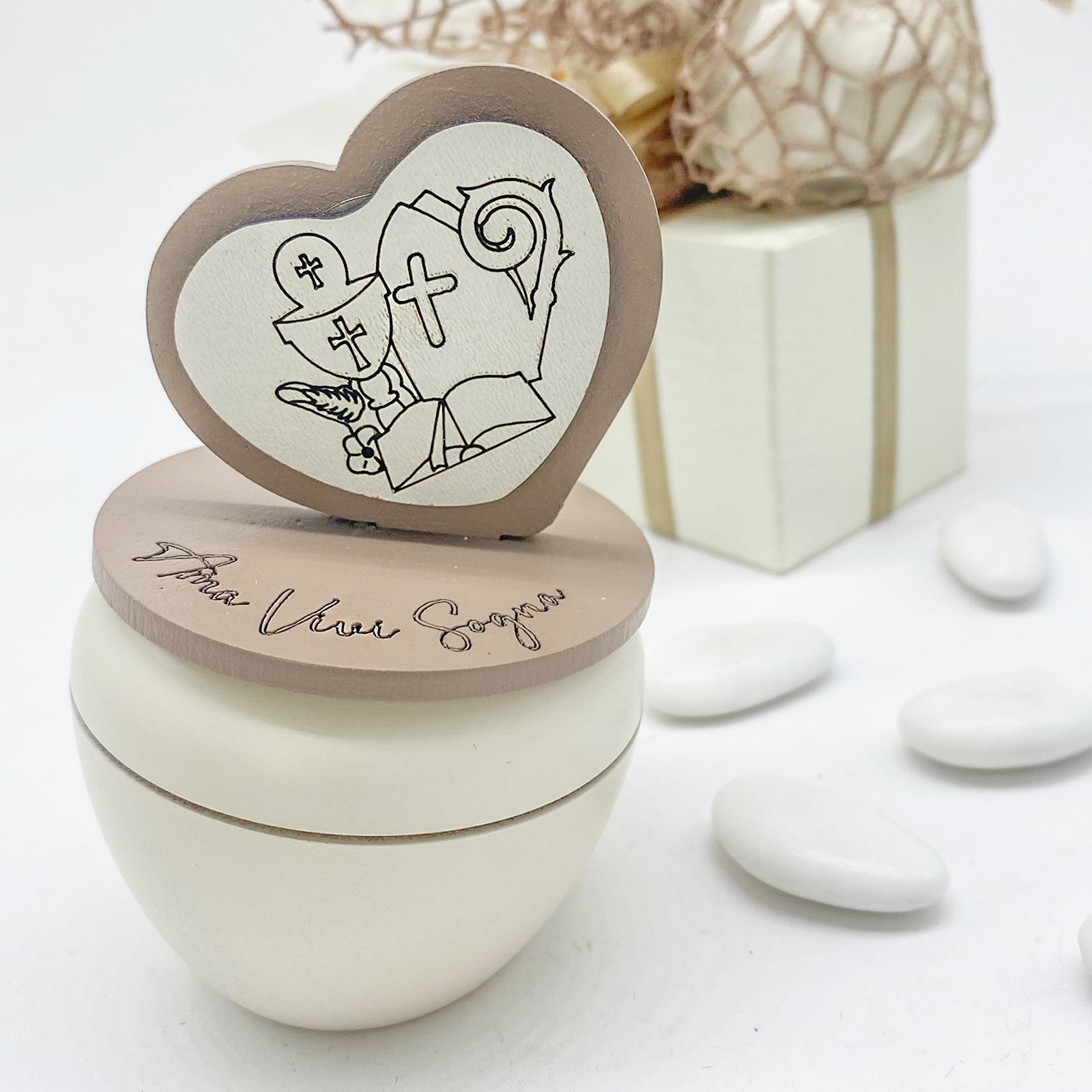 Festeggia Comunione e Cresima con una bomboniera davvero speciale! Il nostro portacandela, realizzato in plastica e legno, è decorato con un coperchio elegante che porta la scritta “ama, vivi, sogna” e un cuoricino con simboli sacri di comunione e cresima. Con dimensioni di 9 cm x 3 cm, è un pensiero originale e particolare per celebrare questi momenti importanti.