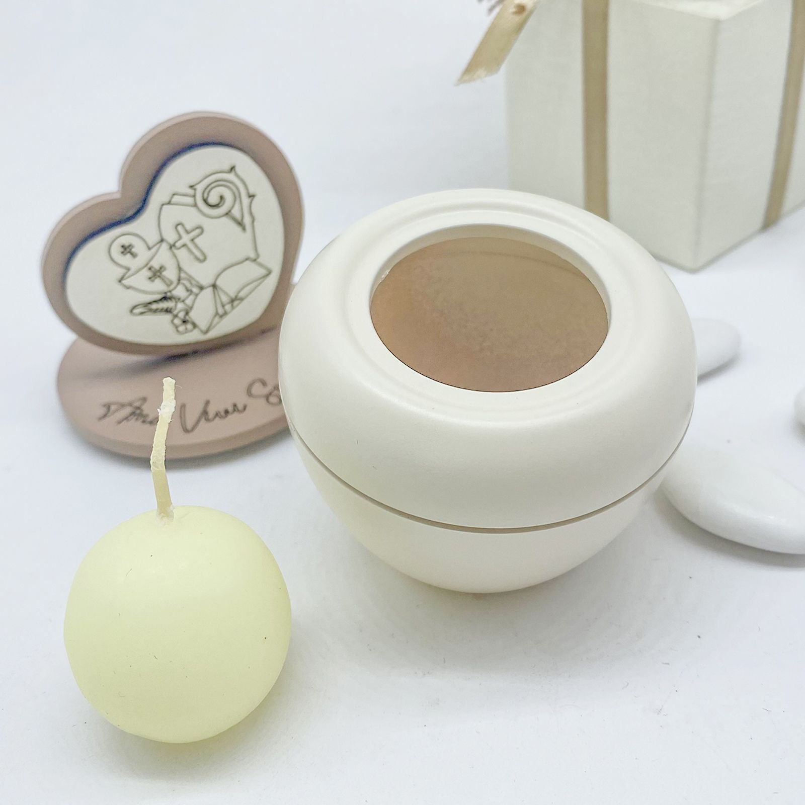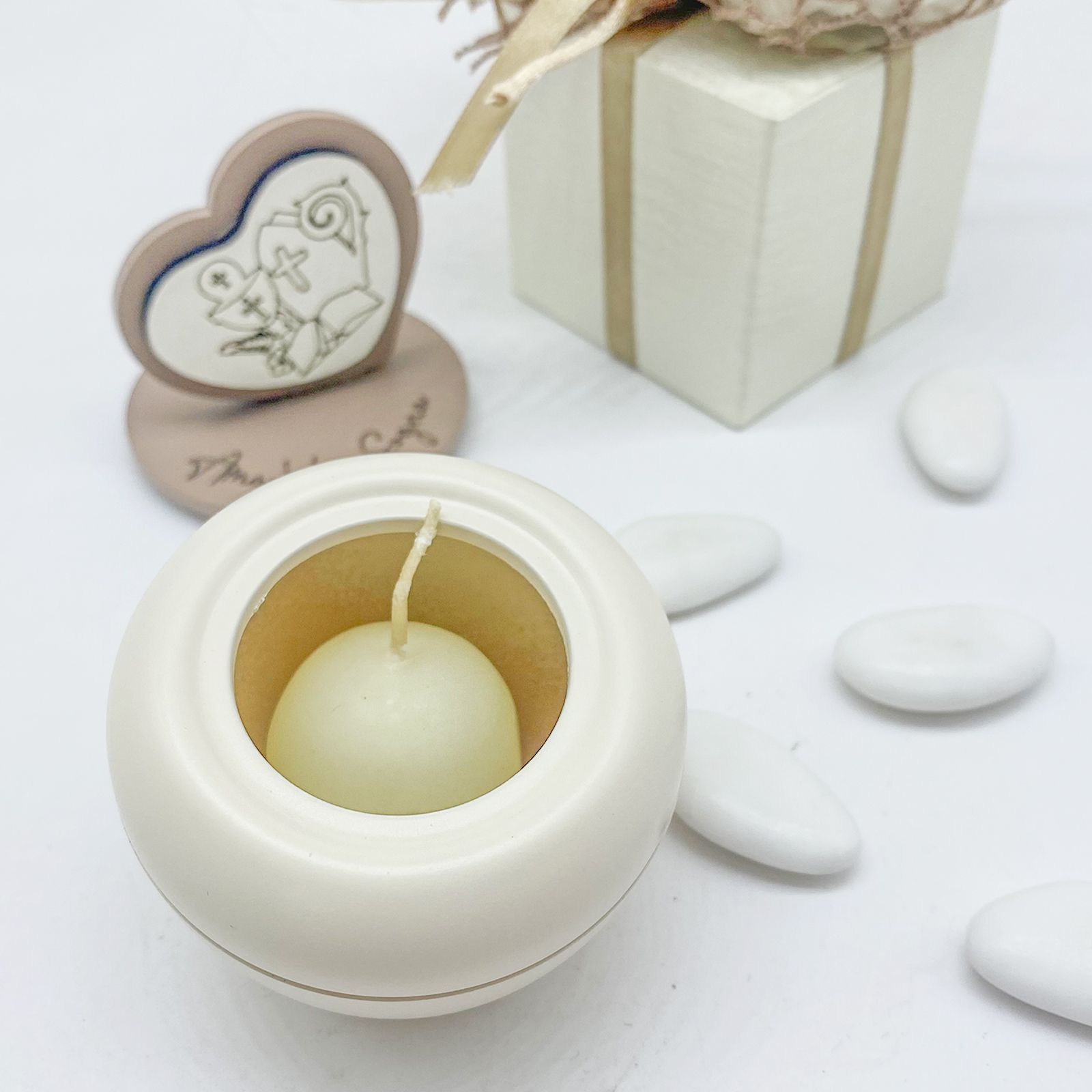 Il design in bianco e tortora aggiunge un tocco di raffinatezza, mentre la candela inclusa offre una nota di praticità. Questa bomboniera è una scelta completa e economica, perfetta per ogni ragazzo o ragazza che celebra questi eventi speciali.