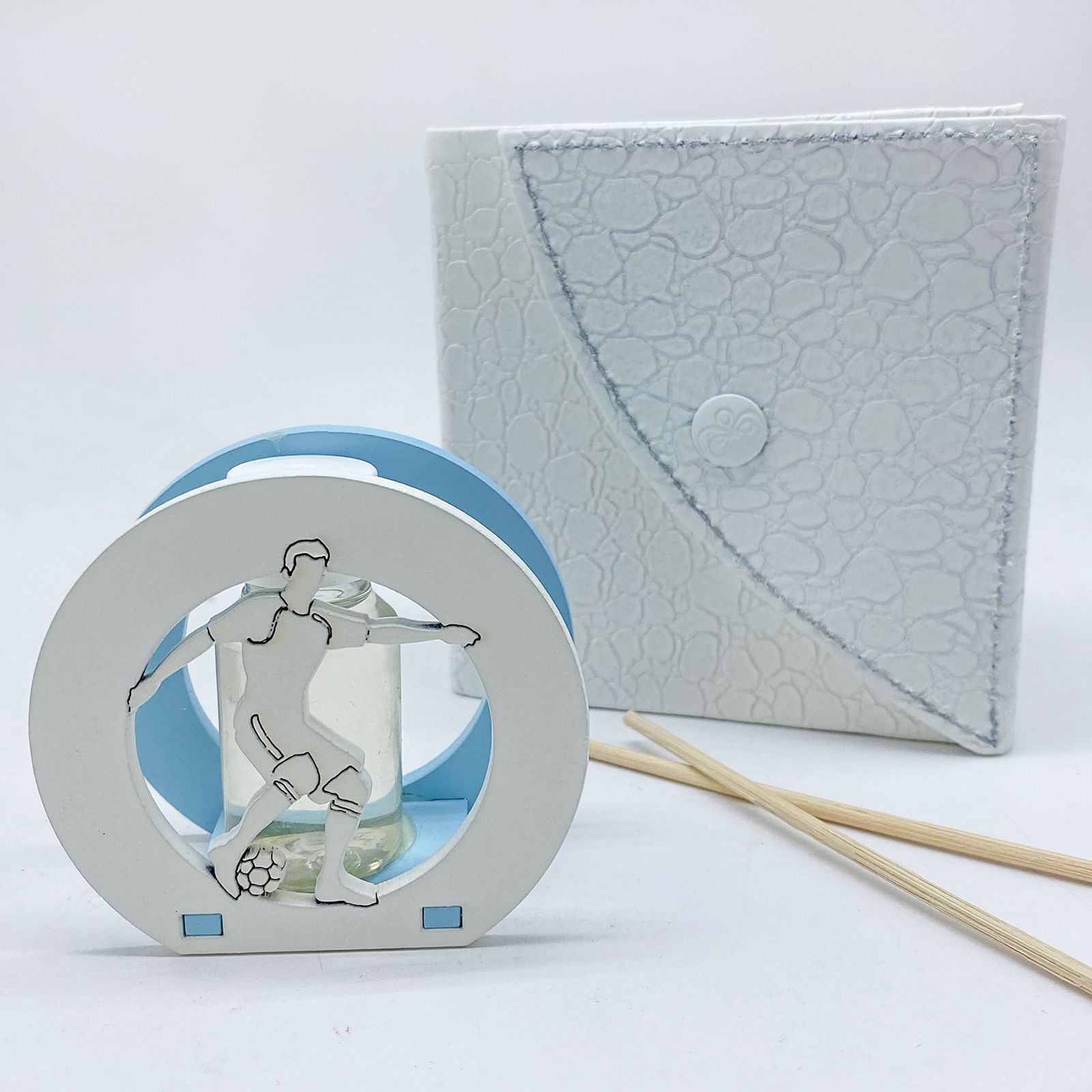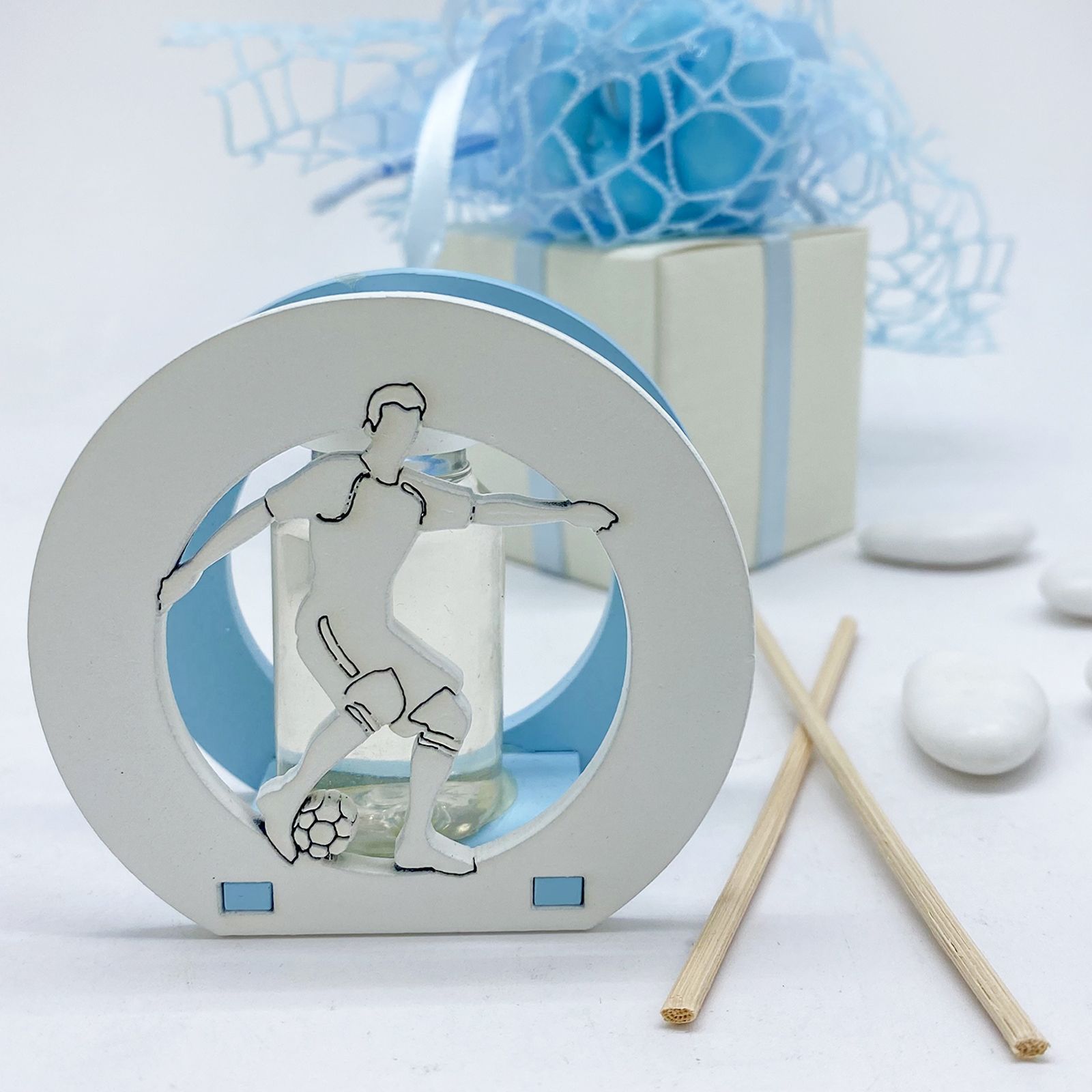 Stupire gli invitati alla comunione con una bomboniera che unisce eleganza e passione per il calcio è facile con il nostro diffusore di essenza. Questo esclusivo diffusore in legno rappresenta un omaggio raffinato e significativo per ogni occasione speciale.
