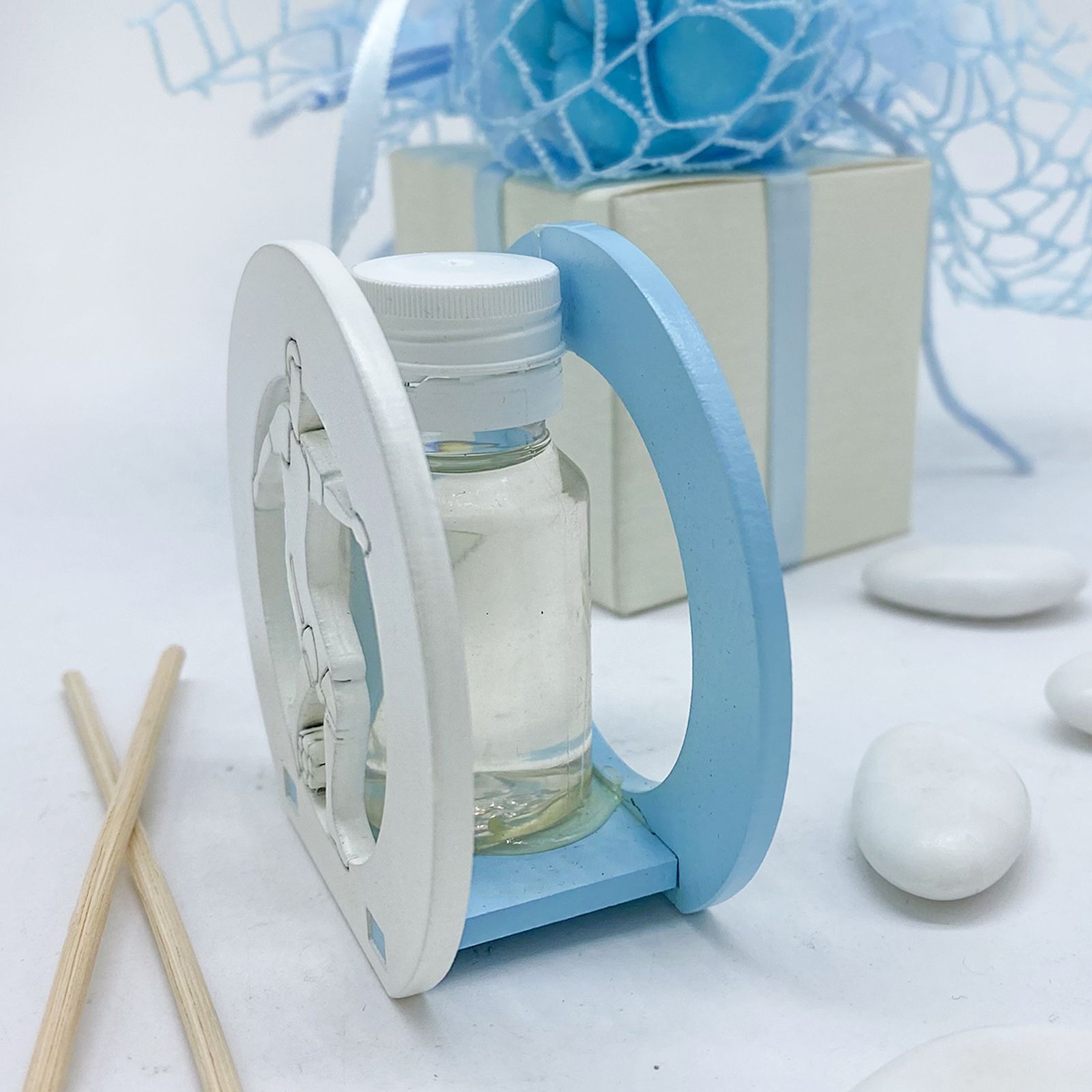Realizzato in legno di alta qualità, il diffusore è disponibile in due dimensioni: Standard (6 x 6 cm) e Grande (9 x 9 cm). La scelta del colore bianco e celeste aggiunge un tocco di delicatezza, perfetto per un evento come una comunione. Con l'acquisto, riceverai anche una scatola regalo elegante, bacchette e l’essenza inclusi, rendendo ogni dettaglio curato.