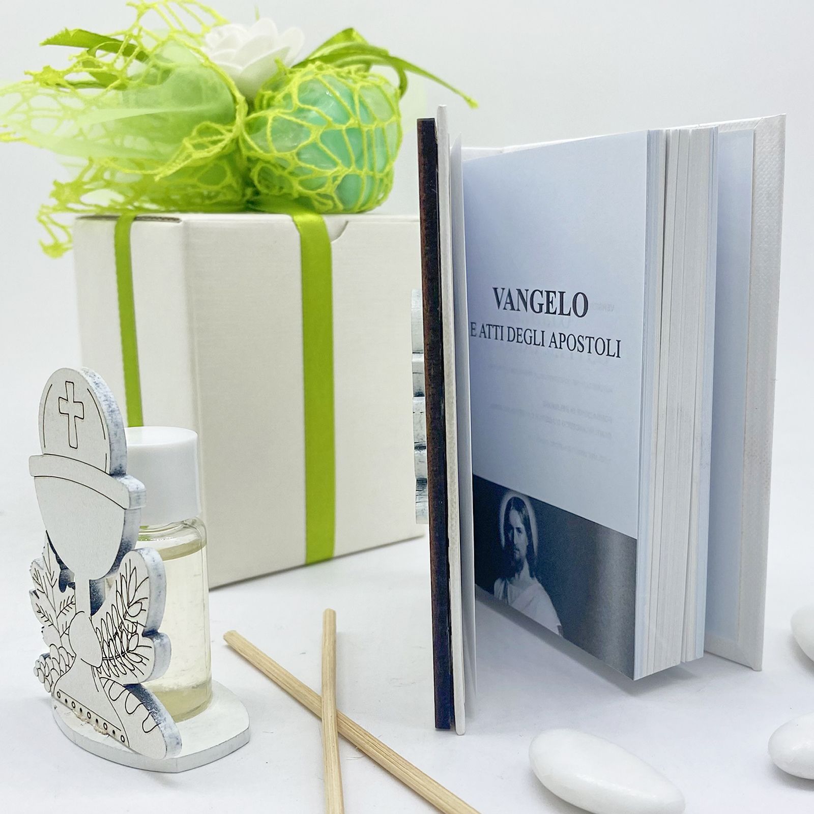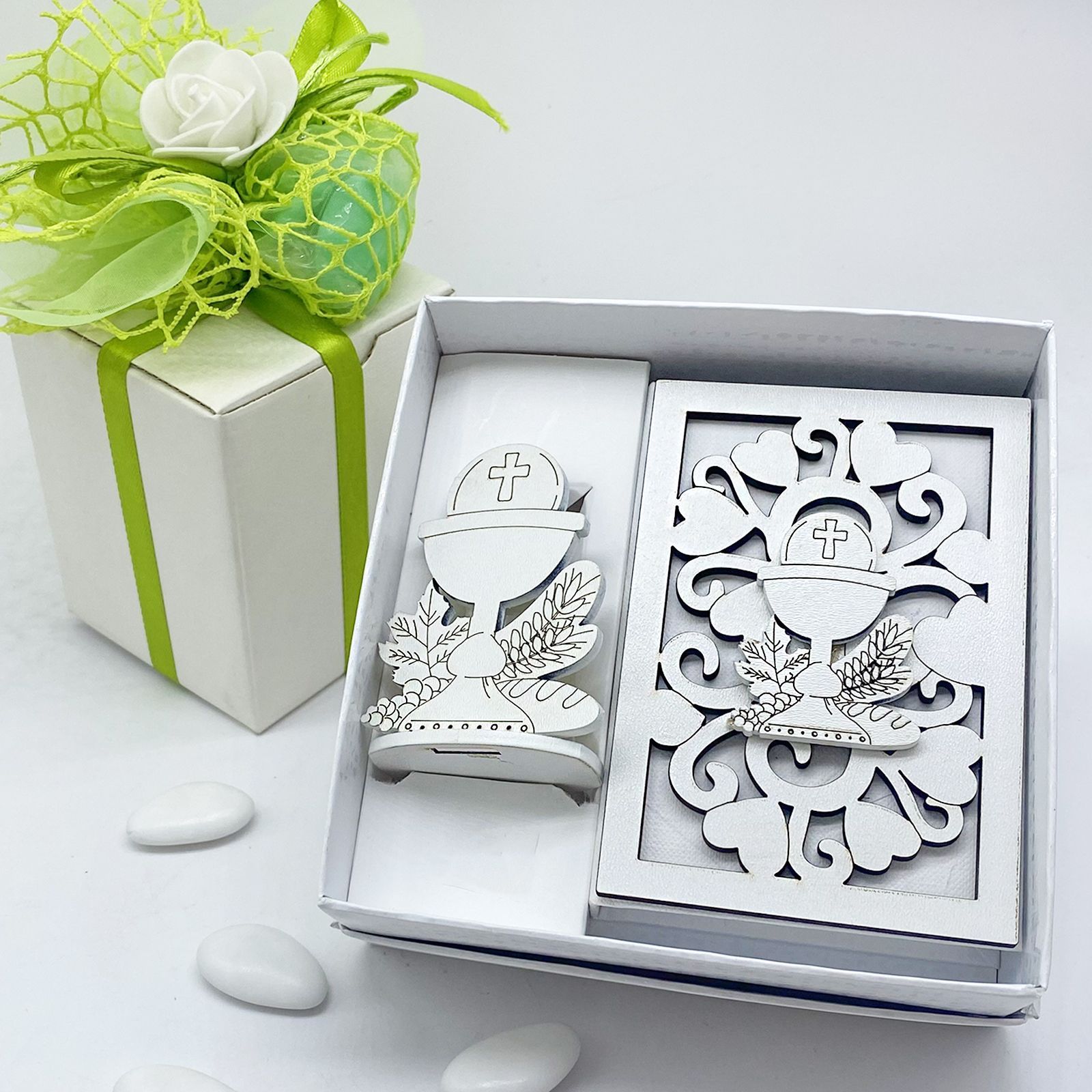 Perfetto per bambini e bambine, questo set è una bomboniera originale e raffinata, un ricordo unico per il giorno della comunione.