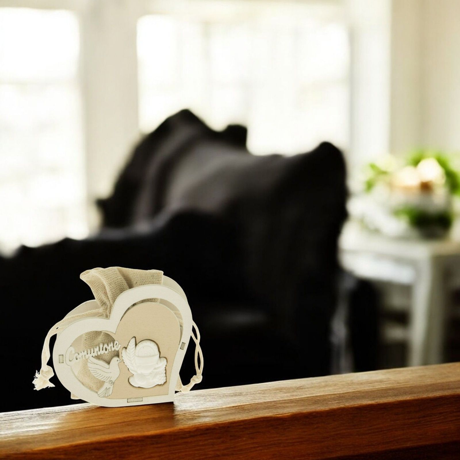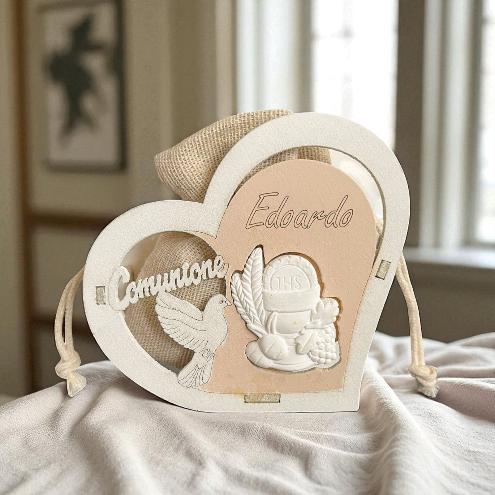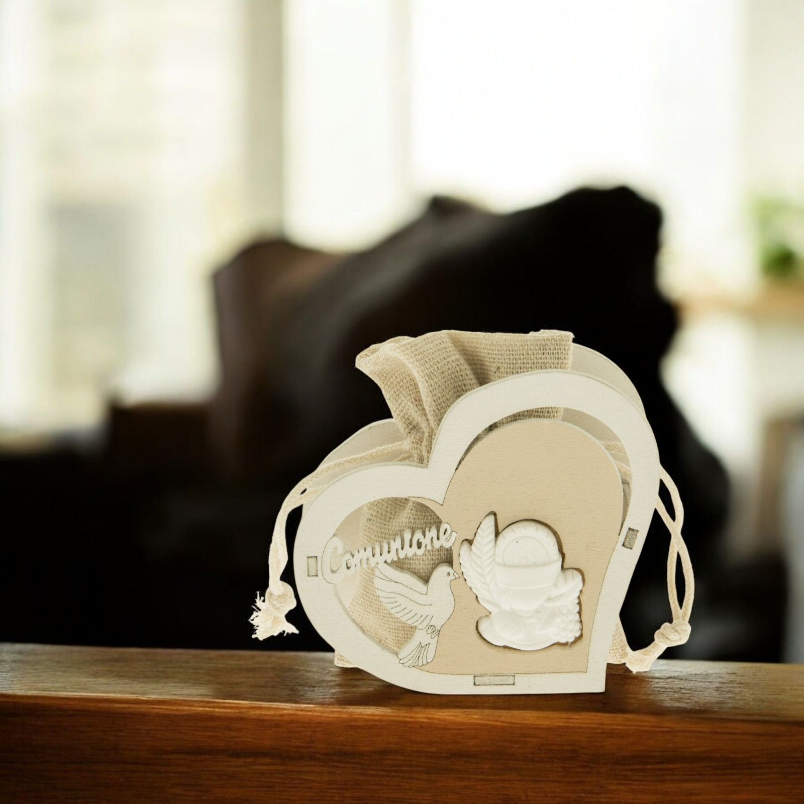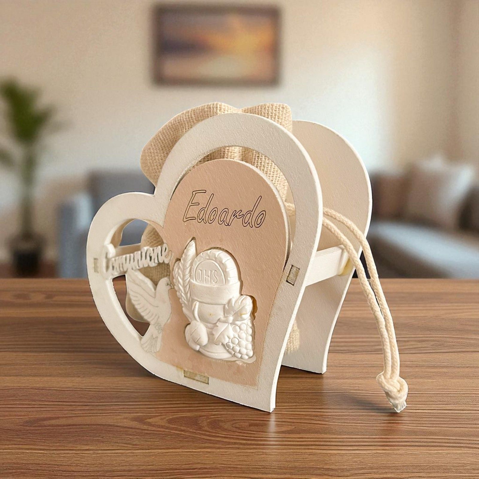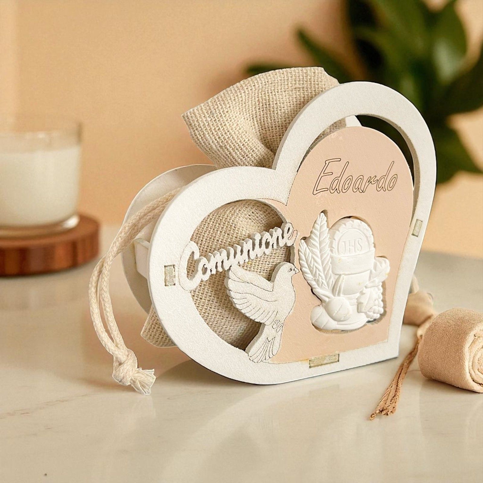 Questa scatolina portaconfetti a forma di cuore è la scelta ideale per celebrare la Prima Comunione di un bambino o di una bambina. Realizzata in legno, presenta simboli sacri come il calice, l’ostia e la colomba, insieme alla scritta “Comunione”, che ne esaltano il valore religioso e spirituale.