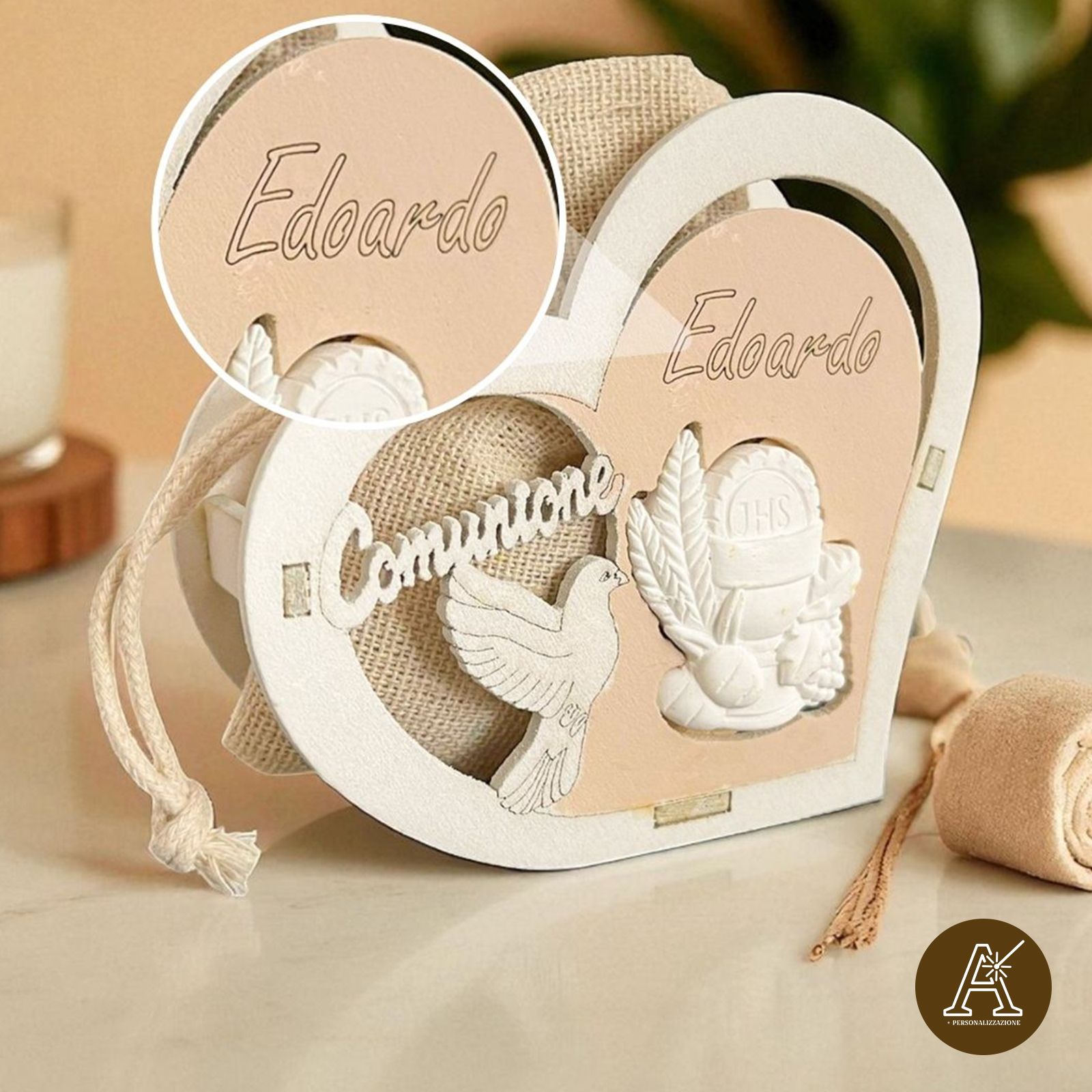 Per rendere la bomboniera ancora più esclusiva, è possibile scegliere la personalizzazione con incisione laser, aggiungendo il nome del festeggiato o della festeggiata e la data della Prima Comunione. Un dettaglio che trasforma questa scatolina in un ricordo unico e indelebile.