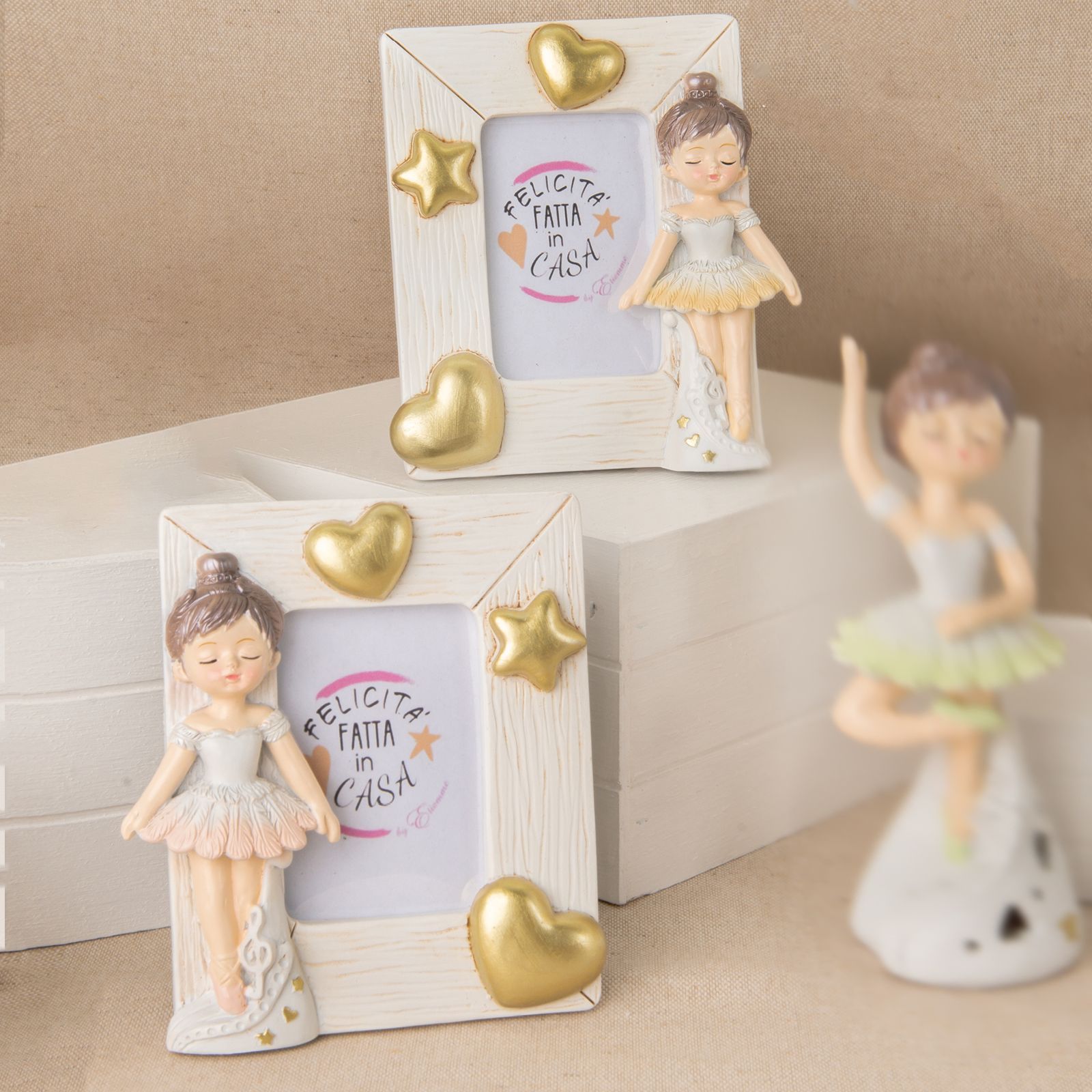 Il portafoto con ballerina assortita è un'idea originale e particolare per regalare ai tuoi invitati durante eventi speciali come battesimi, compleanni e comunioni. Realizzato in resina di alta qualità, questo portafoto dal design elegante e raffinato è decorato con stelline e cuoricino color oro su sfondo panna.