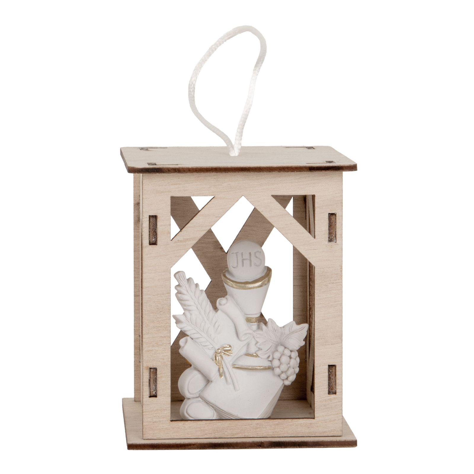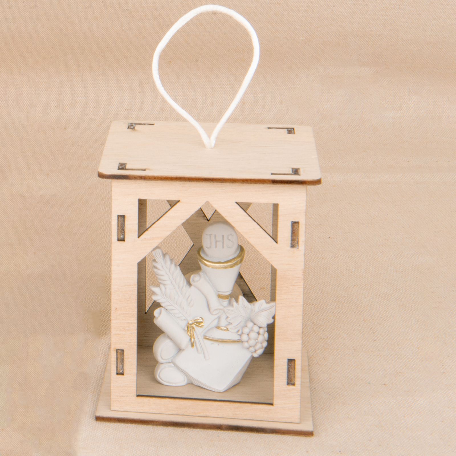 Questa Lanterna LED con simboli sacri è il regalo perfetto per celebrare la Prima Comunione del tuo bambino o della tua bambina. Realizzata in legno e resina, ha dimensioni di circa h. 10 cm e presenta dei dettagli color oro su sfondo bianco.