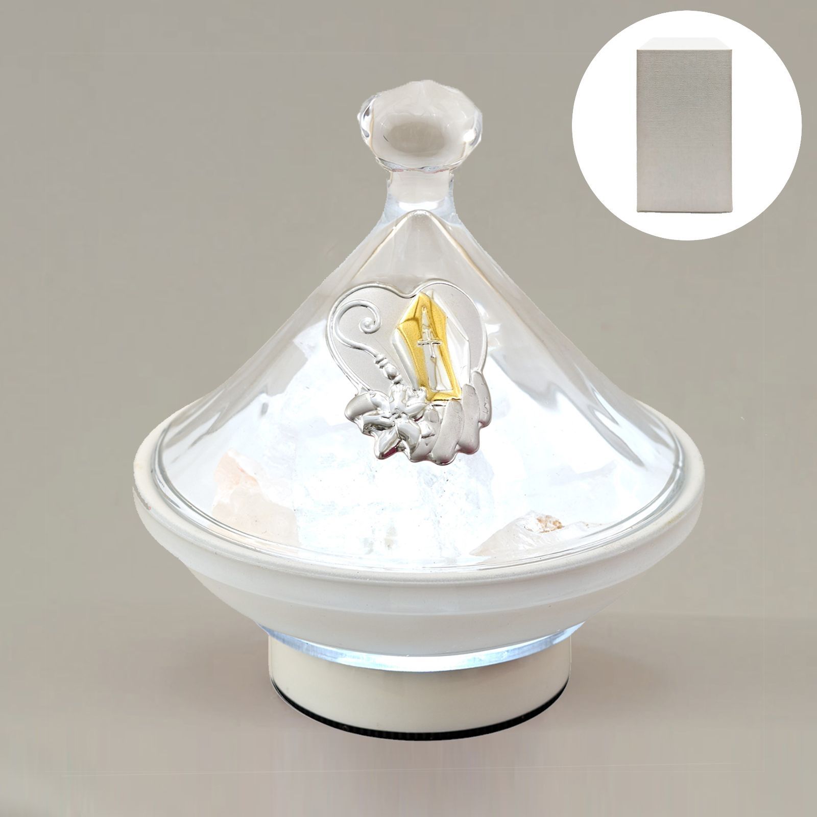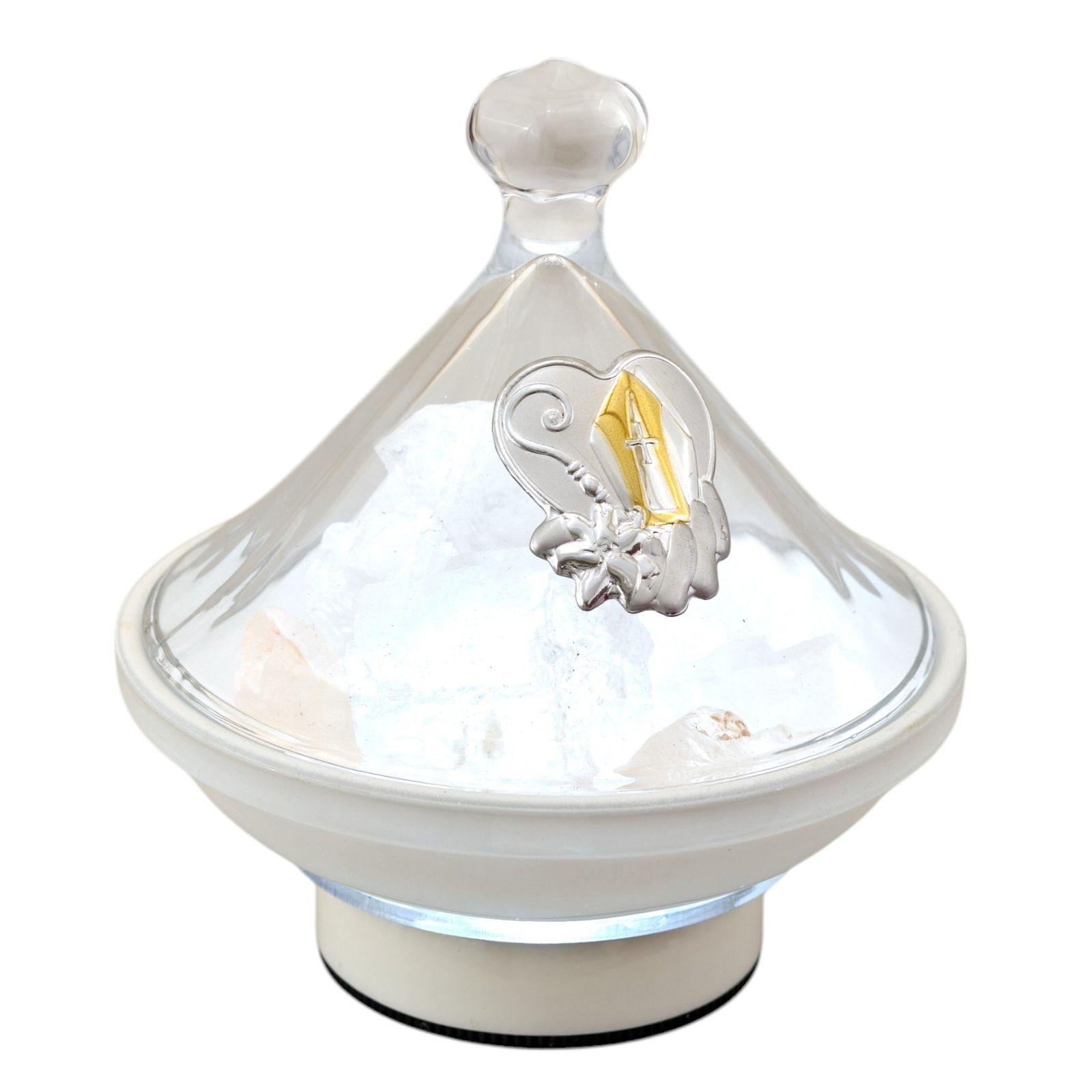 Per un'occasione così importante come la cresima, la lampada con sale bianco dell'Himalaya a forma di trullo è una bomboniera originale e particolare che rappresenta il perfetto equilibrio tra eleganza e spiritualità. Con la sua delicata forma e la placchetta con i simboli sacri, tra cui il pastorale e il cappello del vescovo, questa lampada diventa un omaggio speciale e carico di significato, ideale per celebrare la sacralità della cresima.