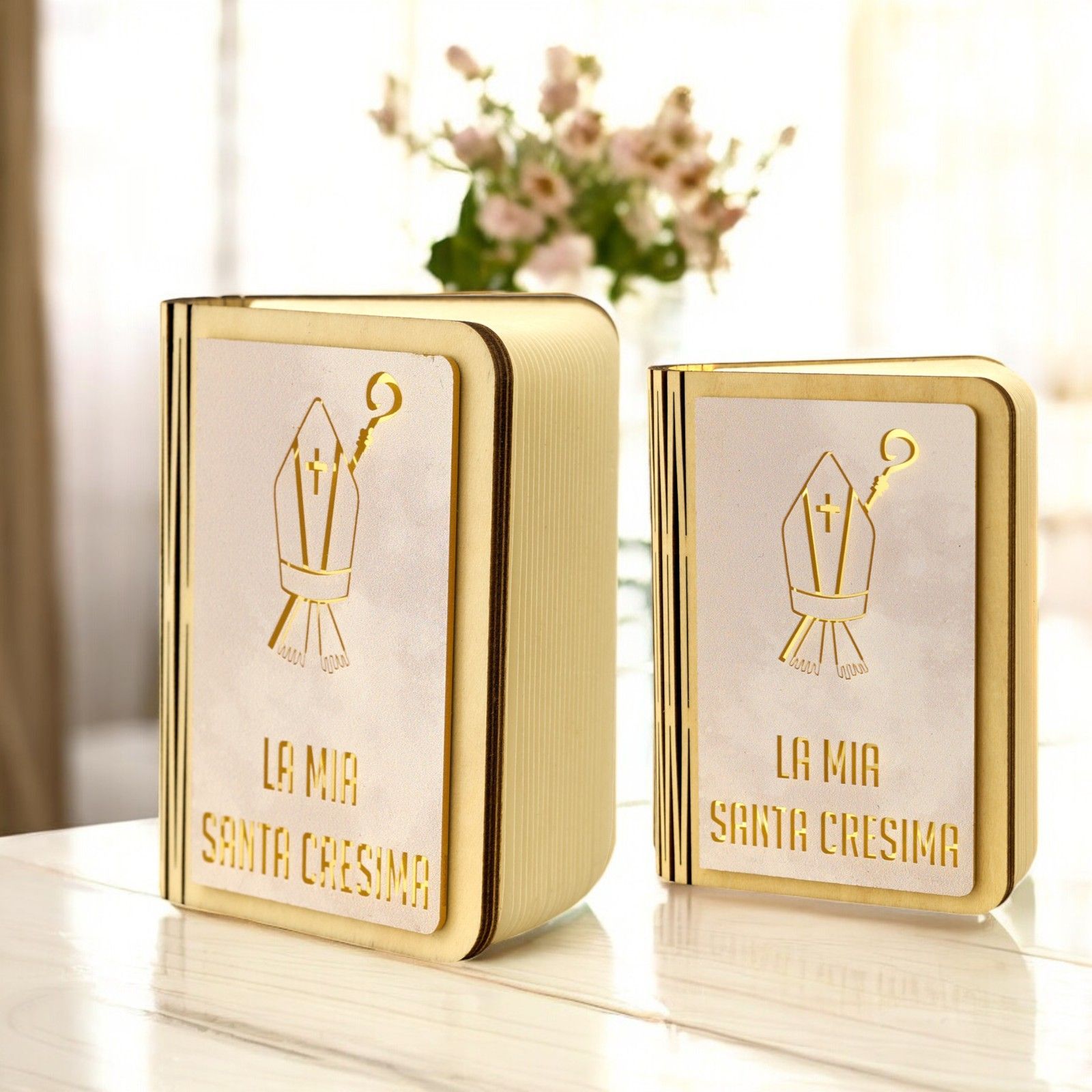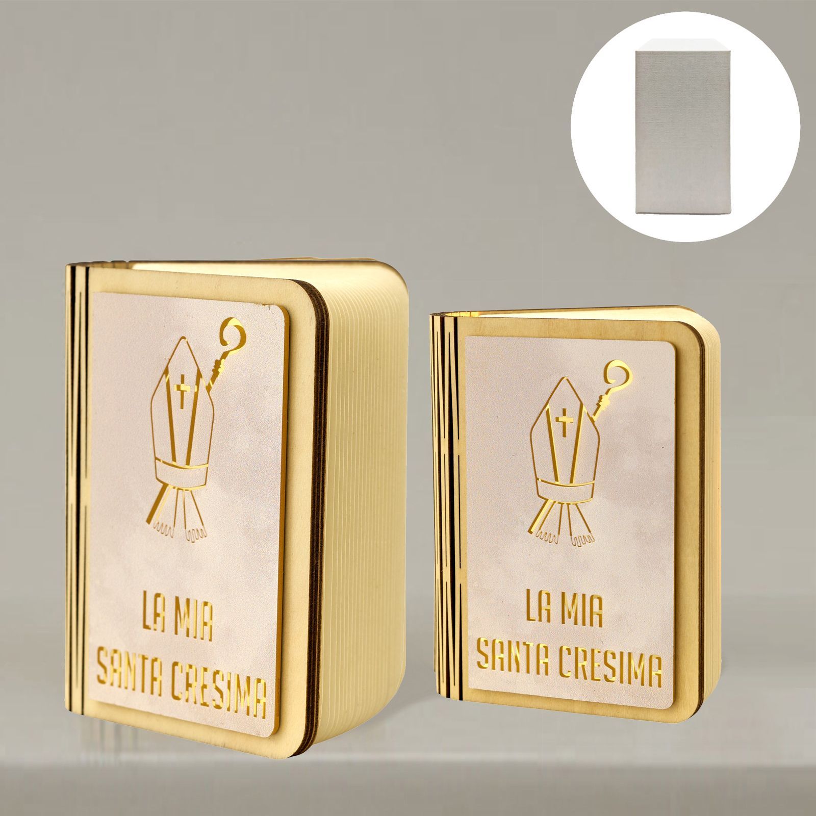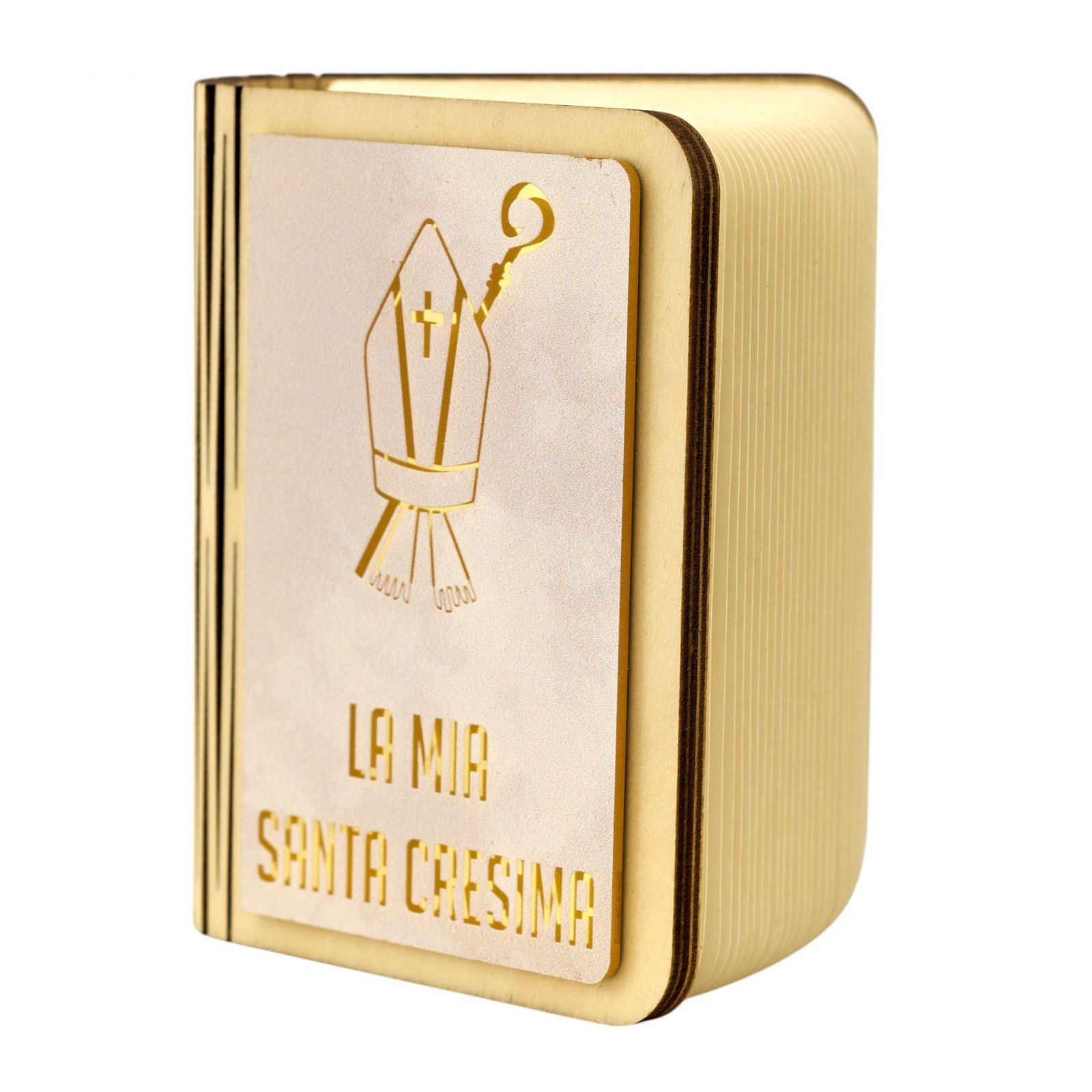 Un simbolo perfetto per celebrare il sacramento della Cresima: la lampada a forma di libro con copertina decorata dai simboli della Cresima e la scritta “La mia Santa Cresima”. Un regalo speciale per commemorare un momento di fede e crescita spirituale, perfetto per essere utilizzato come bomboniere ragazzo o bomboniere ragazza, che gli invitati ricorderanno con affetto.
