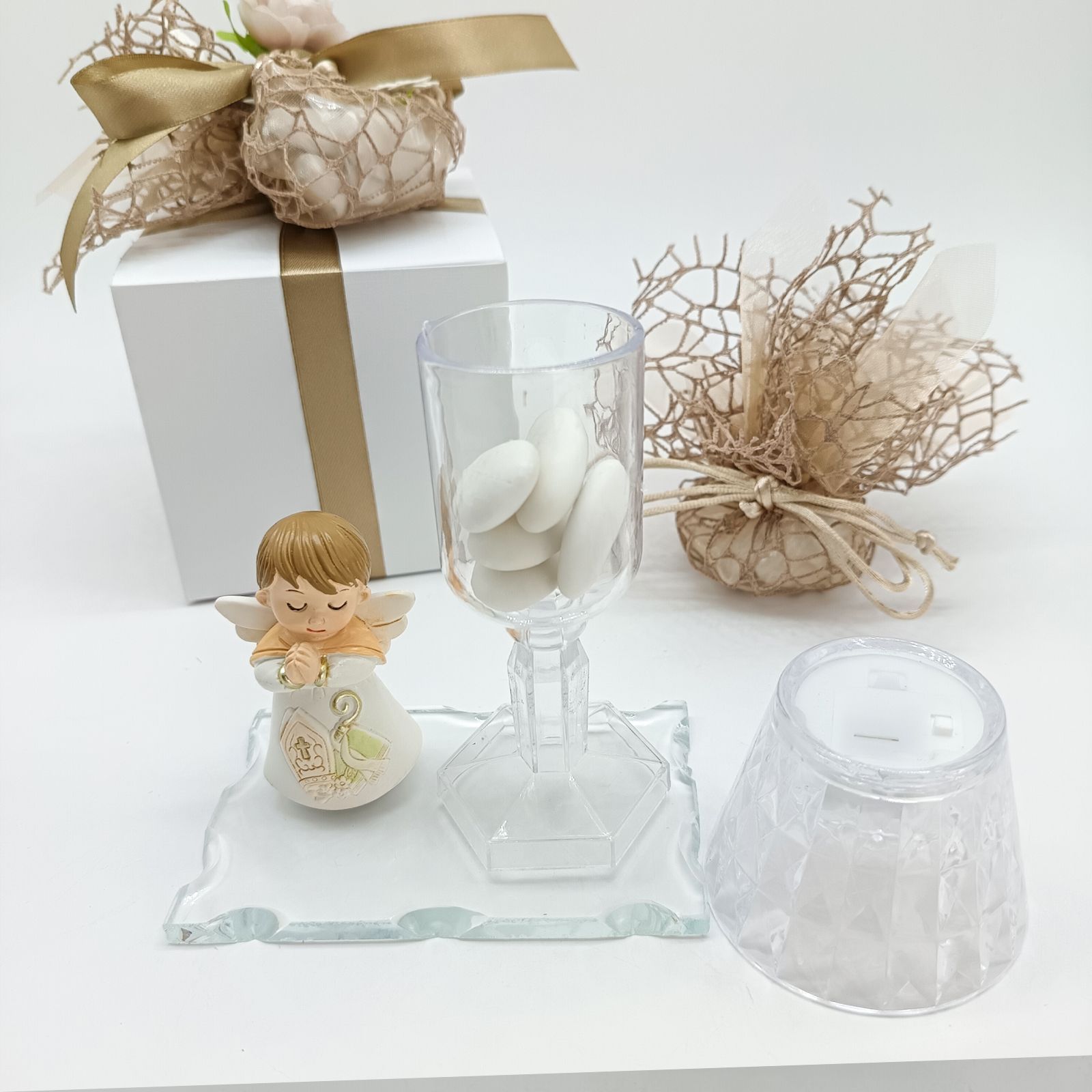 Questa bomboniera unisce bellezza e funzionalità grazie al lumetto di 6,5x6,5x11,5 cm, perfetto per creare un’atmosfera calda e raccolta. Il tenero angioletto in resina (7x4x3 cm) aggiunge un tocco di spiritualità e dolcezza.