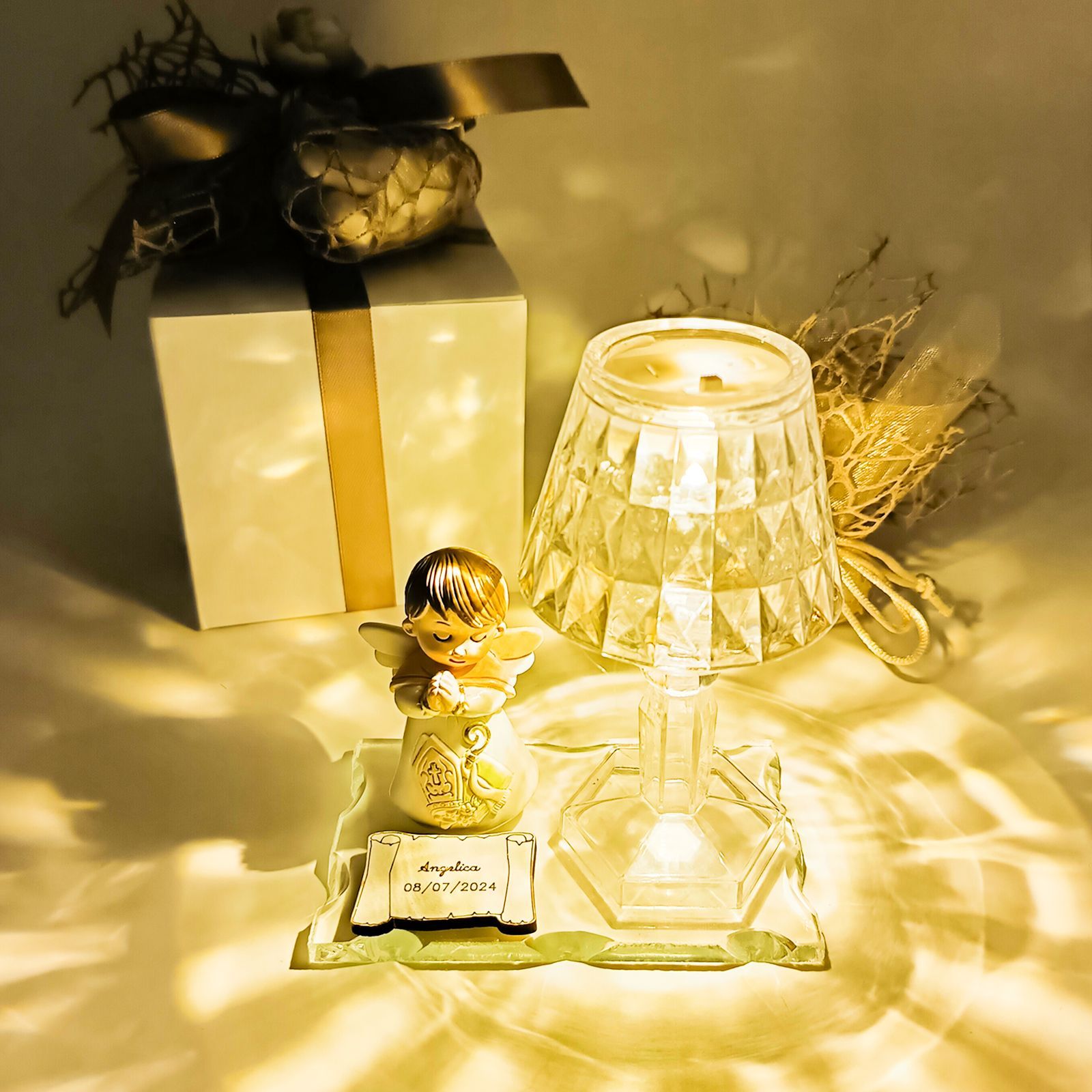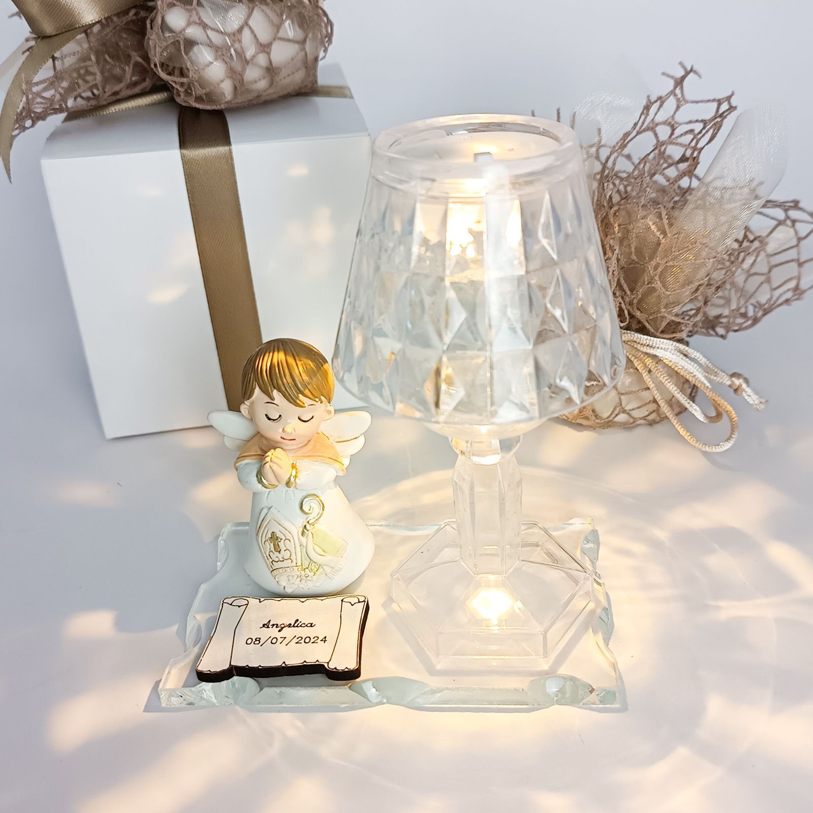 Elegante base in vetro con lumetto in plexiglass, impreziosita da un dolce angioletto con vestito decorato con simboli sacri della santa cresima. Un oggetto raffinato dai colori pastello, ideale per rendere unico questo momento speciale.