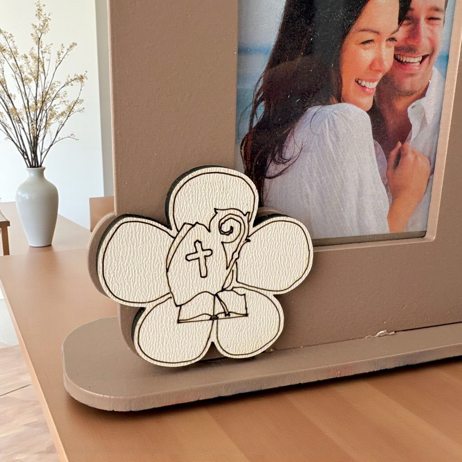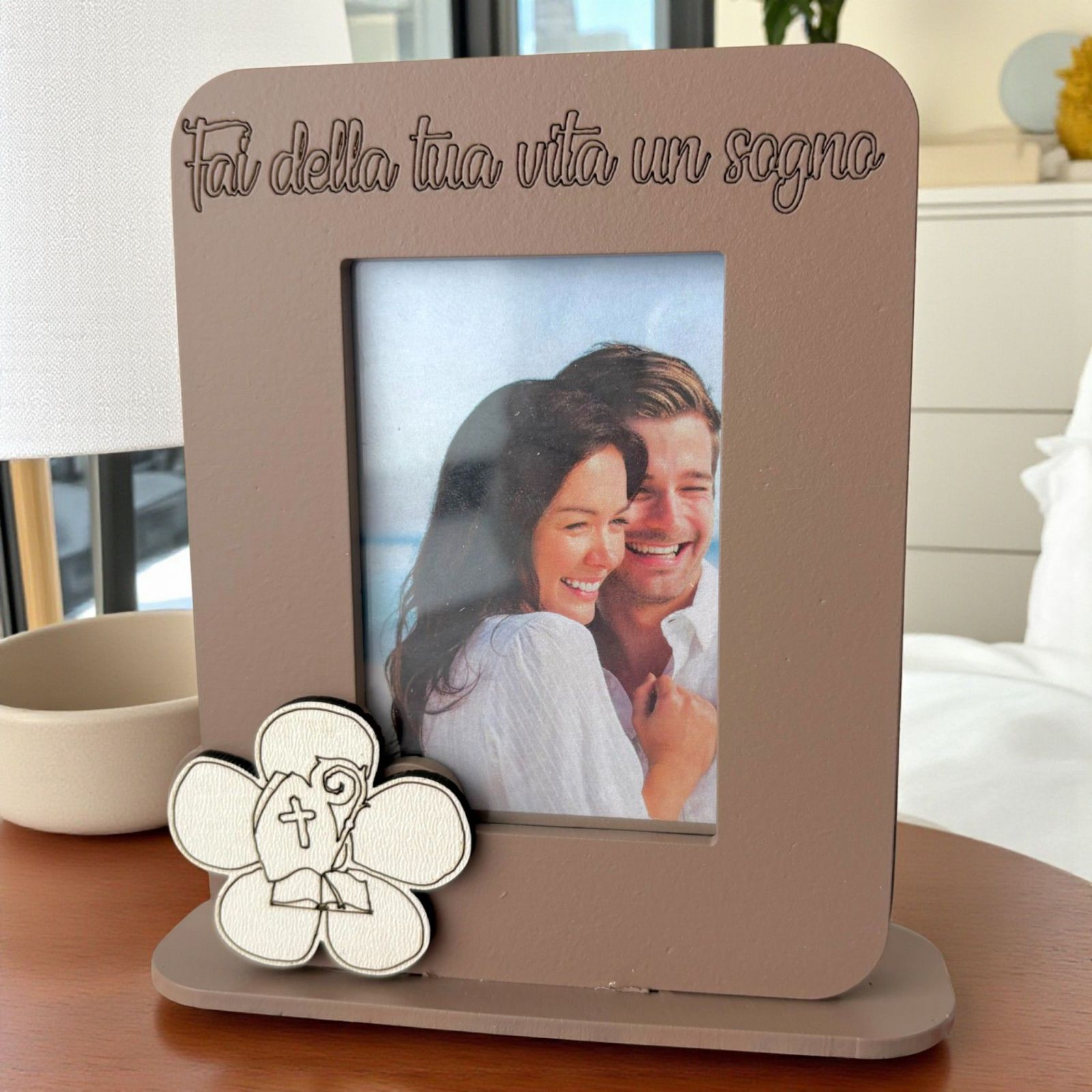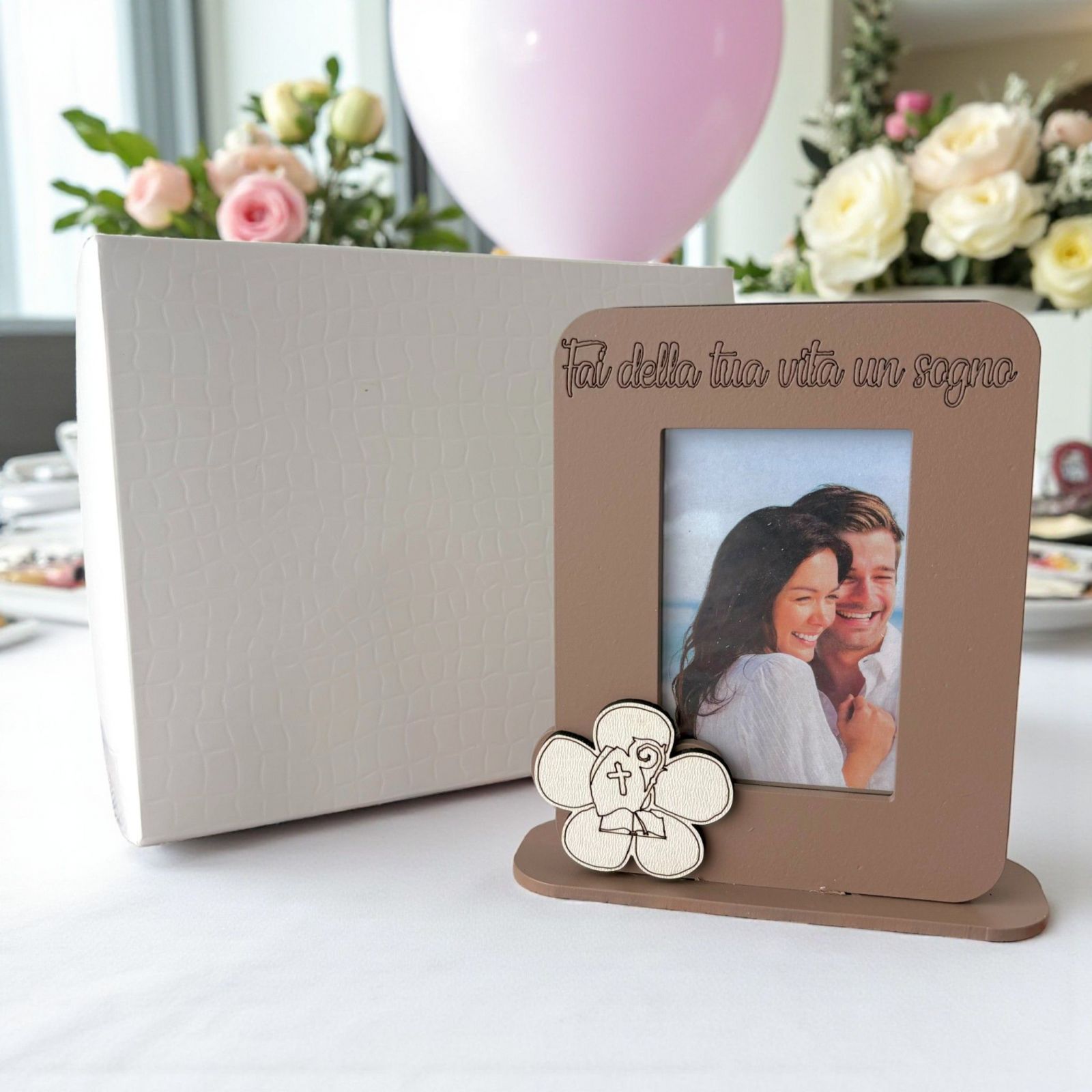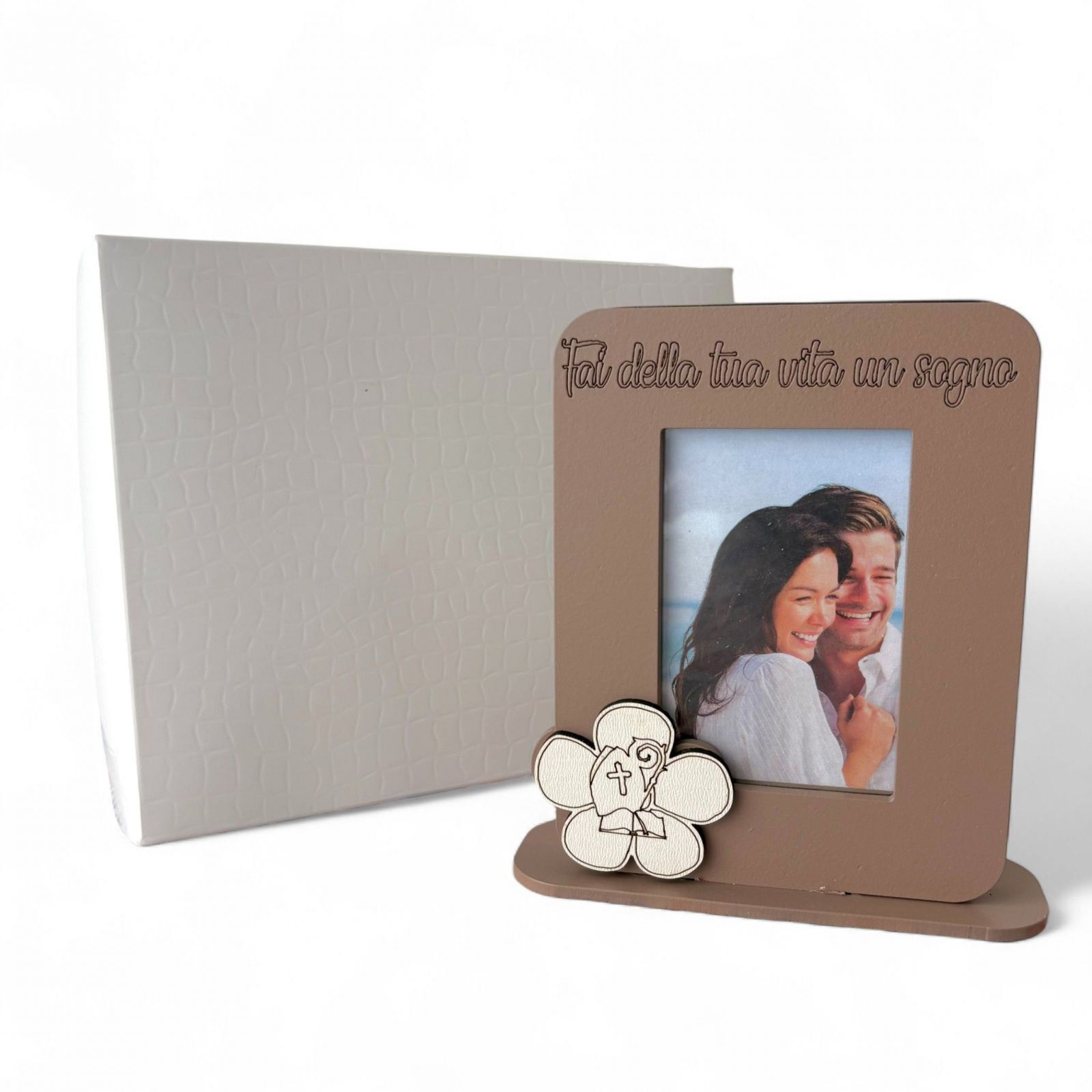Scopri la nostra incantevole bomboniera cresima: un elegante portafoto in legno color tortora, adornato da un delicato fiore che incornicia i simboli sacri della Santa Cresima e frase "Fai della tua vita un sogno". Questo oggetto non è solo un semplice portafoto, ma un vero e proprio custode di ricordi preziosi, un omaggio alla spiritualità e alla crescita del tuo giovane festeggiato. Ogni volta che lo guarderà, potrà rivivere l'emozione di quel giorno speciale, sentendosi avvolto dall'amore e dalla benedizione di chi lo circonda.