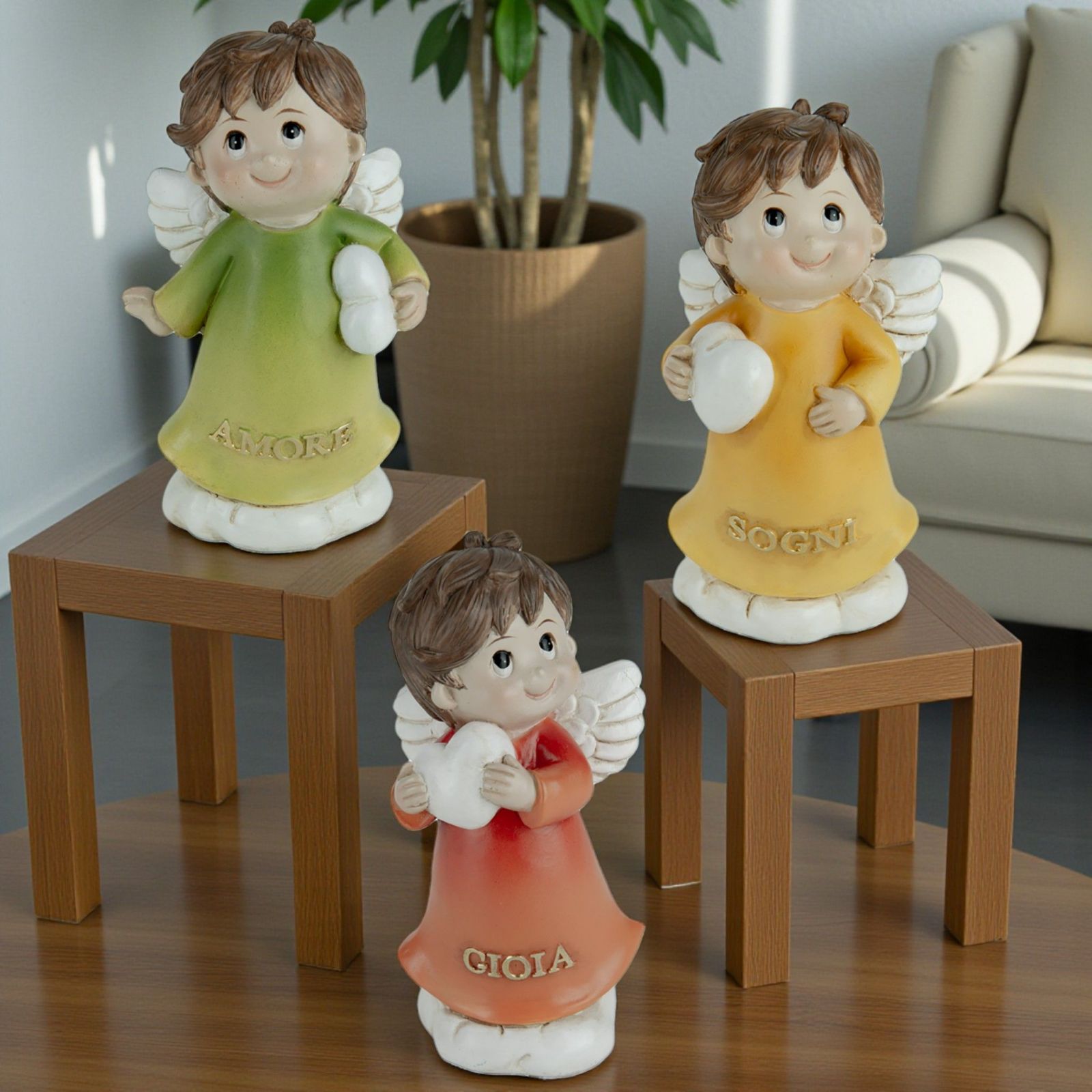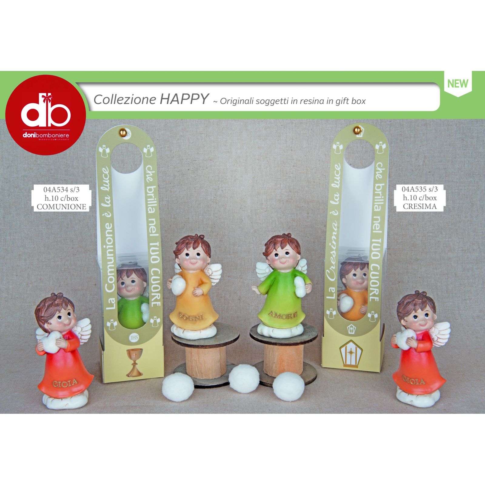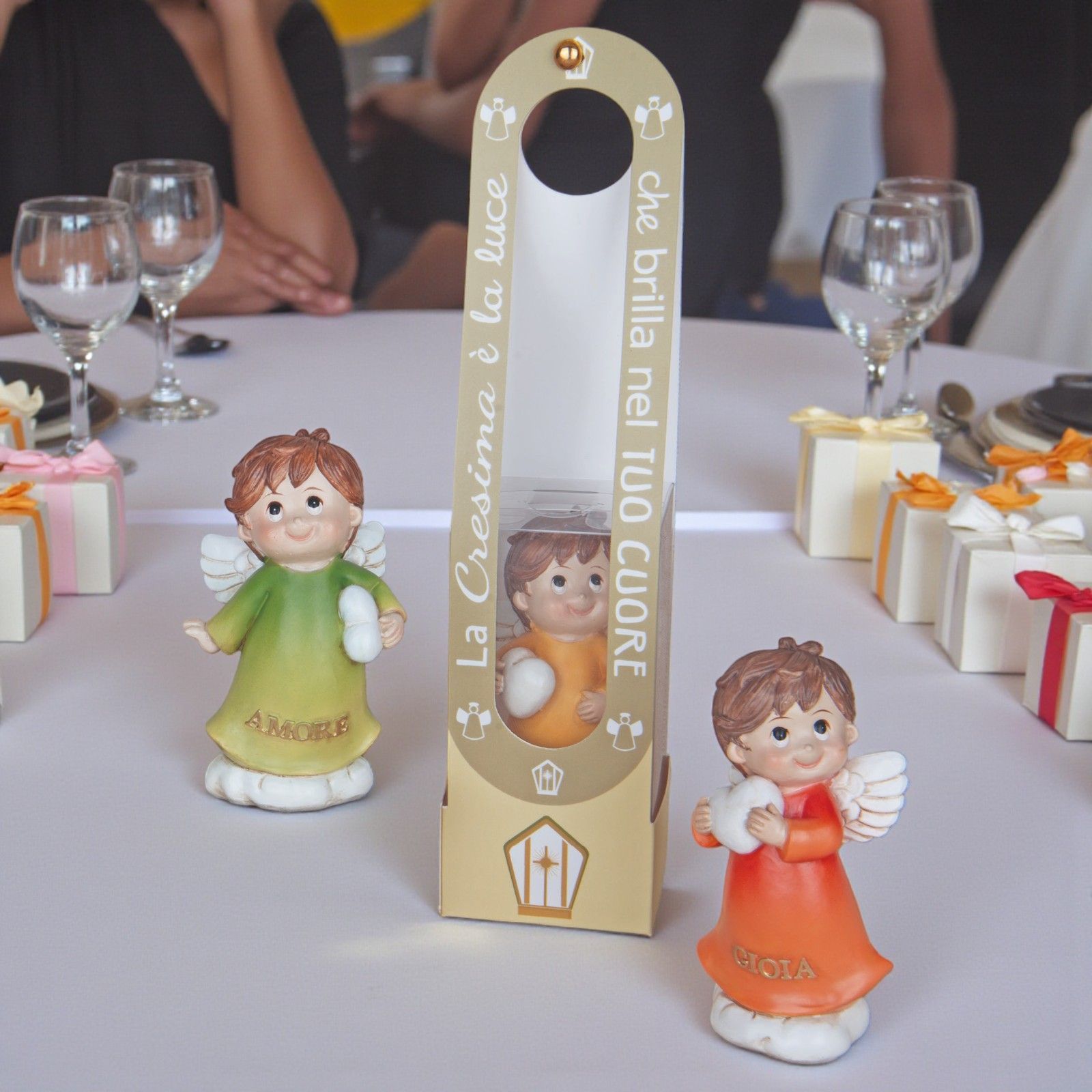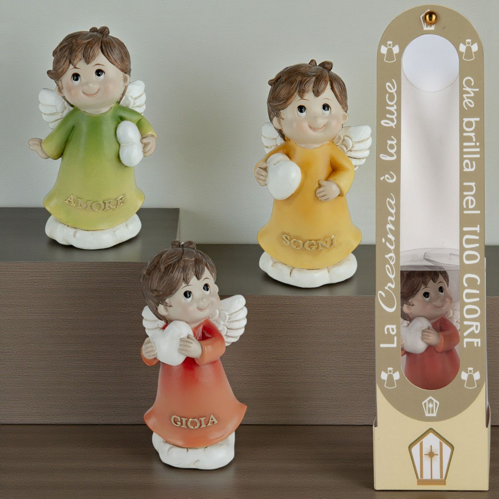 Sfavilla di significato questa raffinata bomboniera dedicata alla Santa Cresima, una dolce statuina in resina che raffigura un angioletto con il cuore tra le mani. Assortita in tre varianti colore — verde, giallo e arancio — e accompagnata dalle parole Gioia, Amore e Sogni, diventa un ricordo emozionante per sorprendere con stile invitati di ogni età.