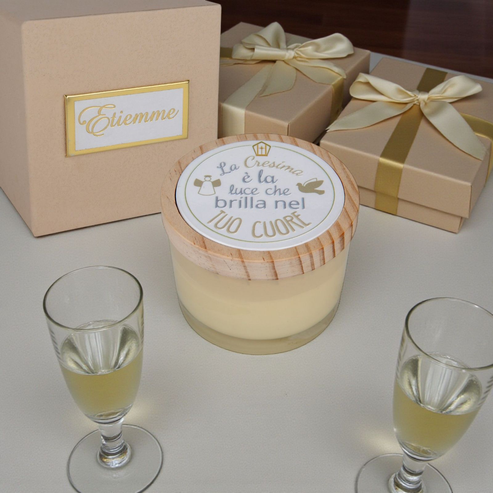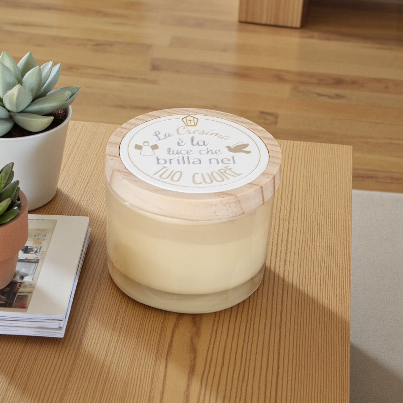 Accogli i tuoi invitati con una bomboniera unica, il nostro portacandela in vetro con tappo in legno. Con la delicata scritta "La Cresima è la luce che brilla nel tuo cuore", questa idea bomboniera diventa un simbolo speciale della Santa Cresima, capace di trasmettere emozione e gratitudine a chi partecipa a questo momento importante.