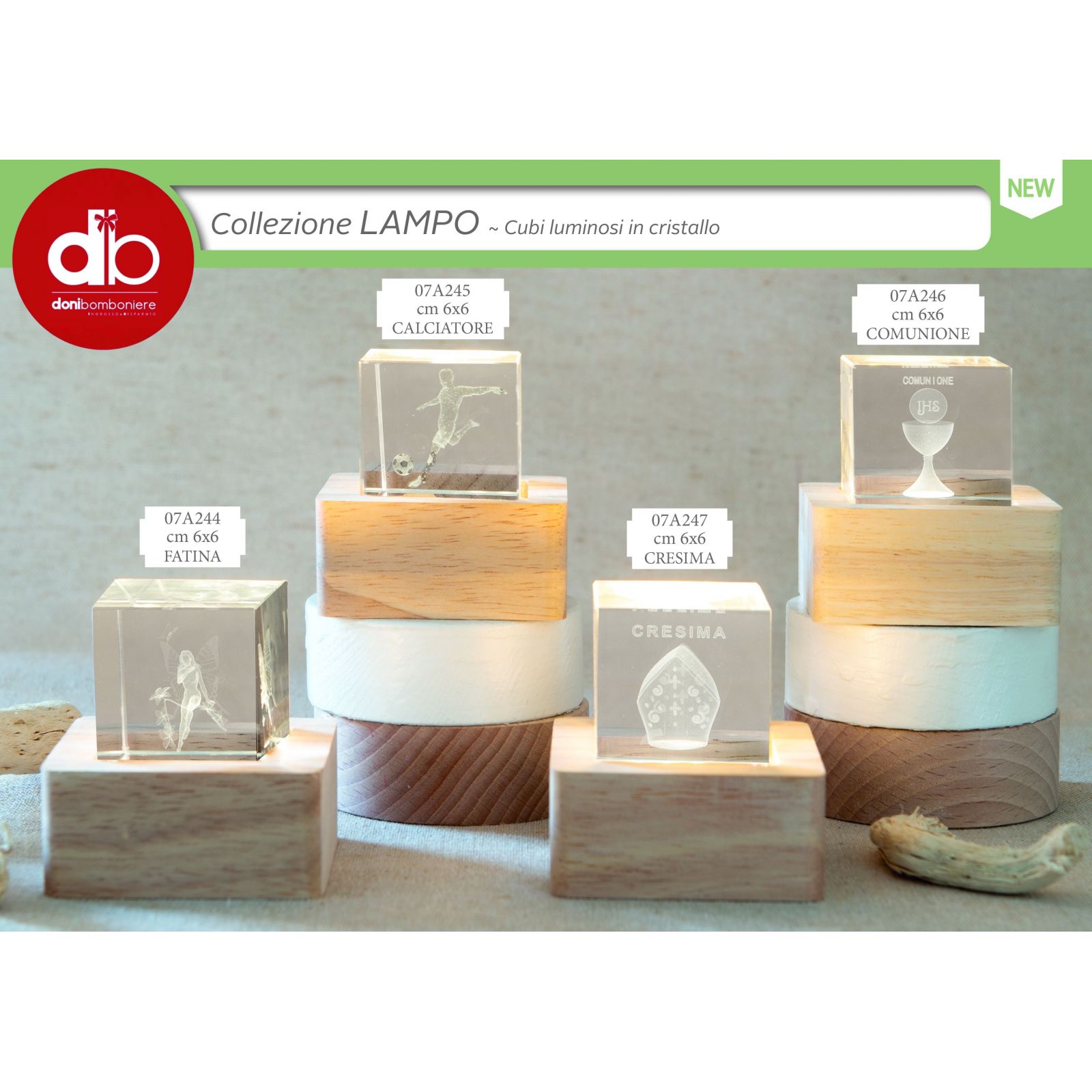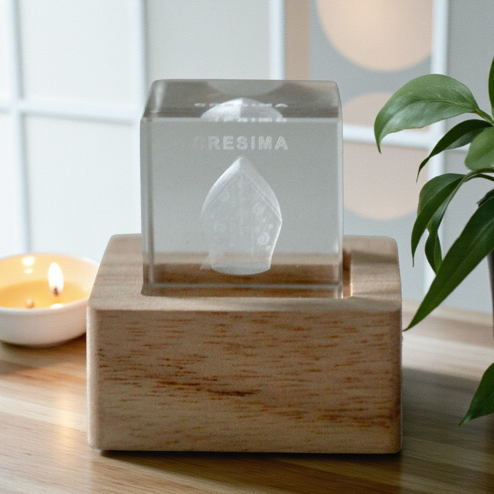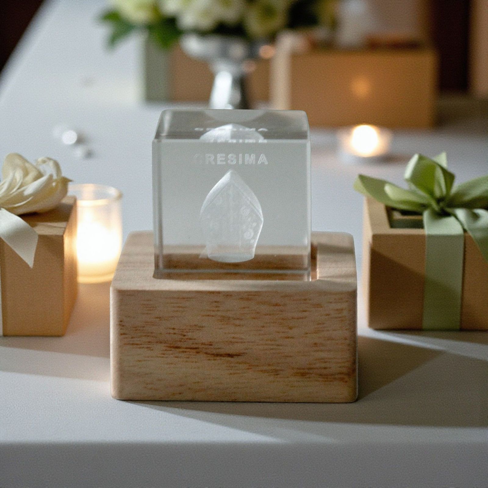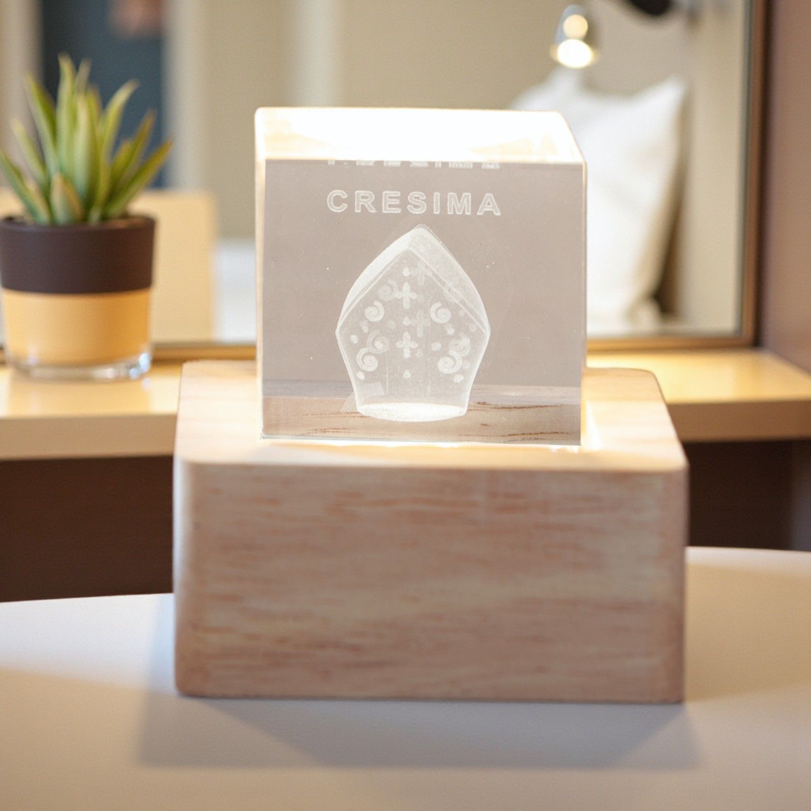 Rendi la Cresima ancora più speciale con questo cubo luminoso in cristallo che racchiude un cappello del vescovo con la scritta "Cresima". Grazie al LED integrato nella base in legno naturale, il simbolo brilla dolcemente, trasformando la bomboniera in un piccolo ricordo luminoso e significativo per ogni invitato. Perfetta come bomboniere cresima ragazzo, bomboniere cresima ragazza o bomboniere cresima sacre.