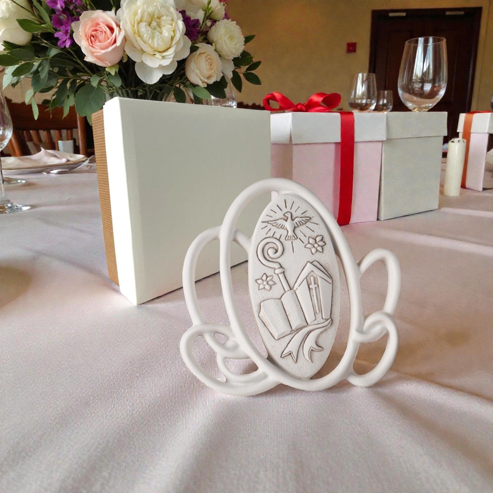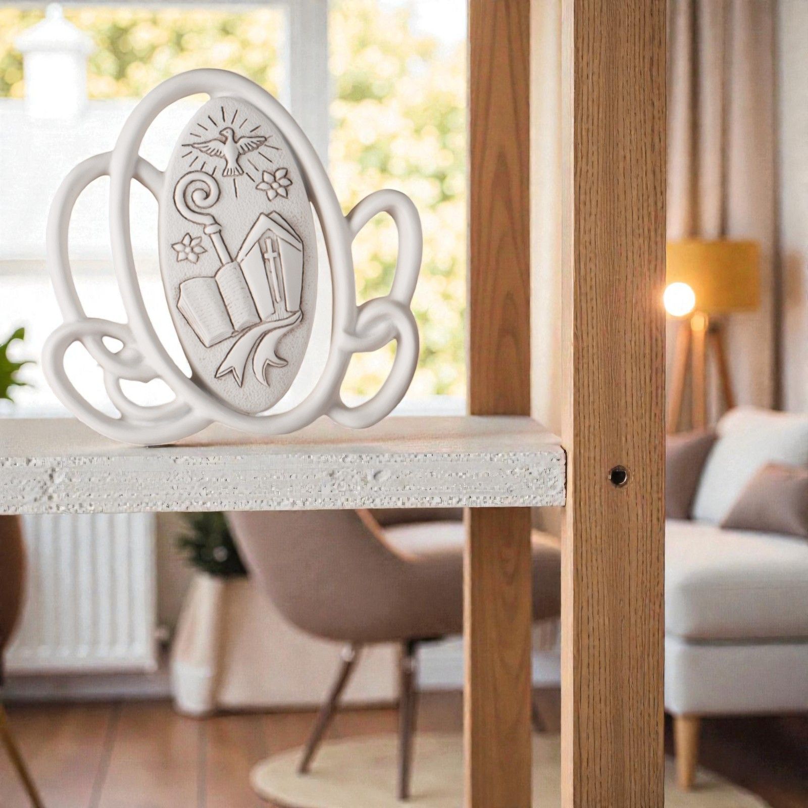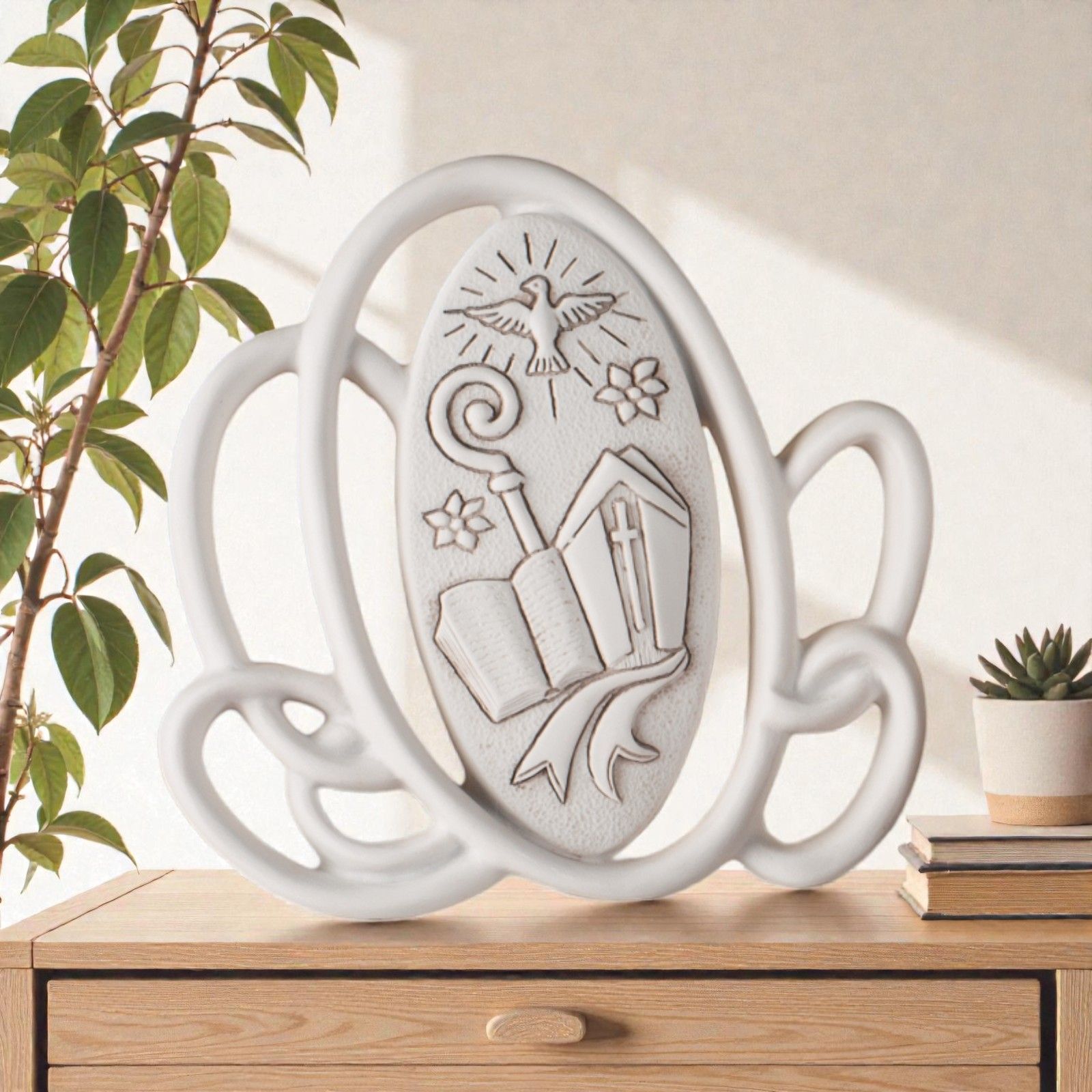 Realizzato in resina di alta qualità, il quadretto presenta un design innovativo con vari ovali che incorniciano una mitra e un bastone, esprimendo un’interpretazione contemporanea di un’icona tradizionale. Disponibile in un elegante colore bianco, si adatta perfettamente a qualsiasi stile di arredo, aggiungendo un tocco di raffinatezza alla casa del festeggiato.