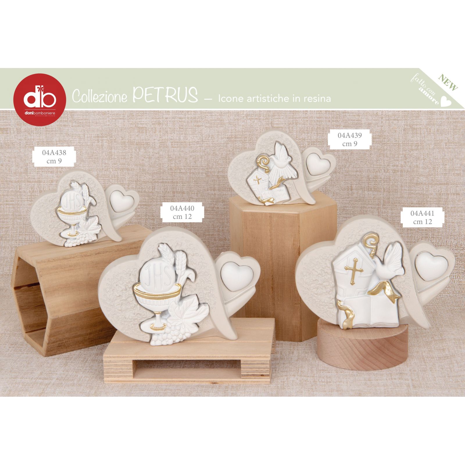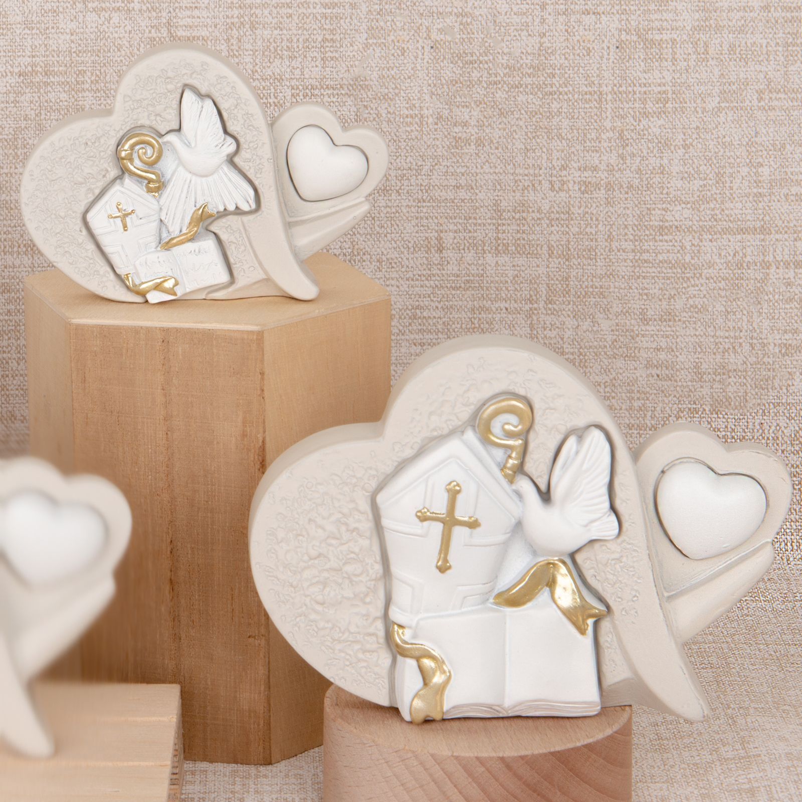 Realizzata in resina di alta qualità, disponibile in due dimensioni diverse Standard: cm. 9 circa ; Grande: cm 12 circa. per adattarsi alle esigenze. Il colore bianco e avorio con dettagli color oro conferiscono un tocco elegante e raffinato a questa bomboniera, perfetta per celebrare un momento così importante.