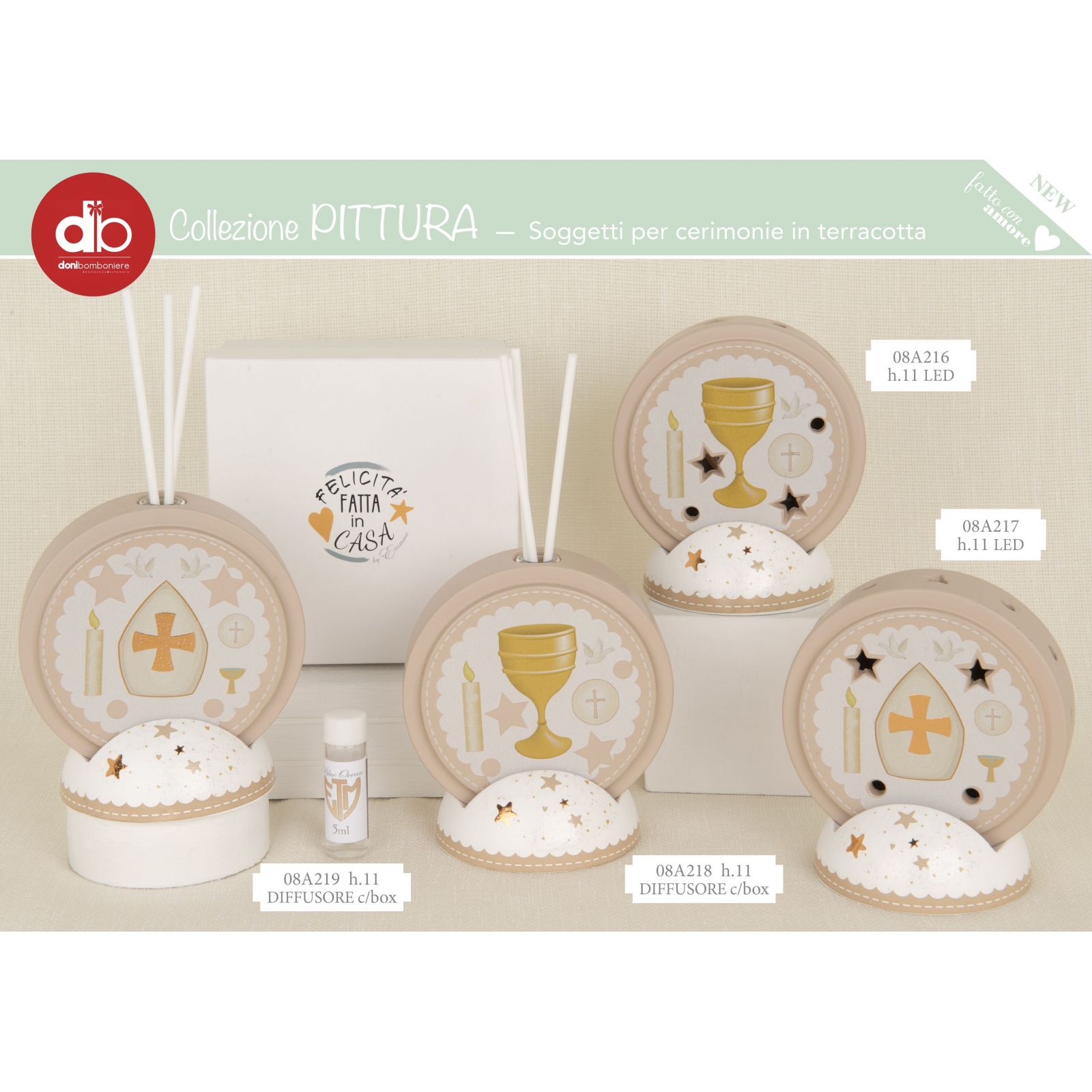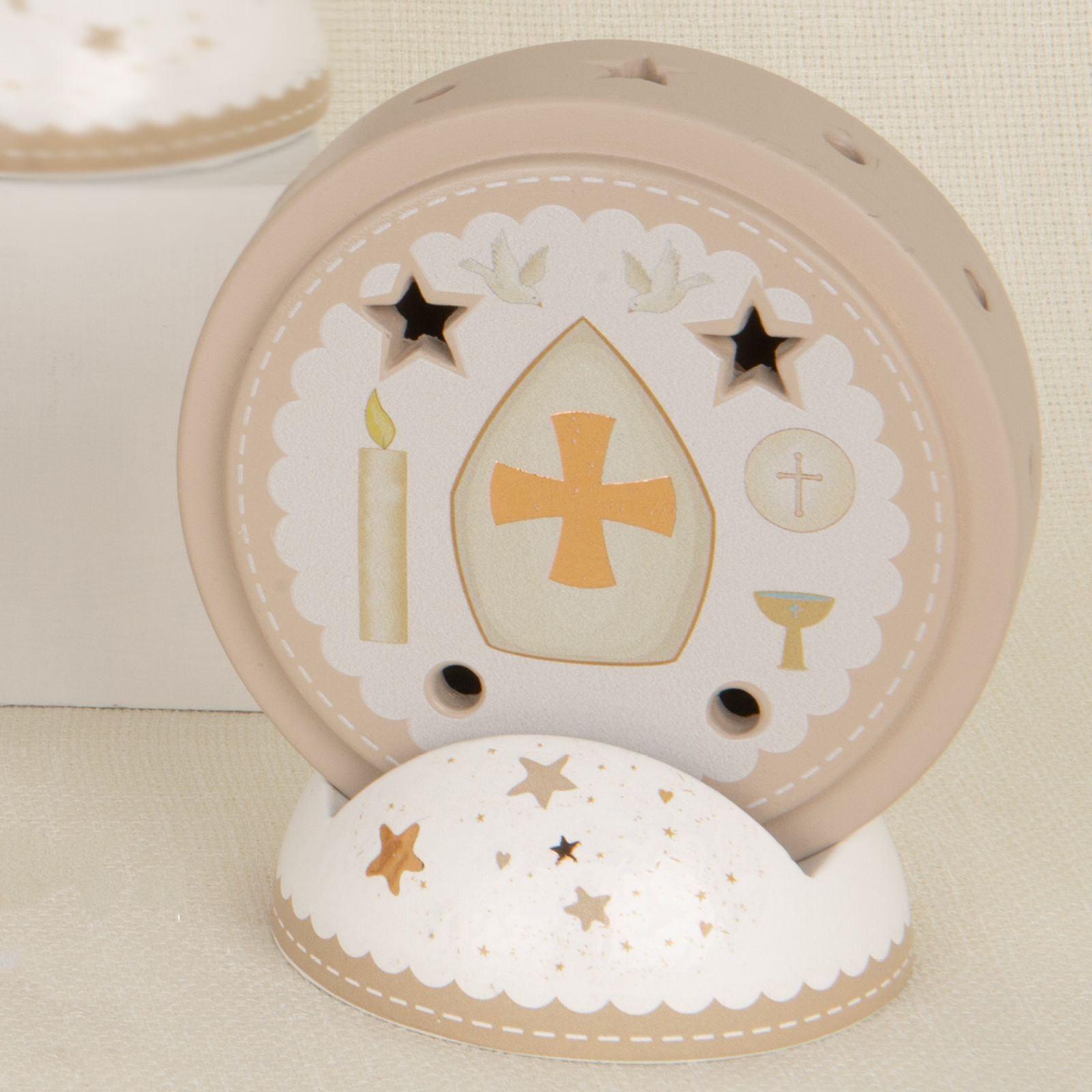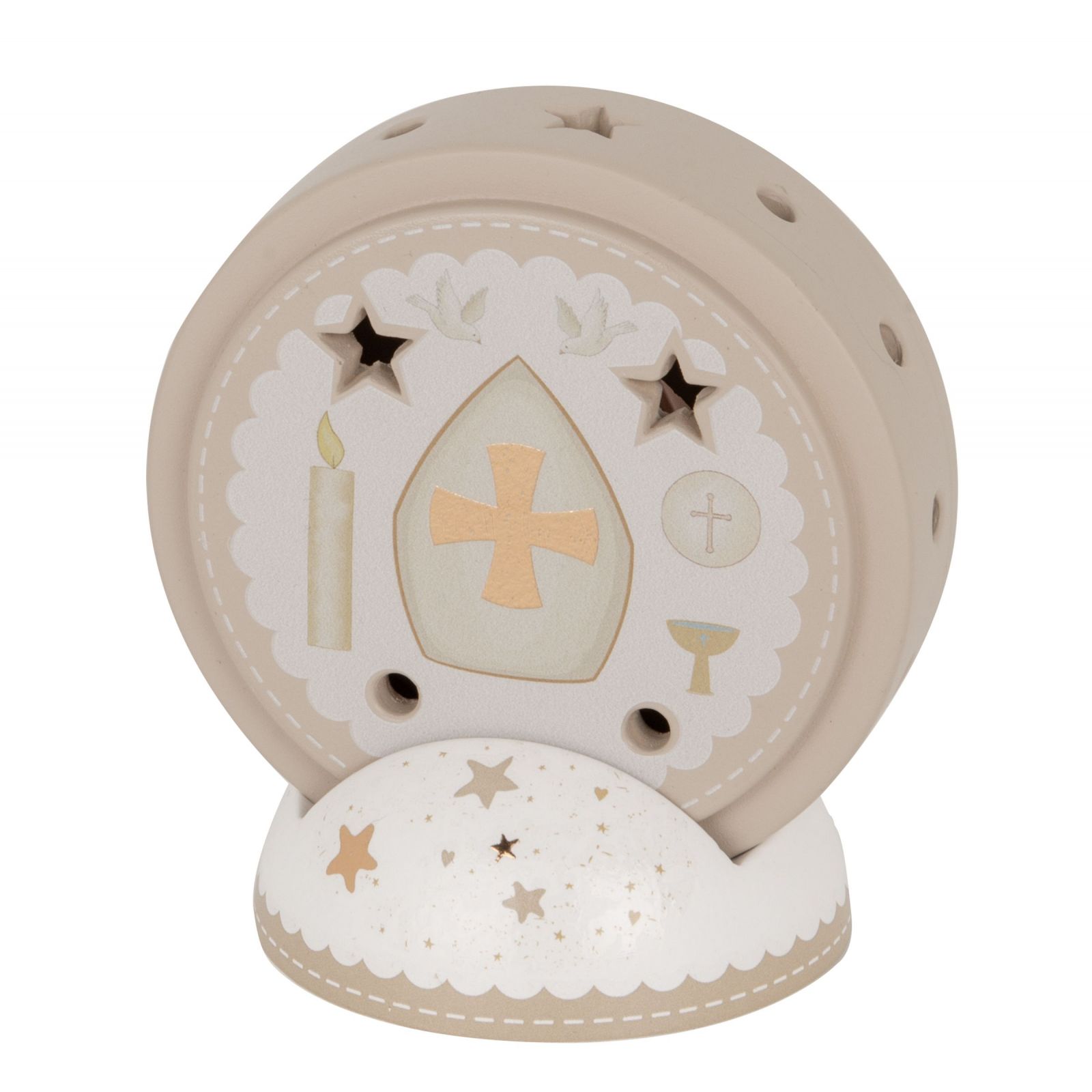 La Lampada LED a forma di cerchio con trafori e base decorata con stelline è una bomboniera originale per la cresima. Realizzata in terracotta, alta circa 11 cm, presenta simboli sacri e colori bianco e tortora, ideali per ragazzi e ragazze.