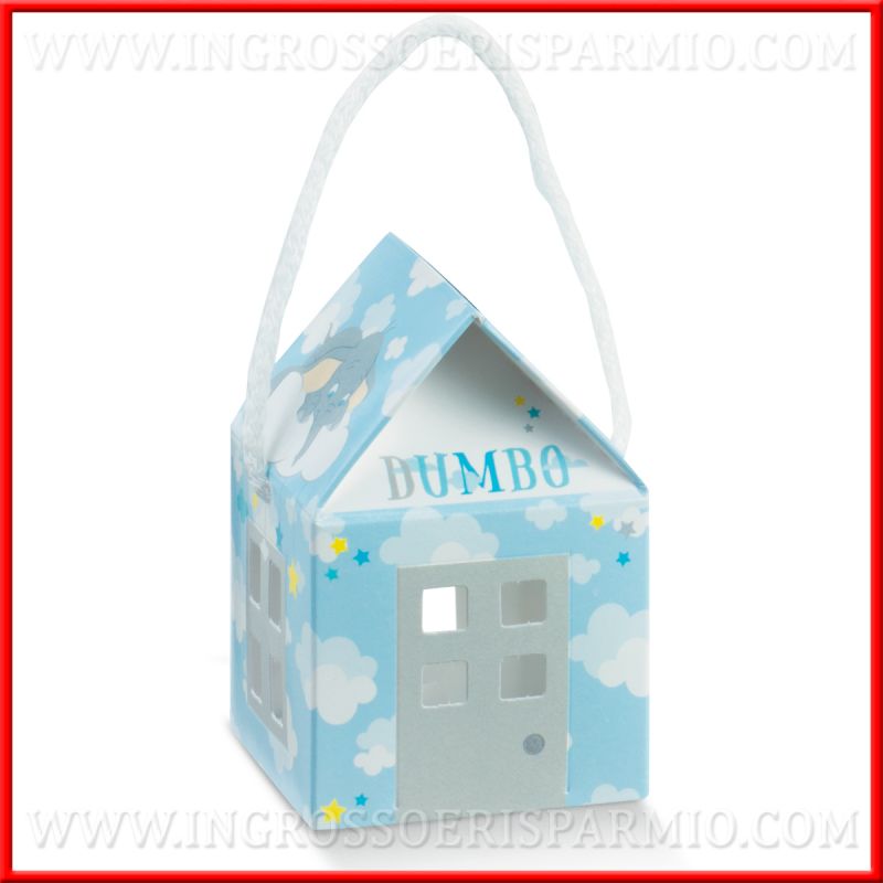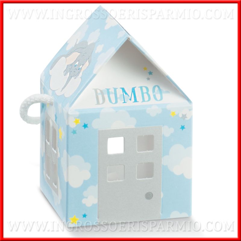 Scatolina per confetti a forma di casa, della linea Disney Baby, realizzata in cartoncino lucido di colore celeste pastello, decorata con tante piccole nuvole bianche e un cordoncino bianco. Sul tetto della casetta, è disegnato Dumbo, famoso elefantino della Disney, su di una nuvola bianca da cui pendono nuvole e stelline. Sui quattro lati della scatolina bomboniera battesimo, sono intagliate delle finestre, e sulla porta, è stampata la dicitura "Dumbo".