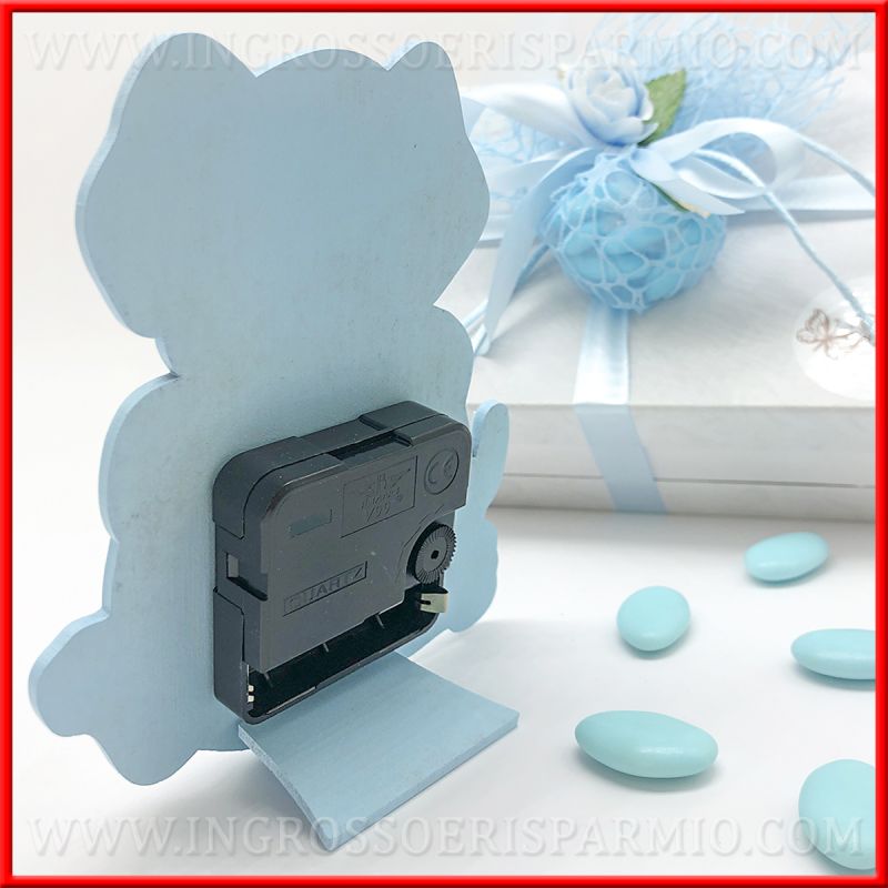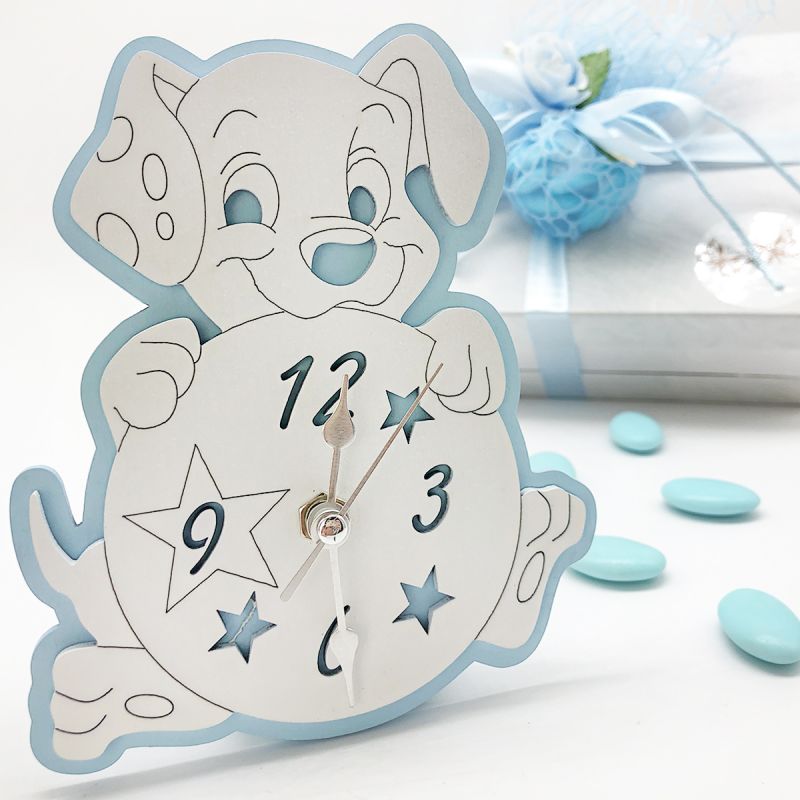 Orologi bomboniere battesimo a forma di cane in legno colorato.
